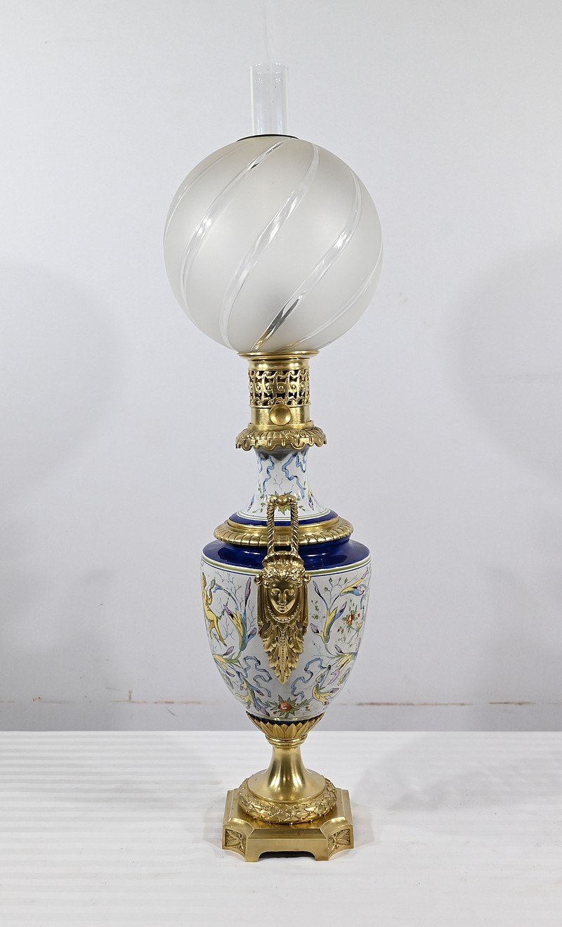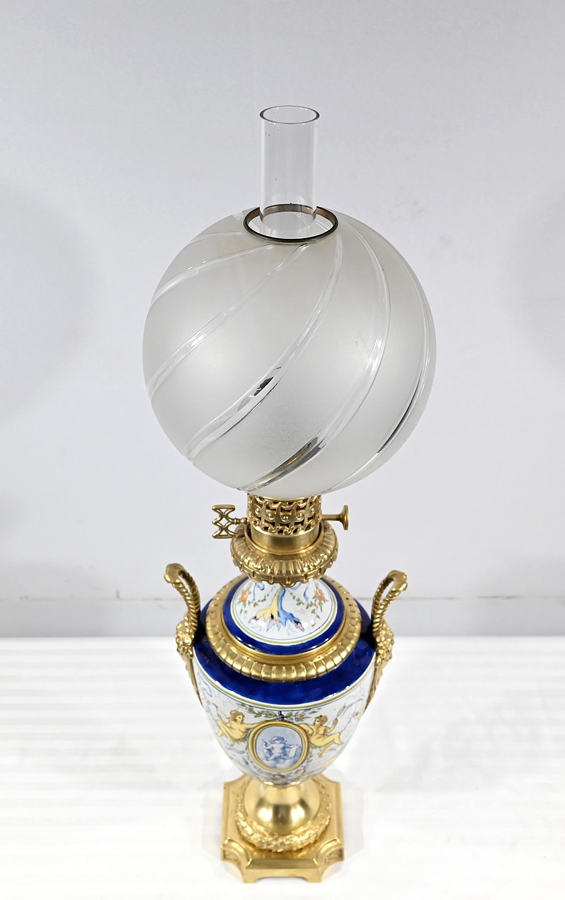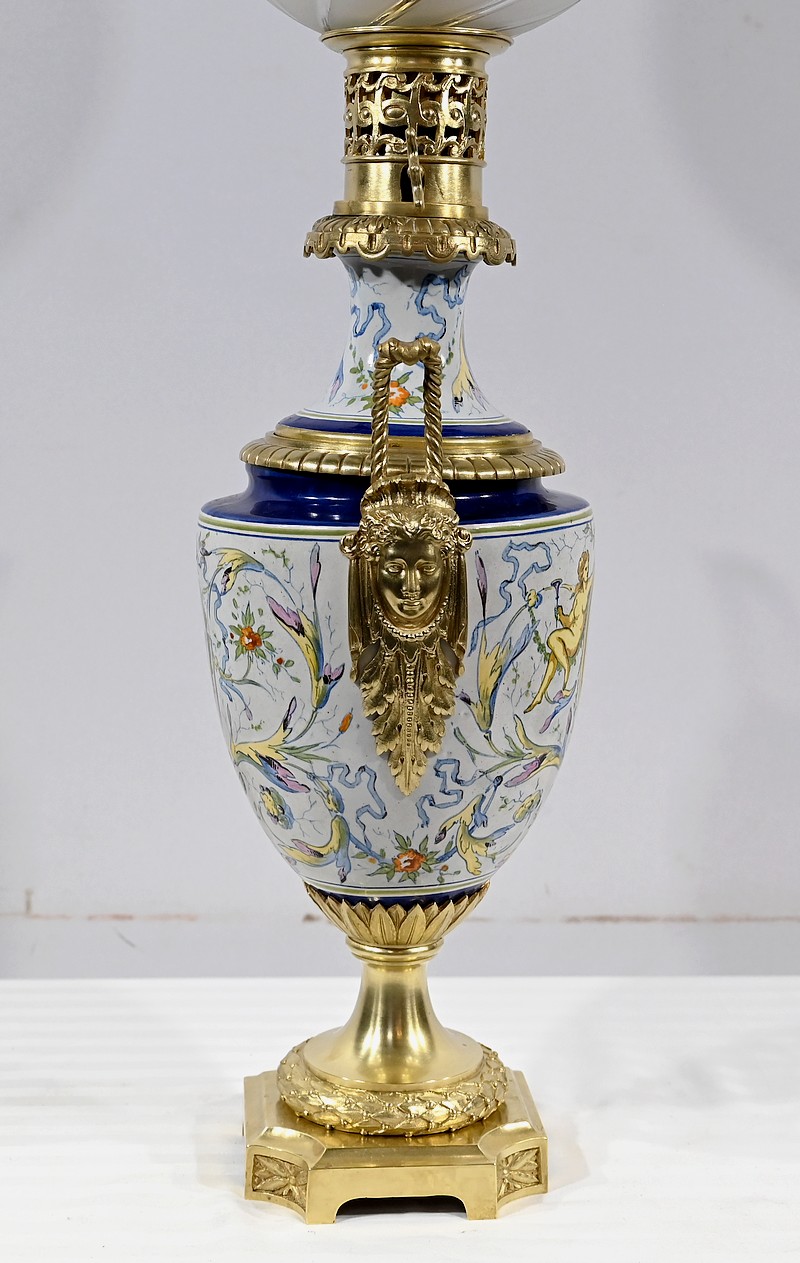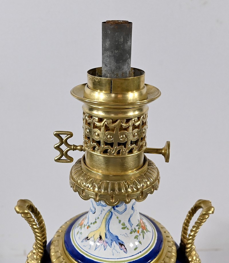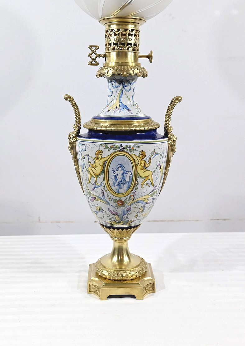 Lampe à pétrole en faïence polychrome, ornementée de bronze et munie d’un globe gravé de sillons courbes.