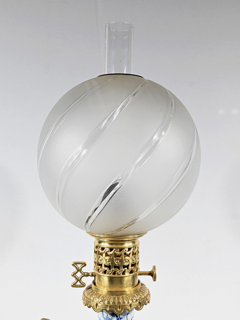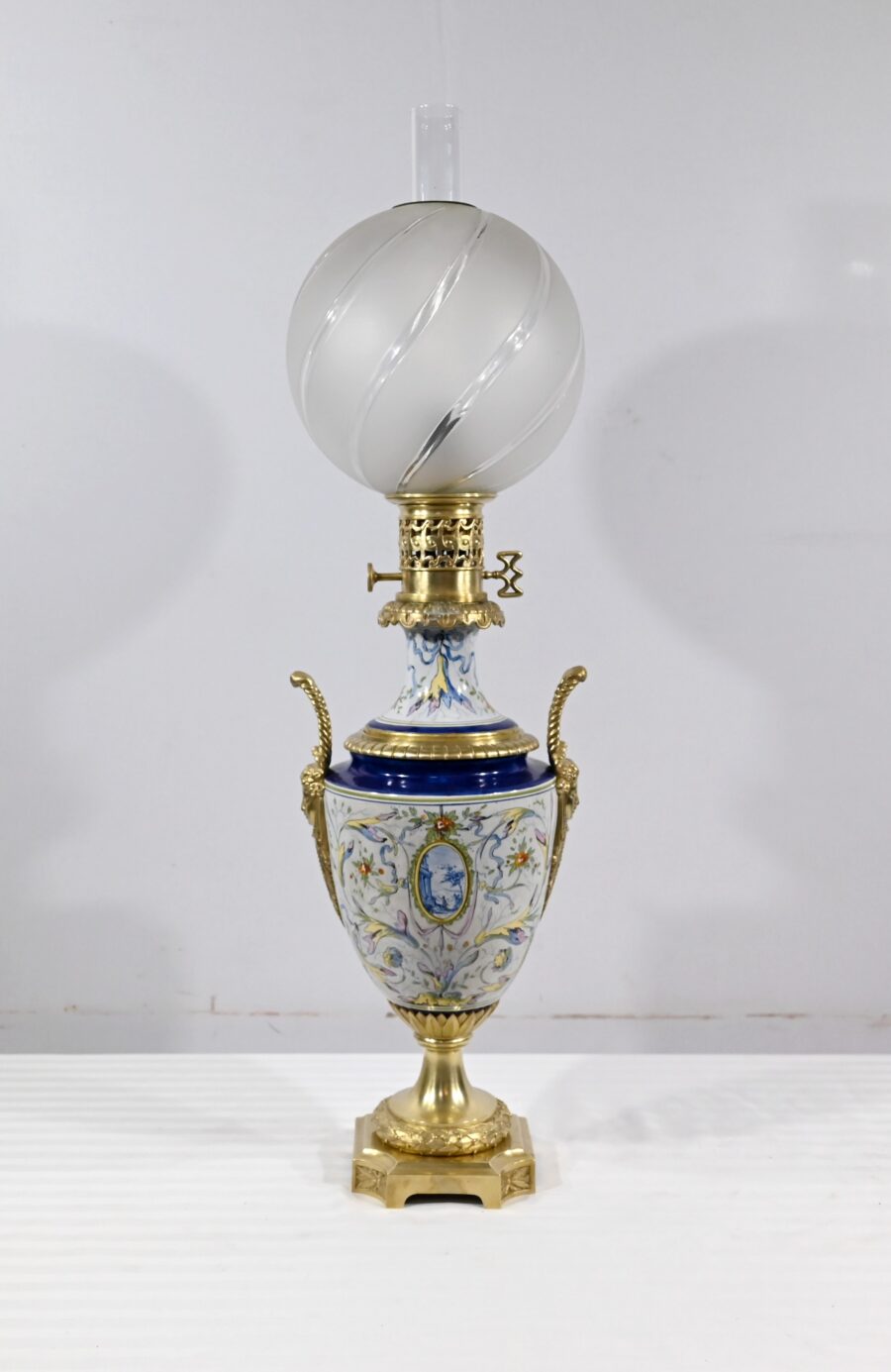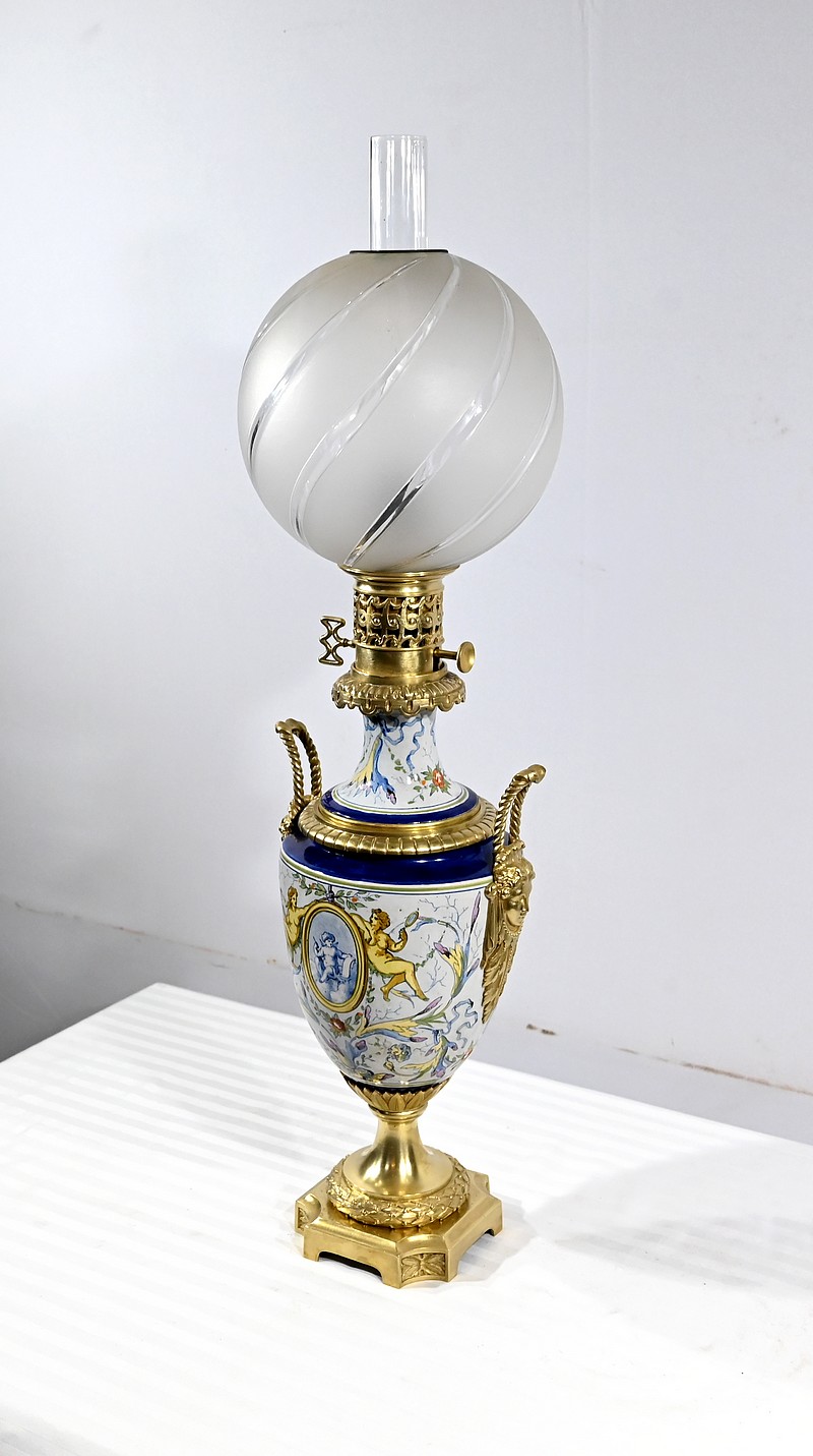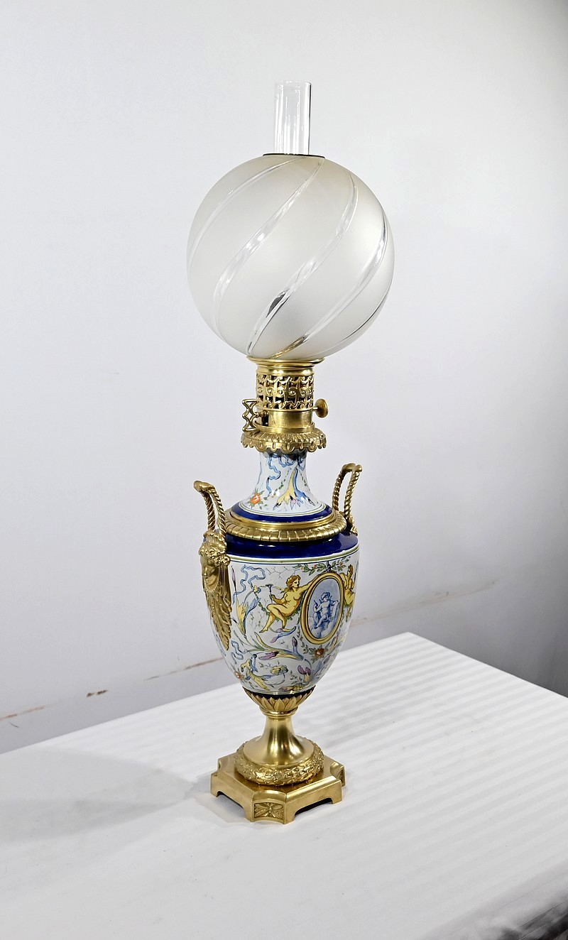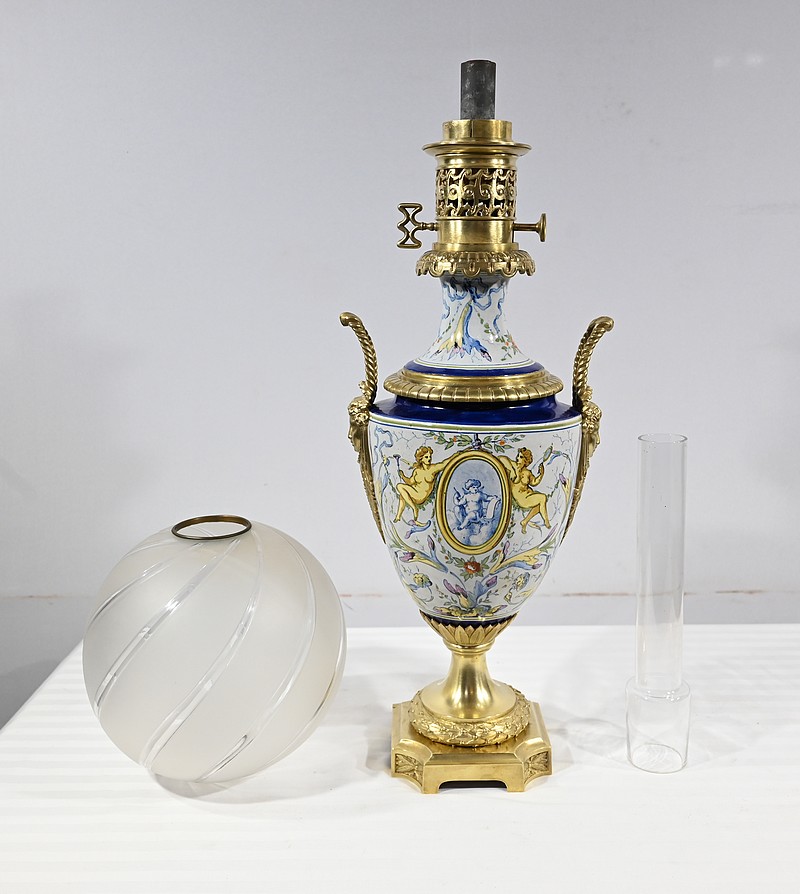 Lampe à pétrole en faïence polychrome, ornementée de bronze et munie d’un globe gravé de sillons courbes.