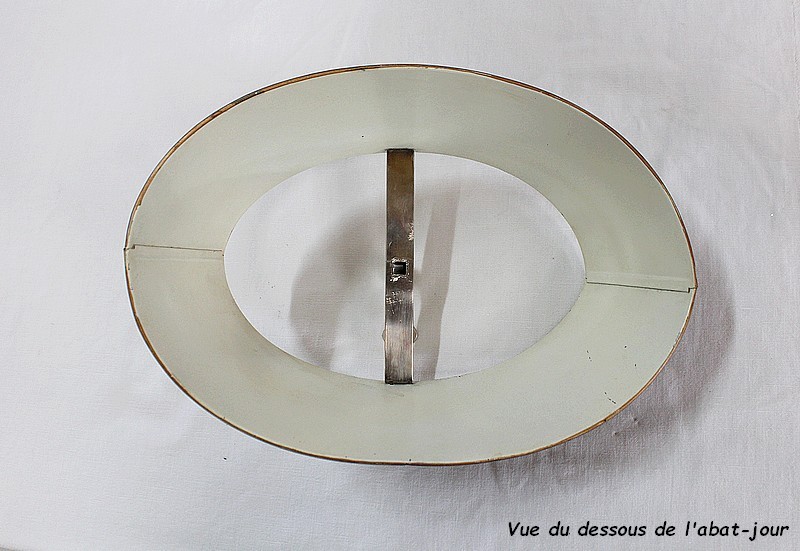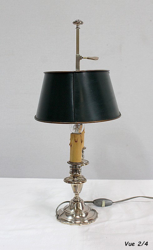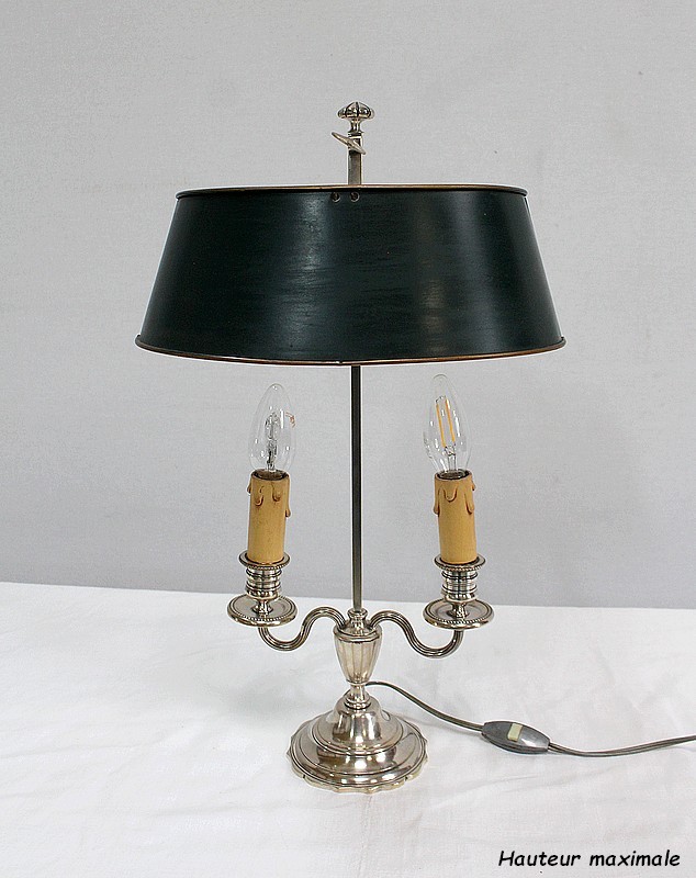 Lampe bouillotte en métal argenté coiffée d’un abat-jour métallique, ovalisé, de couleur vert empire.