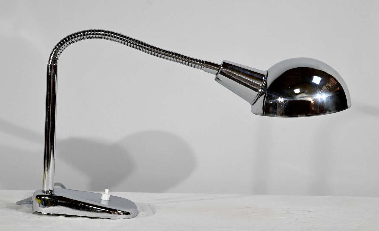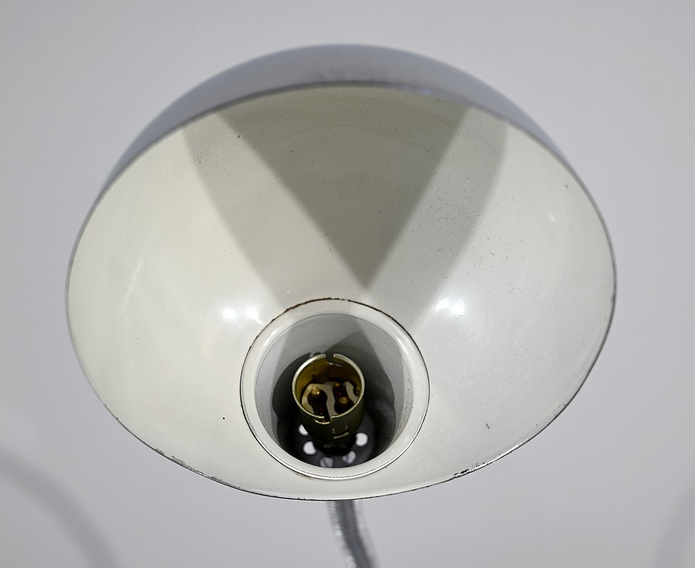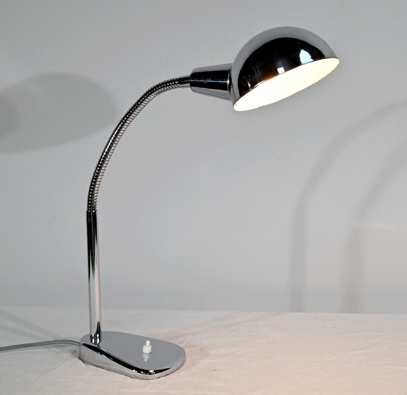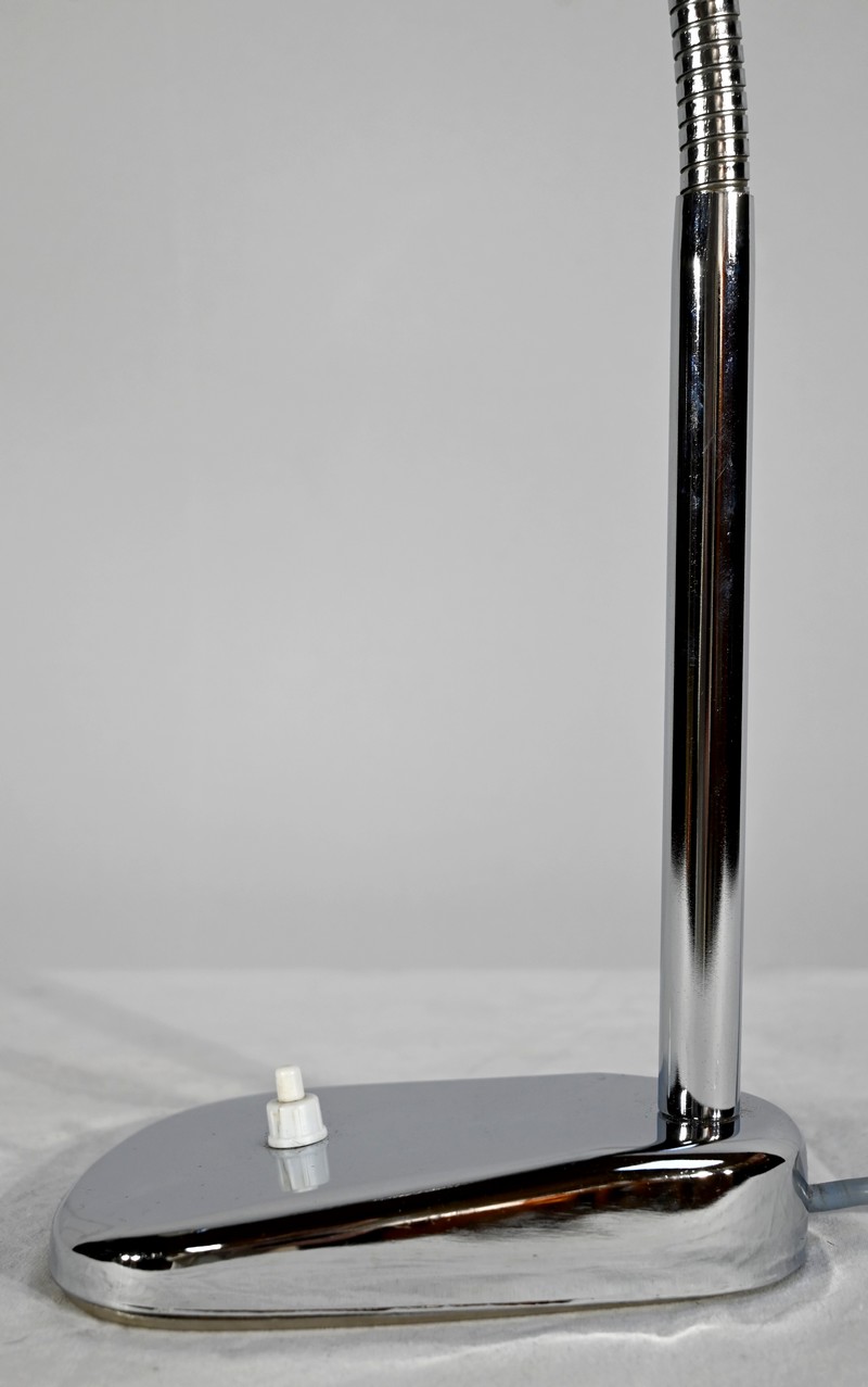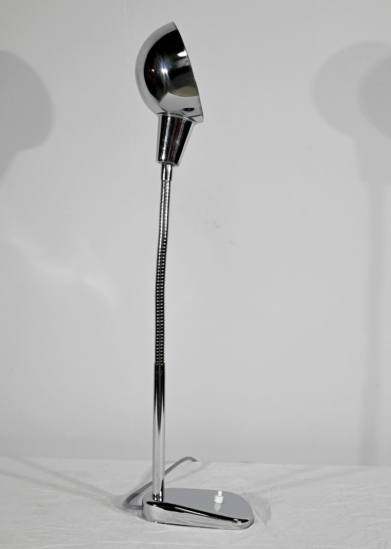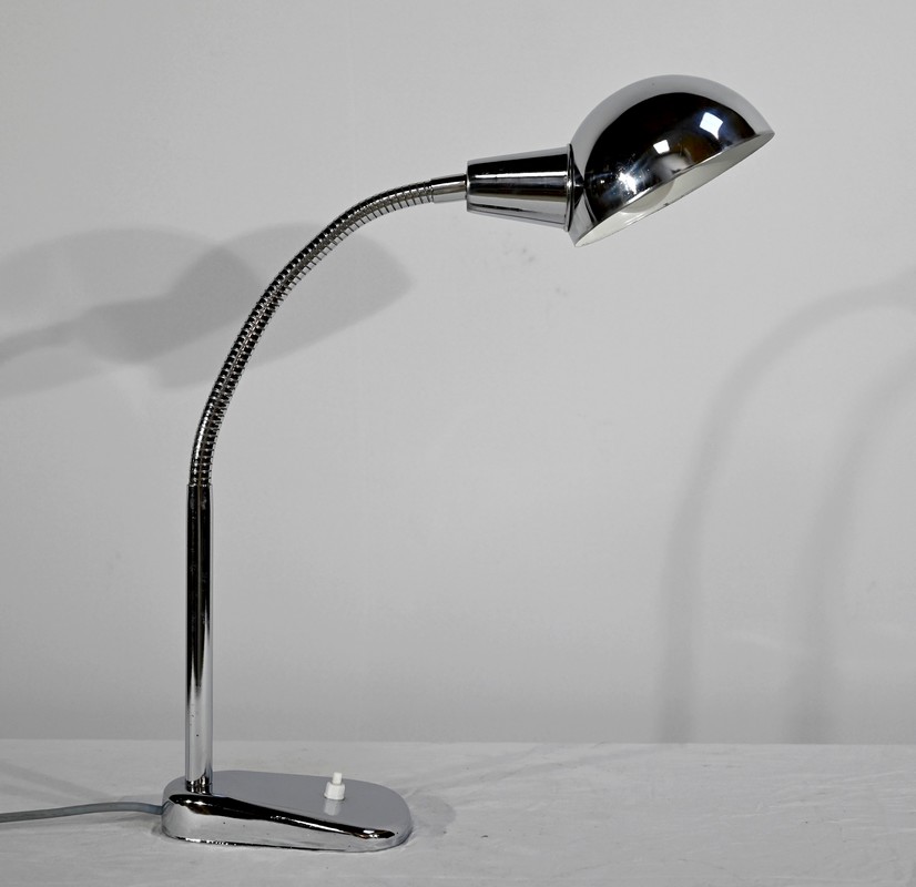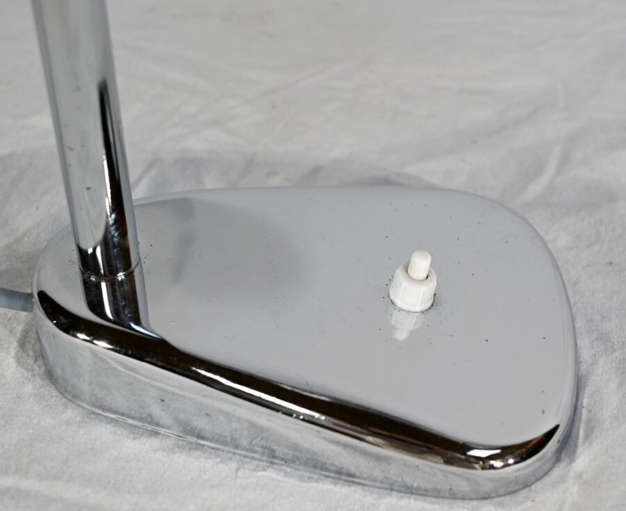 Lampe de bureau industriel en métal chromé. Elle présente un bras articulé et flexible. Le socle est muni d’un interrupteur unipolaire à bouton-poussoir de couleur blanche. L’abat-jour, de forme ronde, comporte un revêtement intérieur blanc afin de favoriser la diffusion de la lumière.