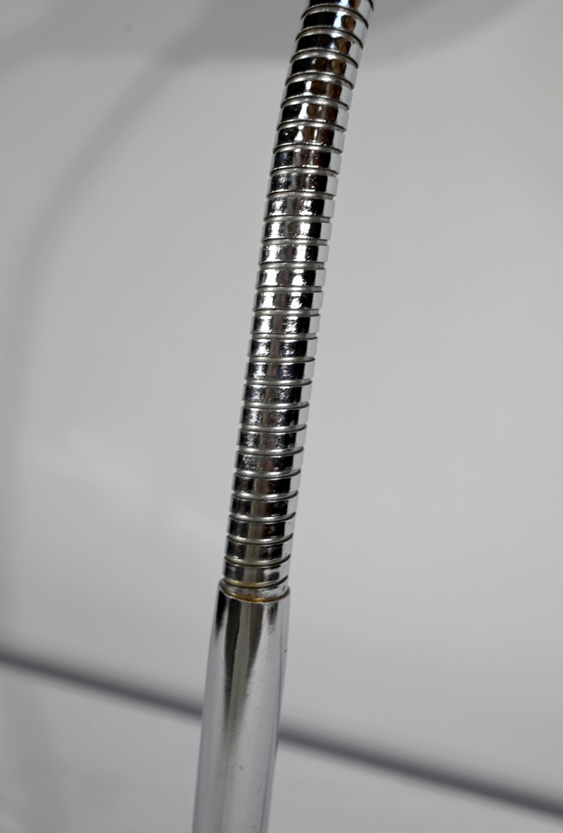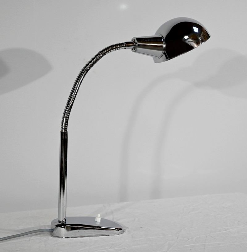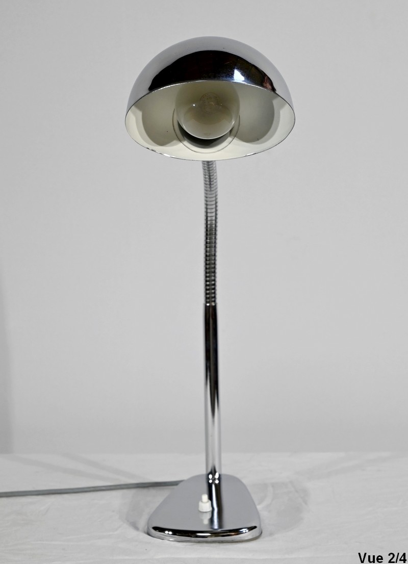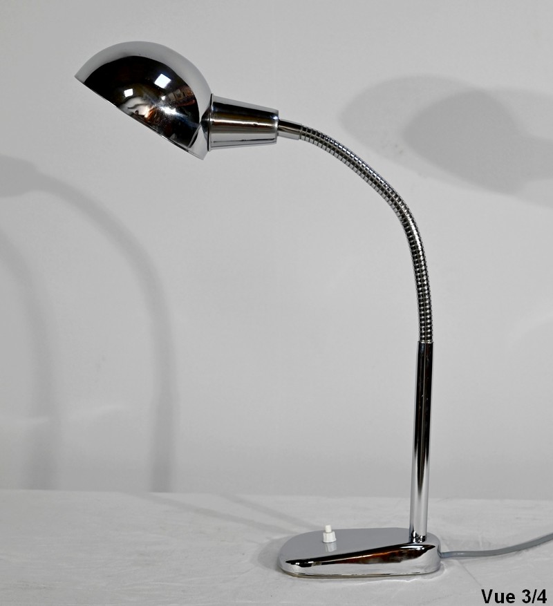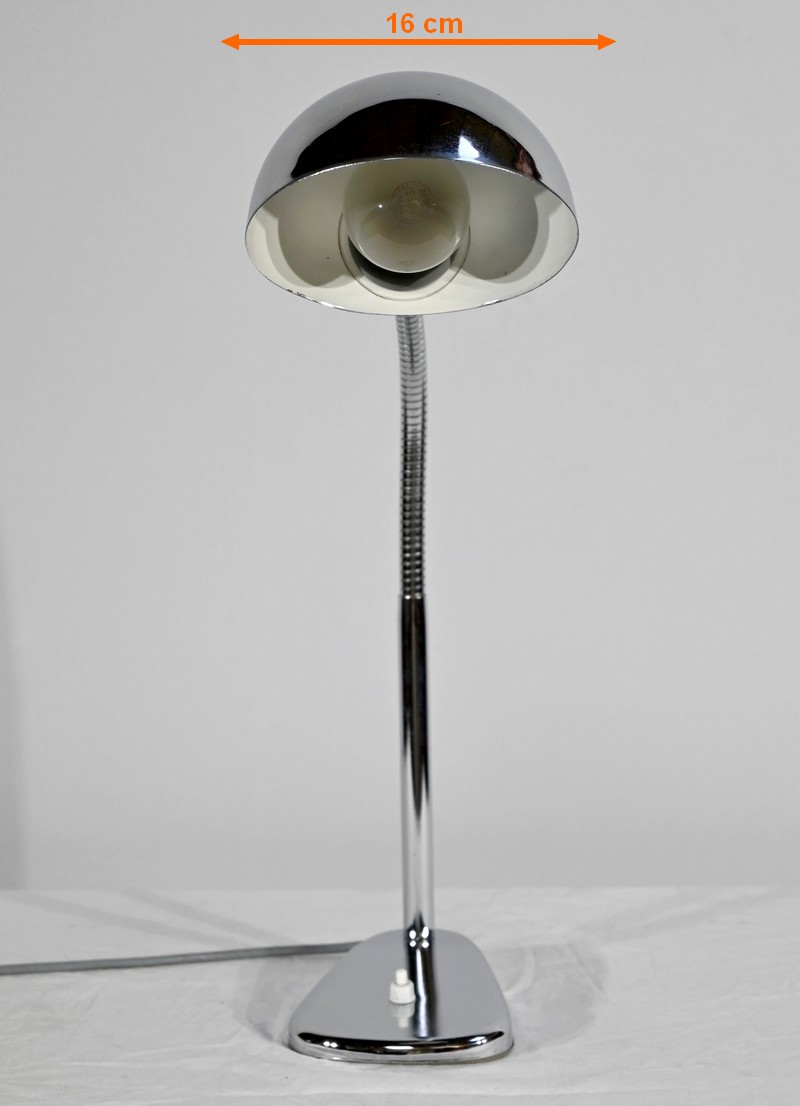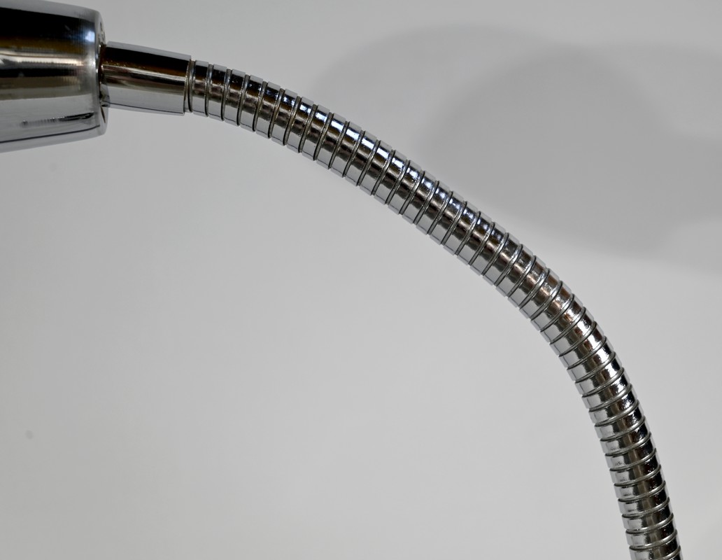 Lampe de bureau industriel en métal chromé. Elle présente un bras articulé et flexible. Le socle est muni d’un interrupteur unipolaire à bouton-poussoir de couleur blanche. L’abat-jour, de forme ronde, comporte un revêtement intérieur blanc afin de favoriser la diffusion de la lumière.