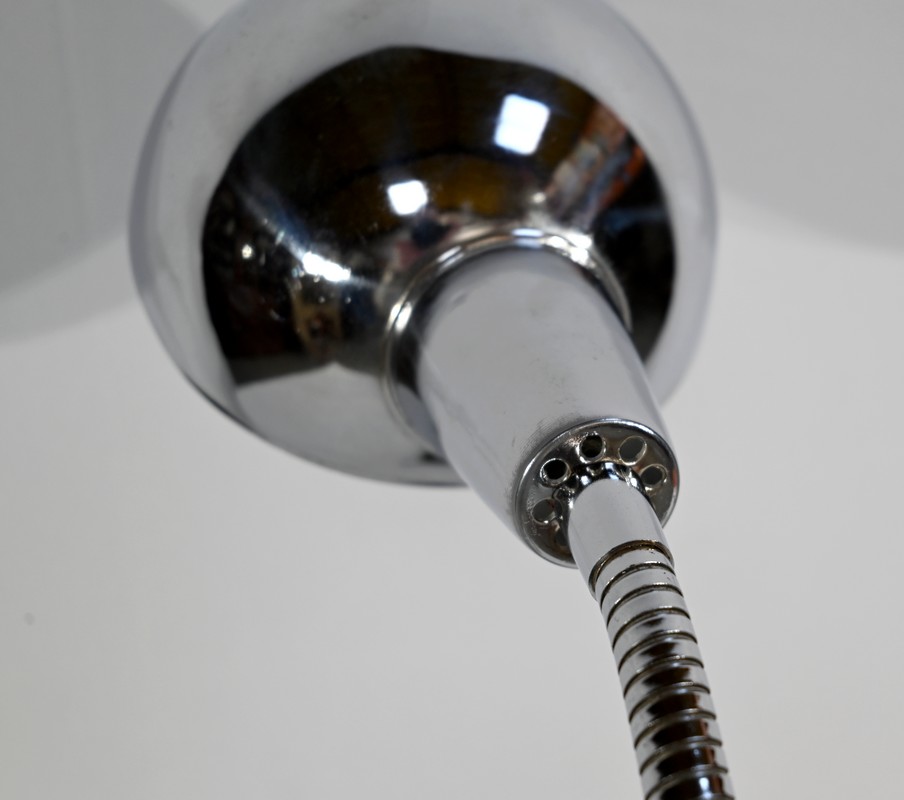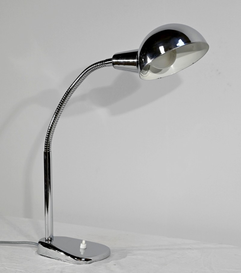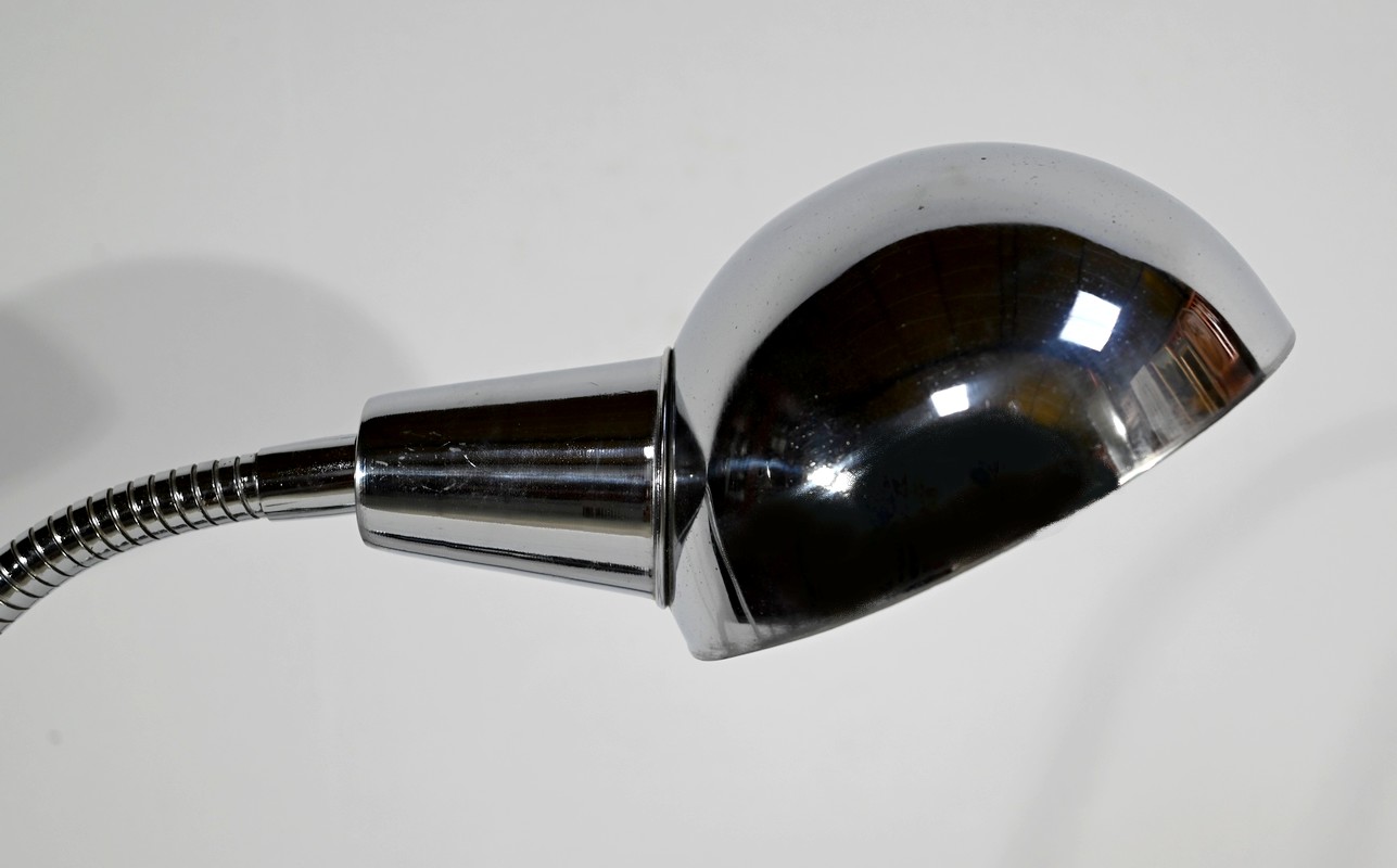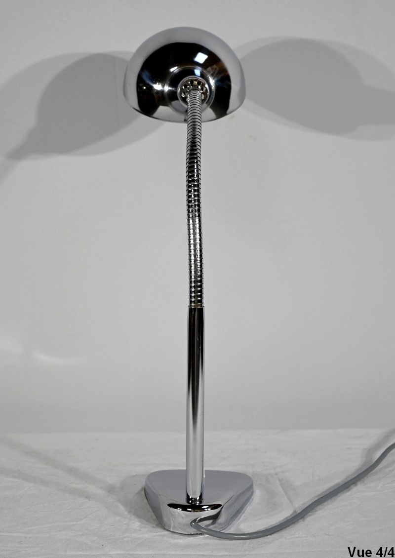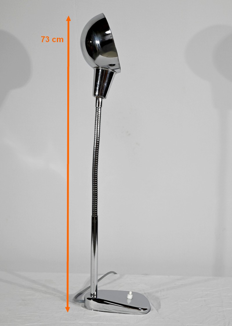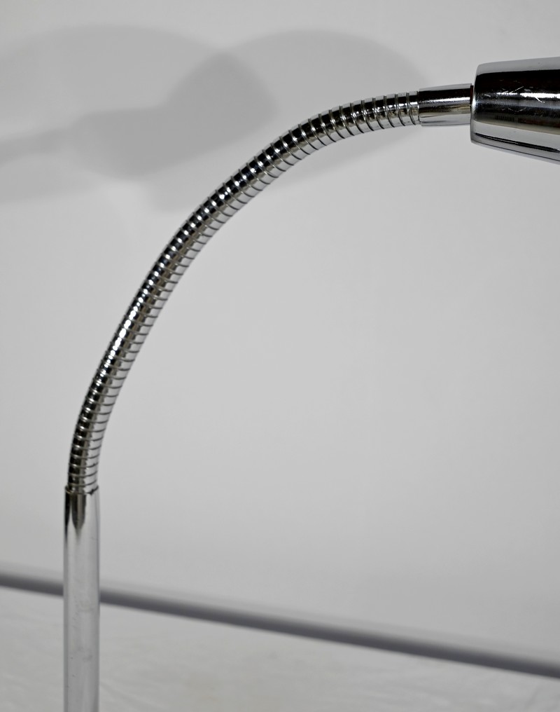 Lampe de bureau industriel en métal chromé. Elle présente un bras articulé et flexible. Le socle est muni d’un interrupteur unipolaire à bouton-poussoir de couleur blanche. L’abat-jour, de forme ronde, comporte un revêtement intérieur blanc afin de favoriser la diffusion de la lumière.