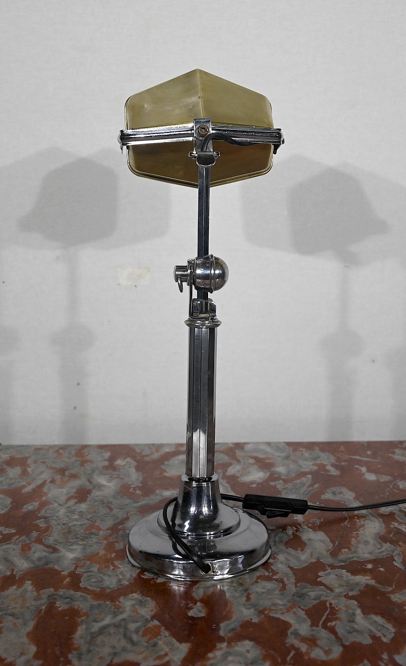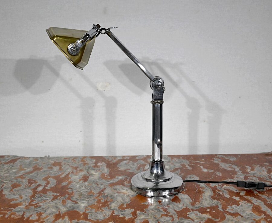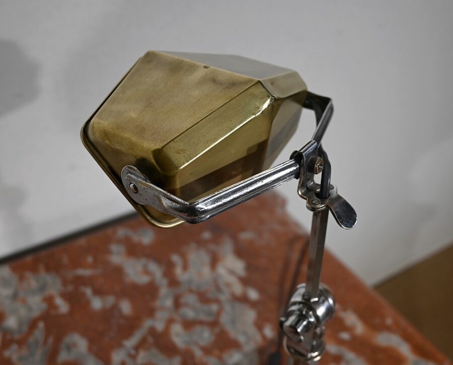 Il s’agit d’une lampe électrique portative à lumière orientable en tous sens et à hauteur de feu réglable. Une de ses caractéristiques est son abat-jour à facettes, de forme typiquement art déco, ainsi que l’articulation qui permet de rétracter son bras dans la colonne, révolution pour l’époque.
