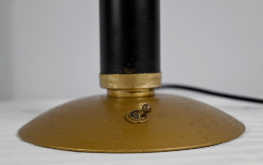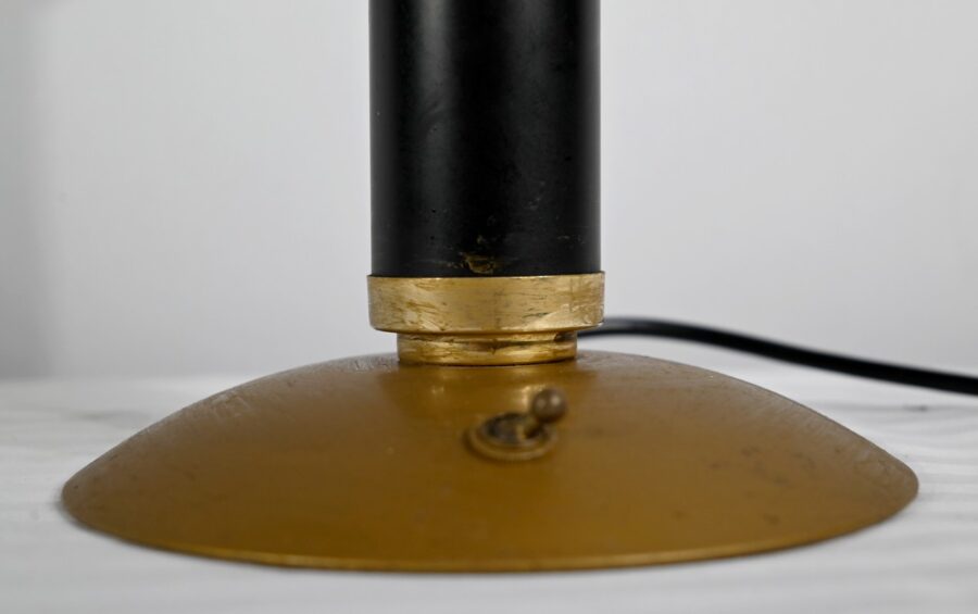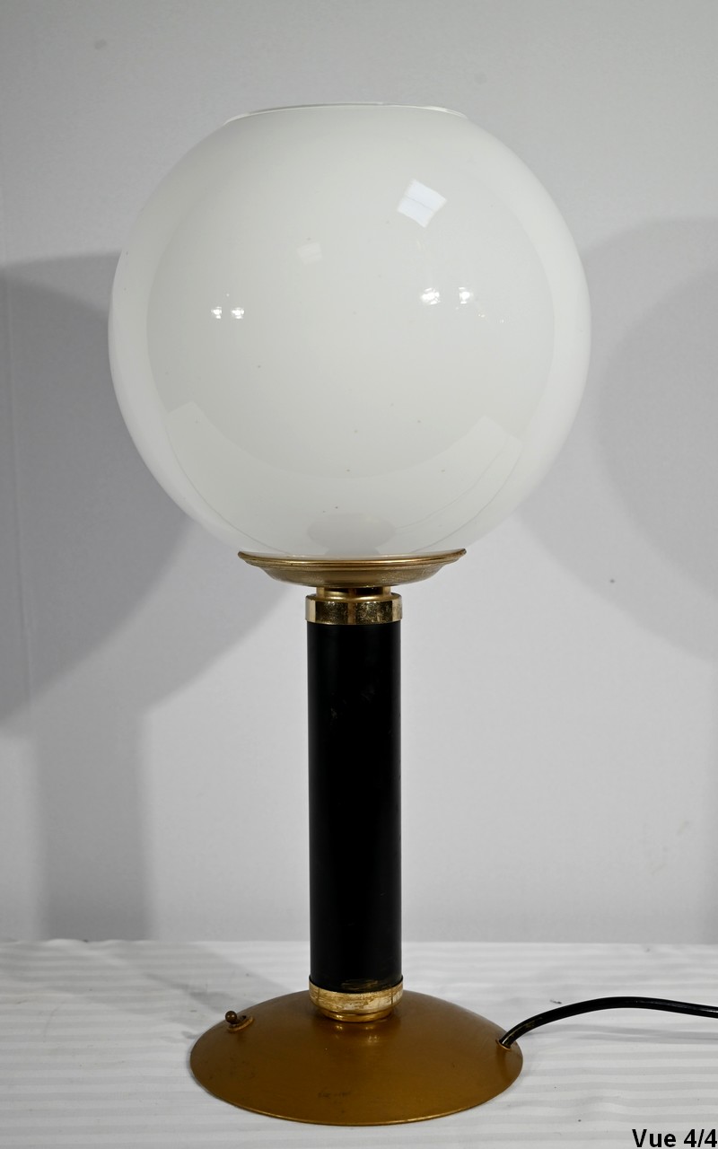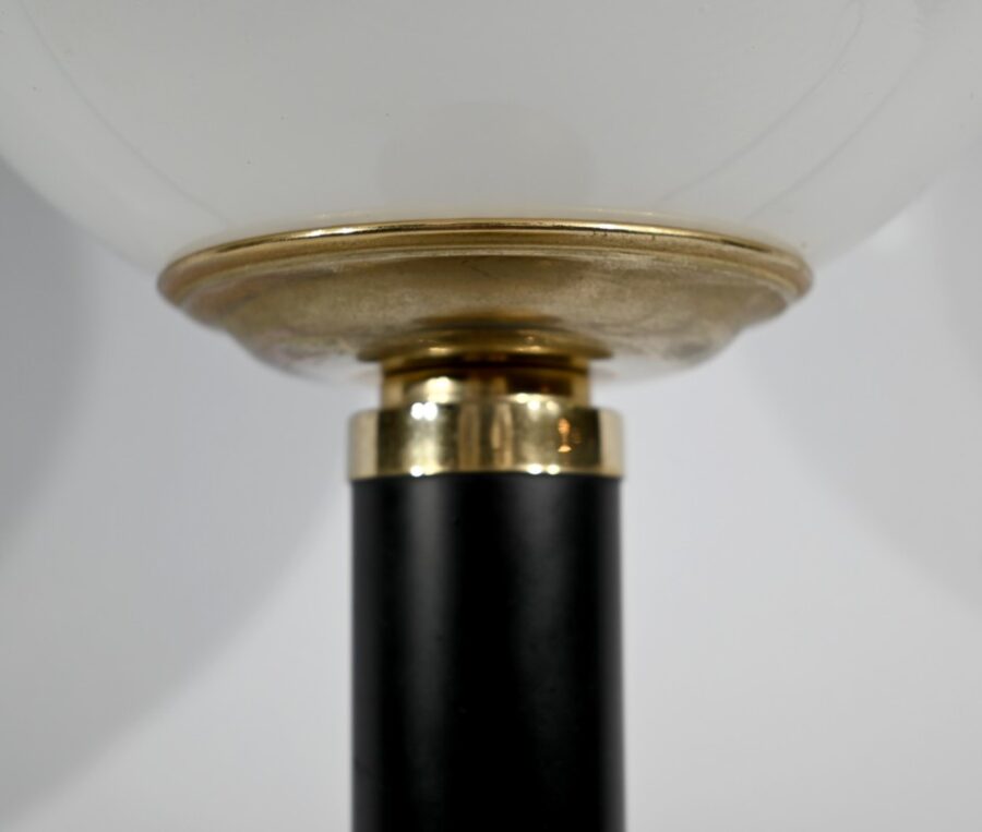 Cette lampe est sommée d’un important globe en verre opale souligné par une collerette en laiton.