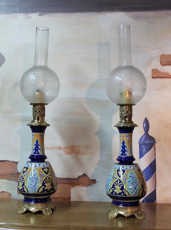 Paire de lampes à fûts ’bouteille’ en faïence à décor de feuillage en panneaux camaïeu de jaune et bleu. Les socles sont en bronze. Les verres cylindriques et les globes ont été changés. Il manque une clé.