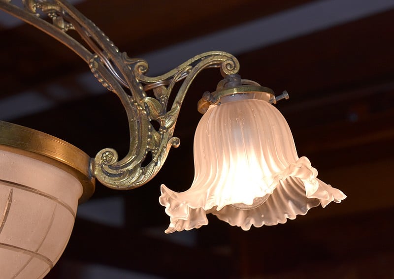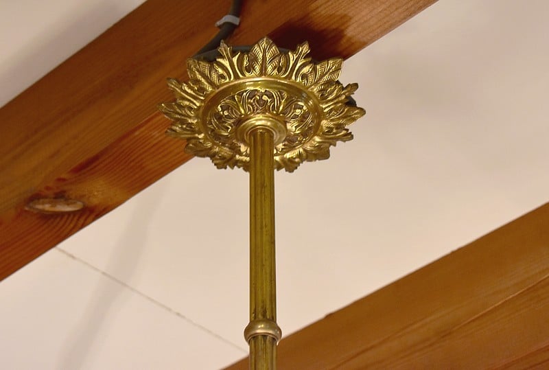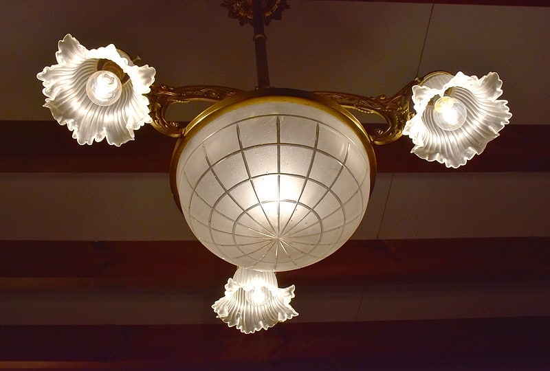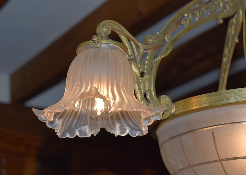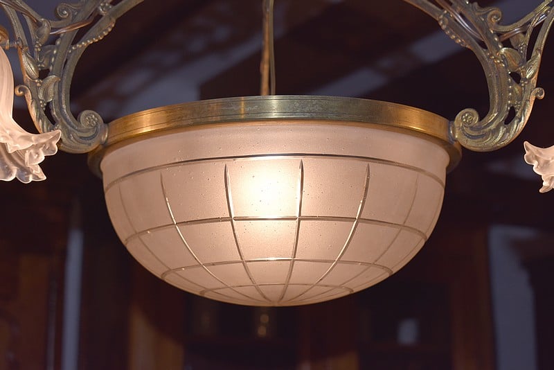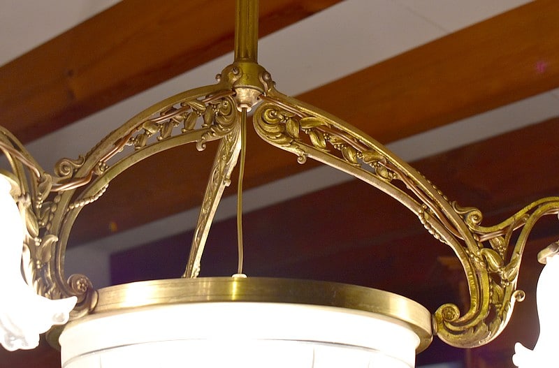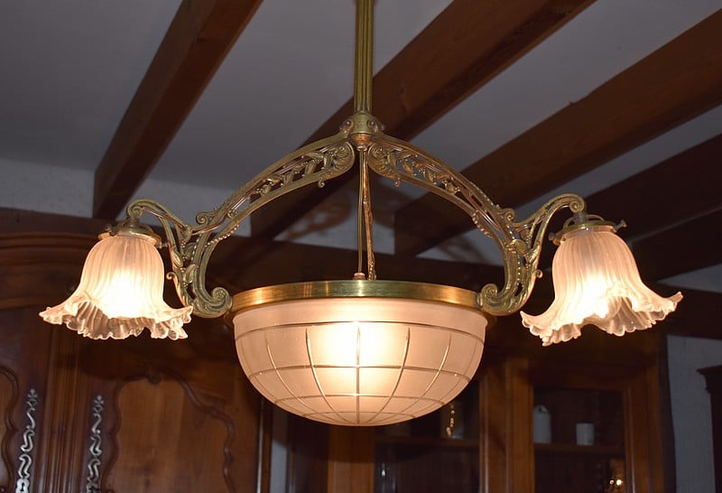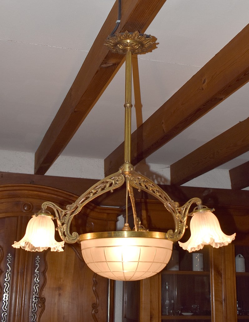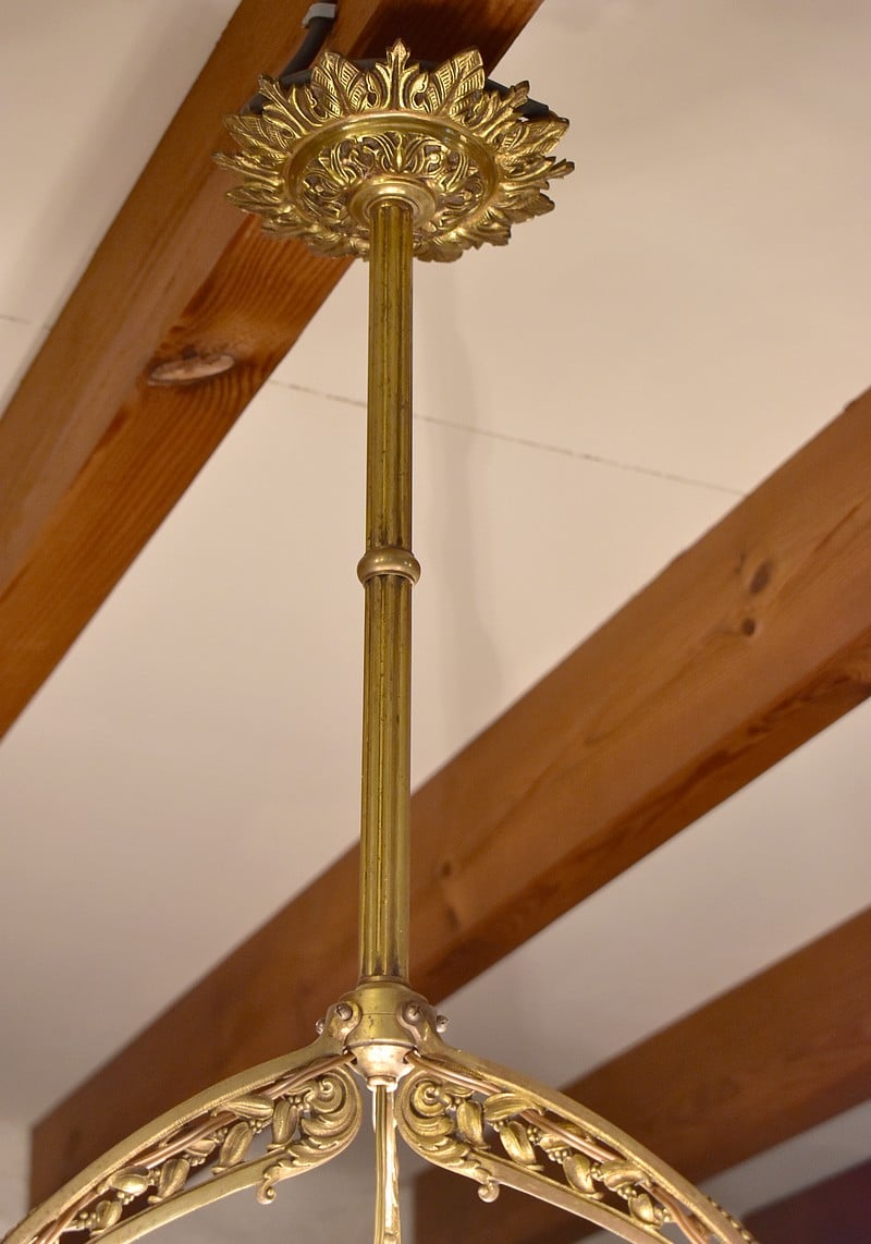 Lustre à 3 bras de lumières en plus d’une source centrale, en laiton.