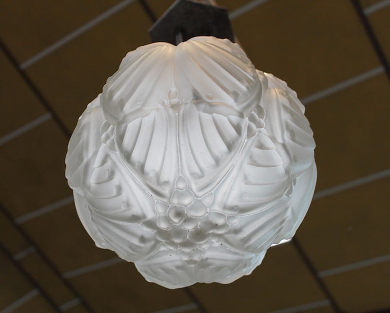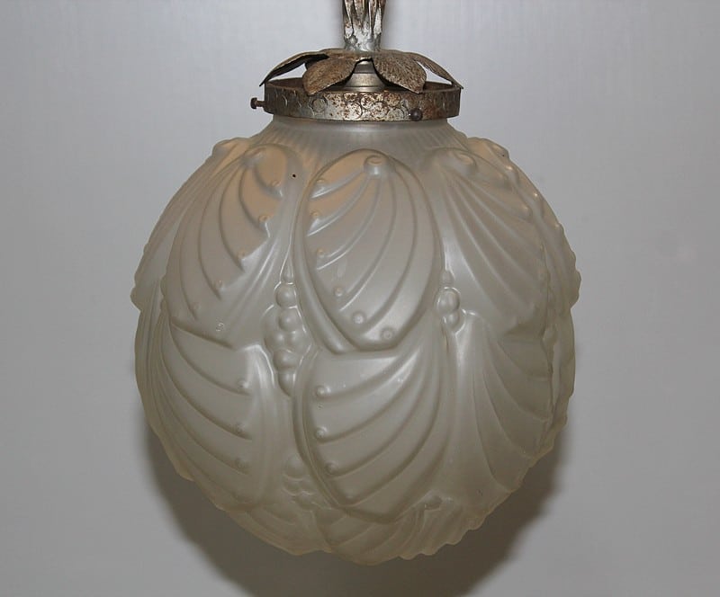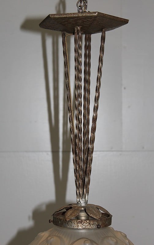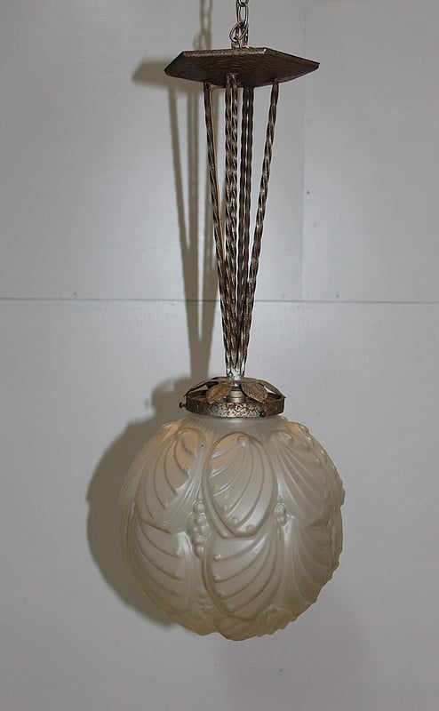 Lustre Art-Déco, tiges en fer forgé et boule en verre dépoli décoré.