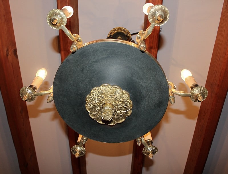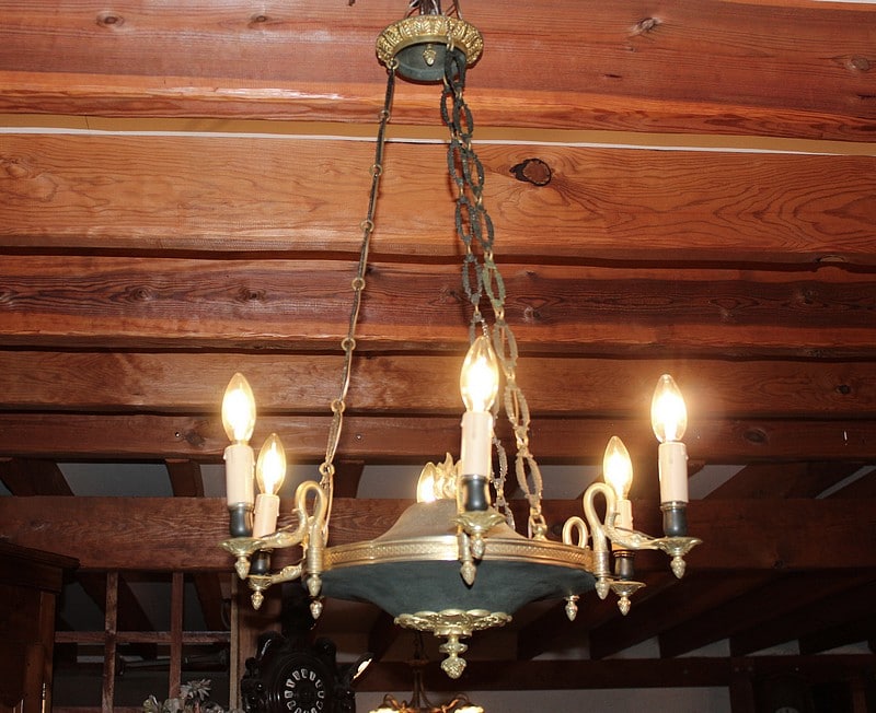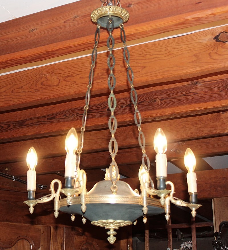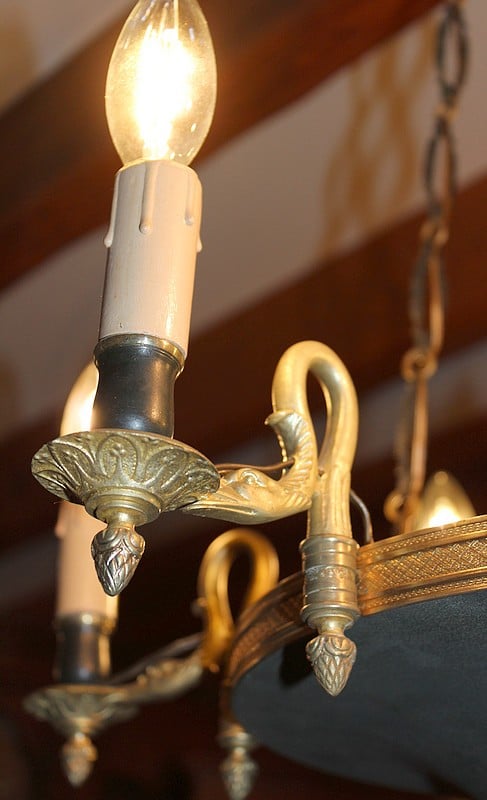 Lustre en bronze et tôle peinte de couleur grise, de style Empire/Restauration, éclairant à 6 bras de lumière en forme de col de cygne.
