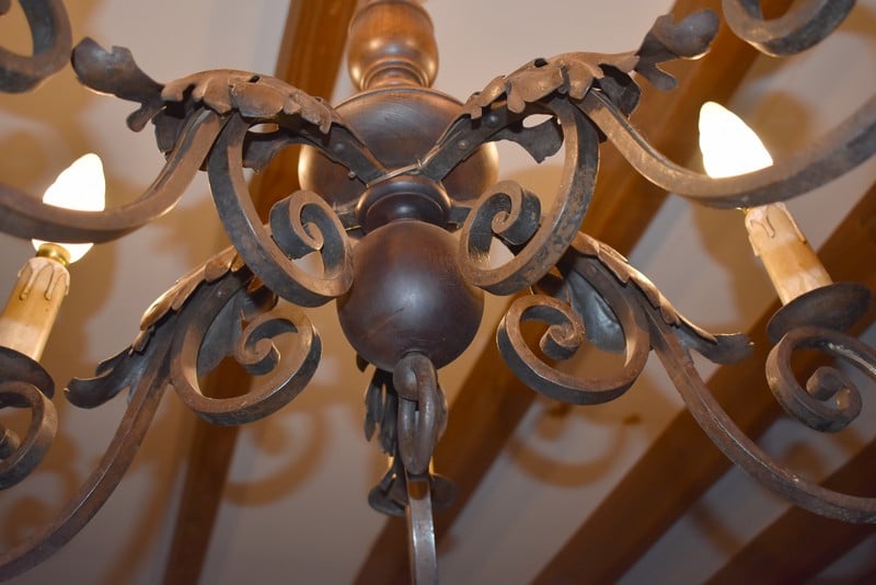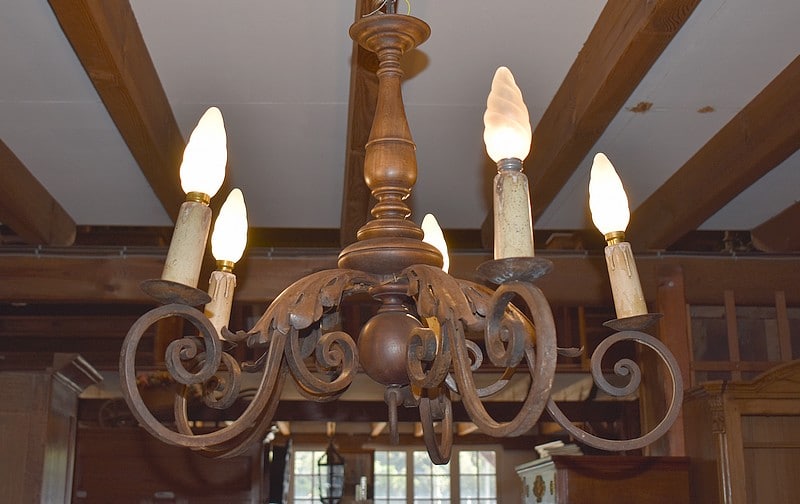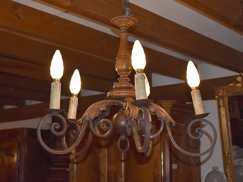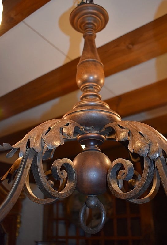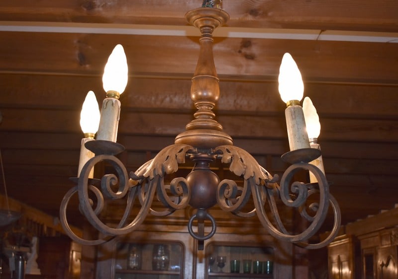 Lustre en bois et fer forgé à 5 bras de lumière.