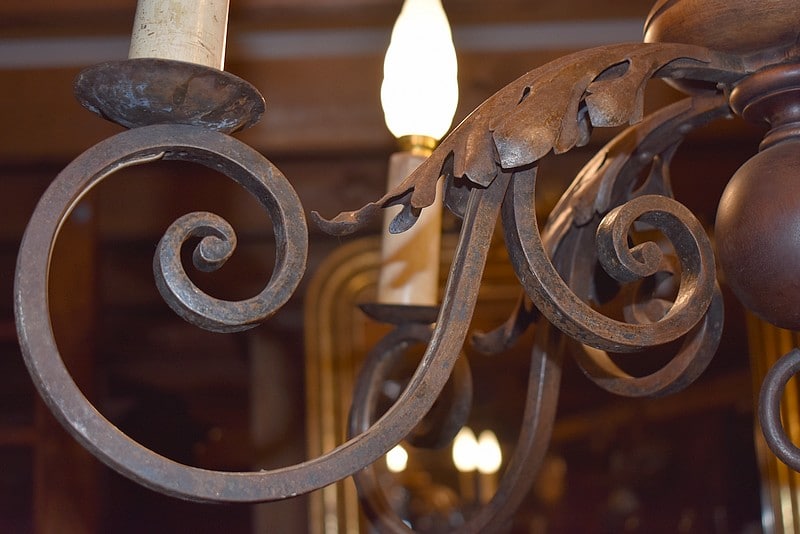 Le fût est en bois tourné, terminé par un anneau de fer. Les bras, en fer, sont forgés en forme de volutes. Leur partie haute est recouverte d’un décor de feuilles d’acanthe.