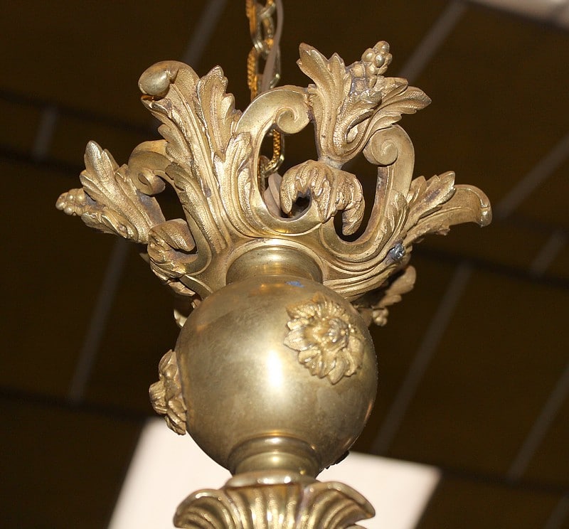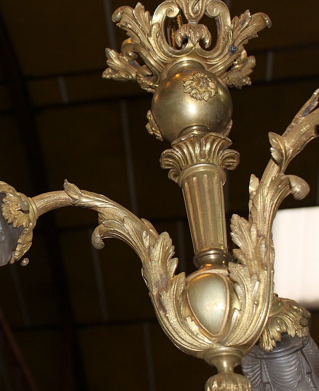 Lustre en bronze à trois bras de lumière avec tulipes d’origine en verre dépoli.