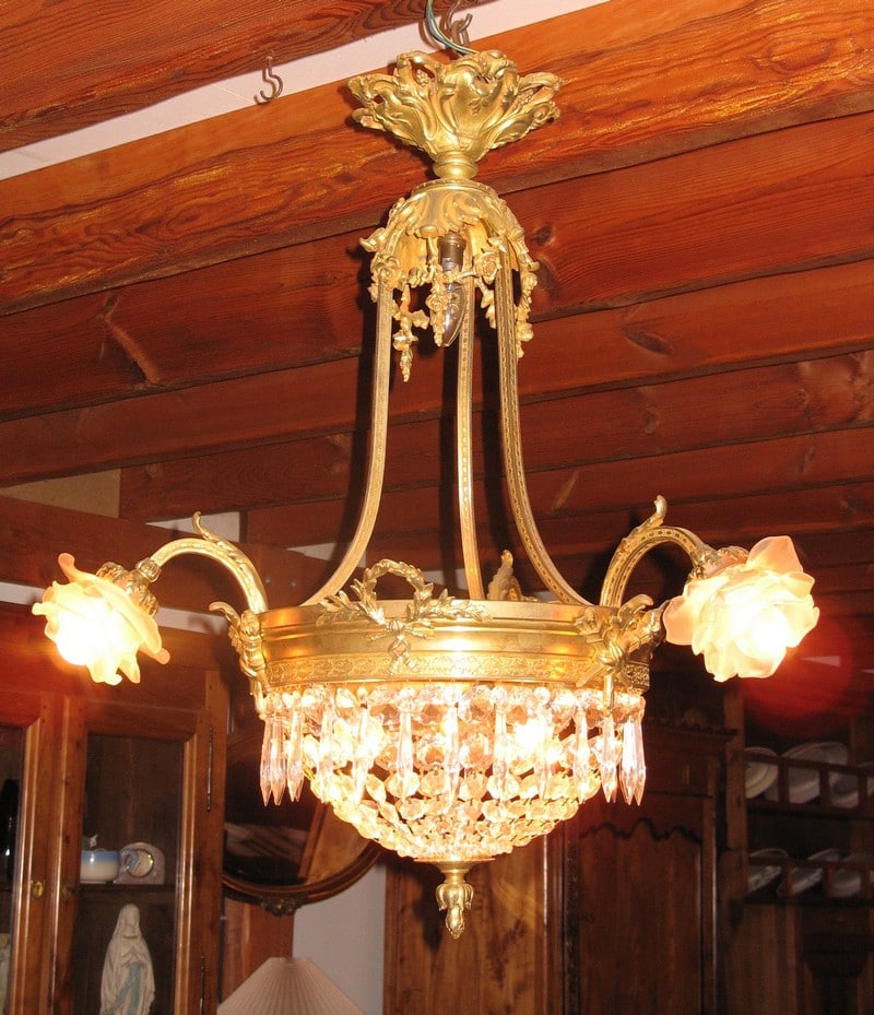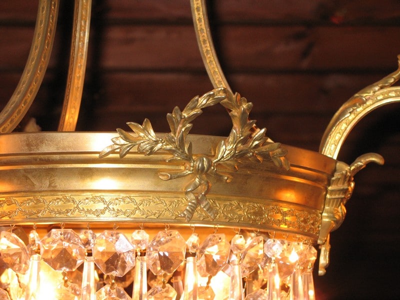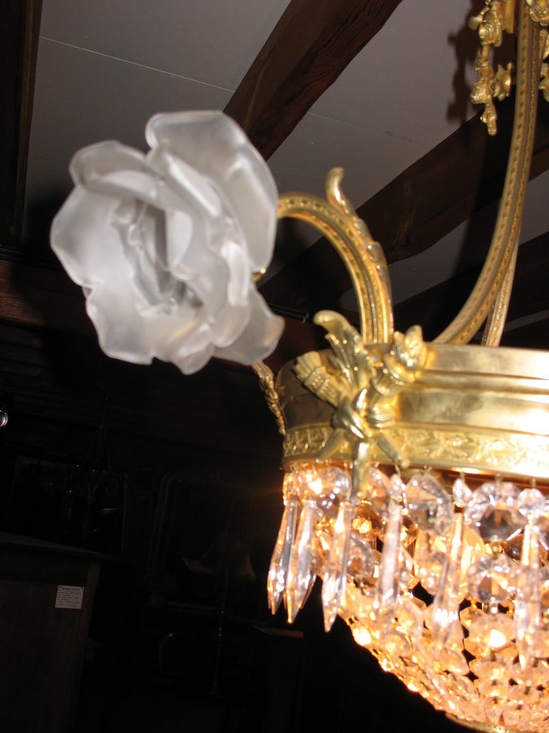 Lustre en bronze et cristal de forme demi-montgolfière. La couronne centrale est ornée de lauriers et de carquois. Il a 7 lumières dont 3 sous tulipes en verre opalin.