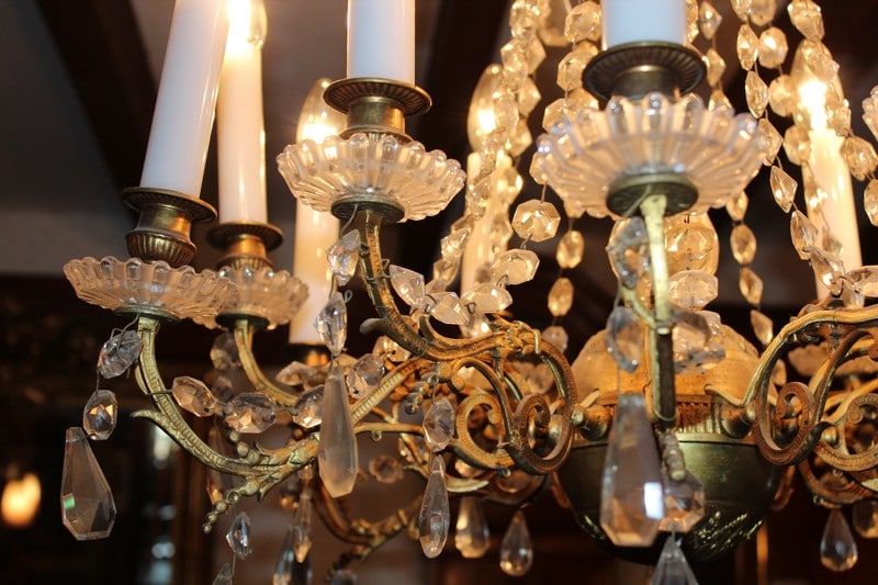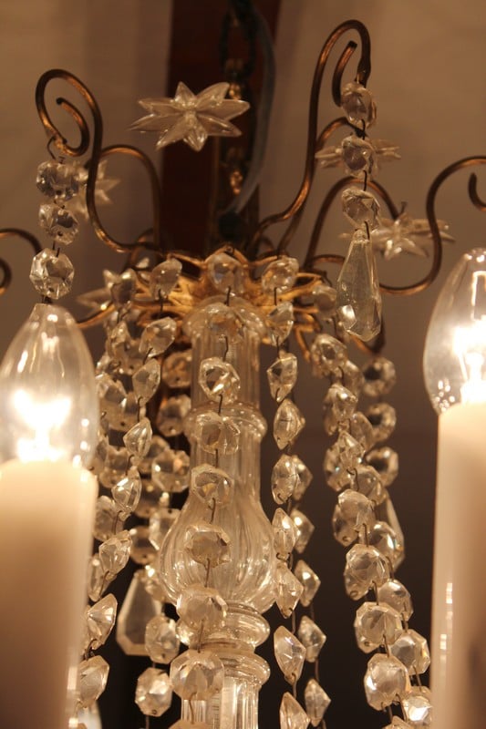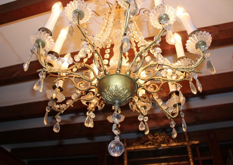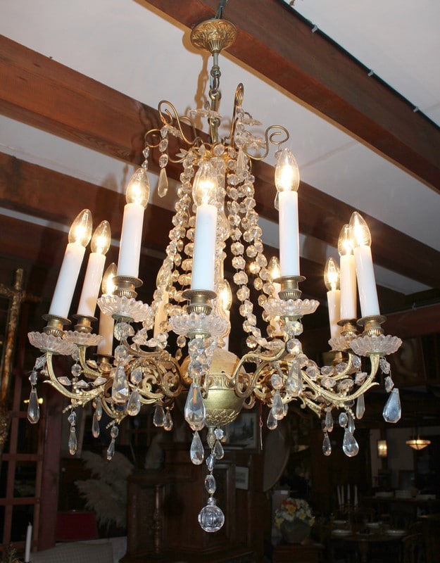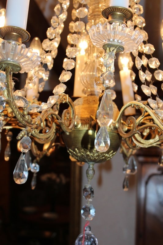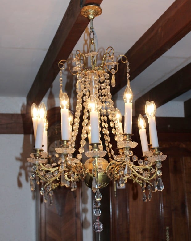 Lustre à pampilles de cristal et ossature en bronze. Éclairage par 12 bougies de porcelaine.