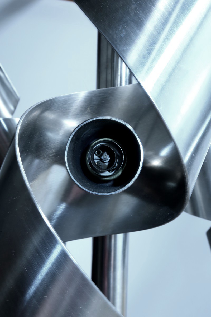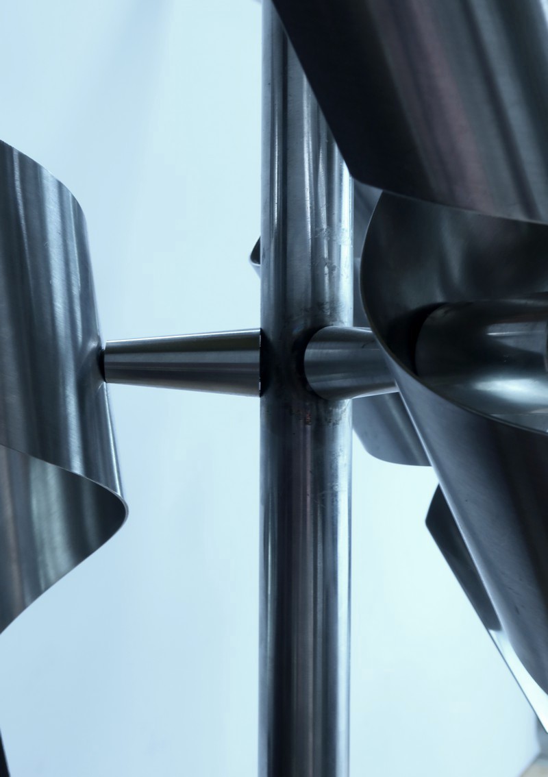 Les lumières sont fixées à un corps central cylindrique, également en acier inoxydable, qui évolue vers le haut en une coupole cache-fil.