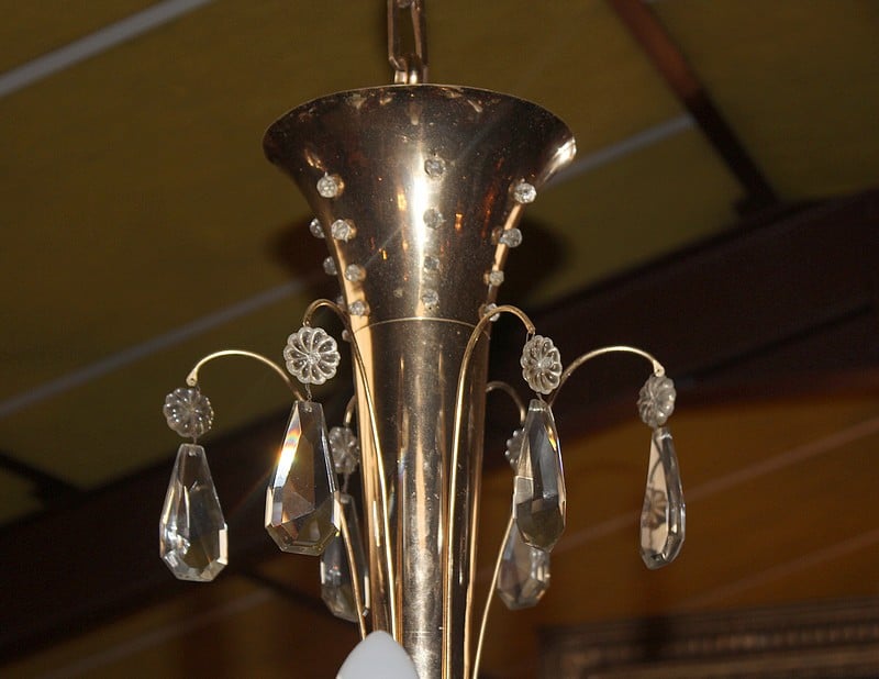 Lustre en métal doré orné de pampilles et d’une boule en cristal, éclairant par 6 bras de lumière.
