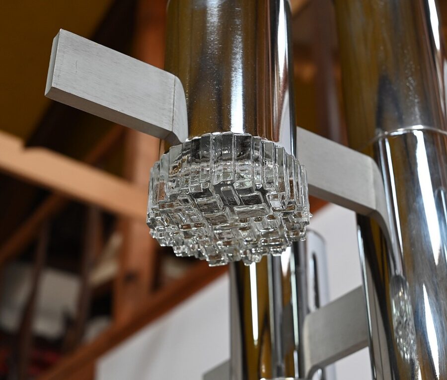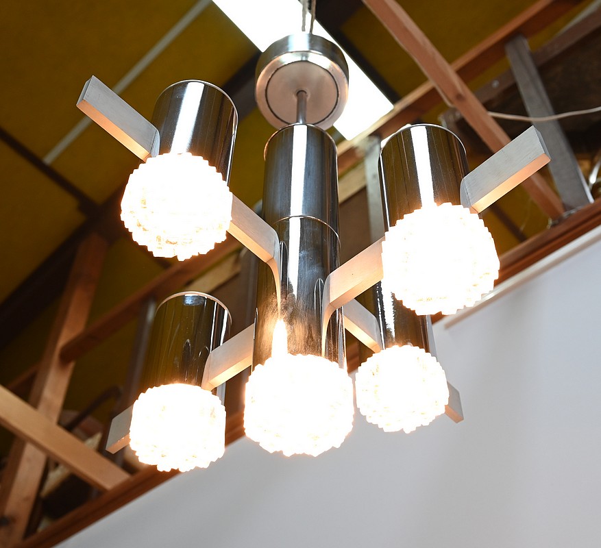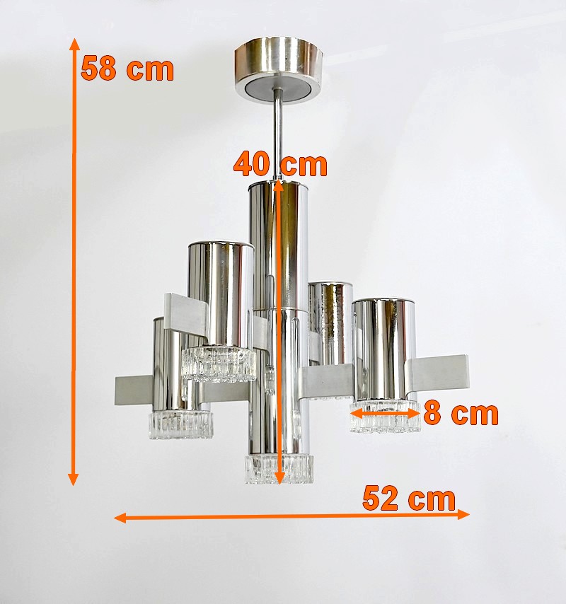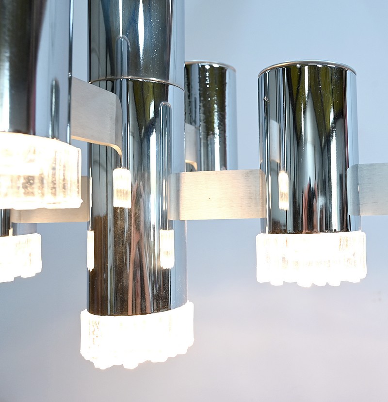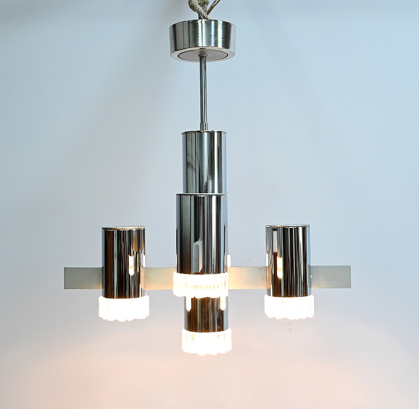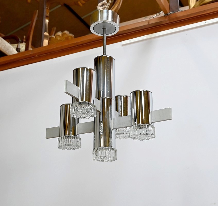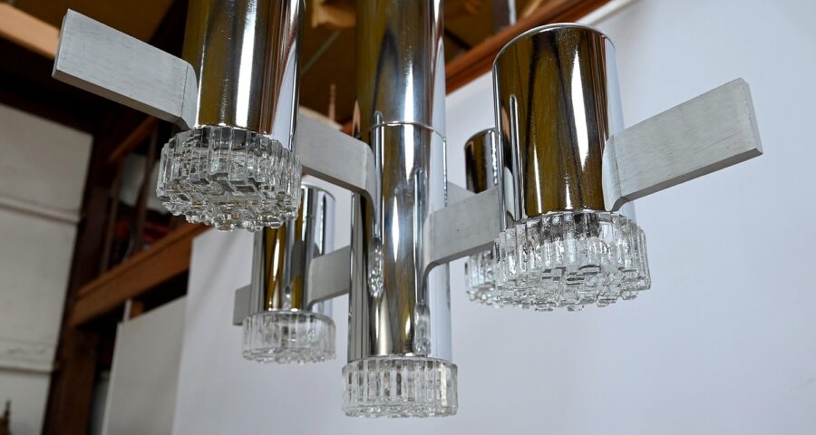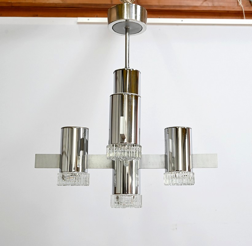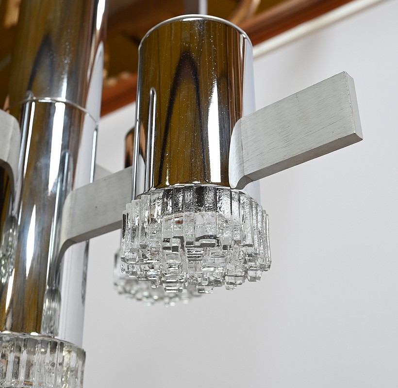 Lustre en métal chromé composé d’un important fût cylindrique d’où partent, en décalé, 4 éléments de métal où s’enchevêtrent des cylindres chromés. La partie centrale plus allongée se termine par un bloc de verre ciselé comme les 4 lampes en décalé.