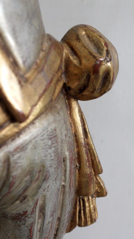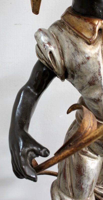 Le Personnage porte les caractéristiques physiques dénotant de son origine africaine, de par sa carnation noire, ses cheveux crépus et ses lèvres charnues. Son Costume au style mauresque, de la coiffe jusqu’au turban ceinturant sa taille, est Finement exécuté.