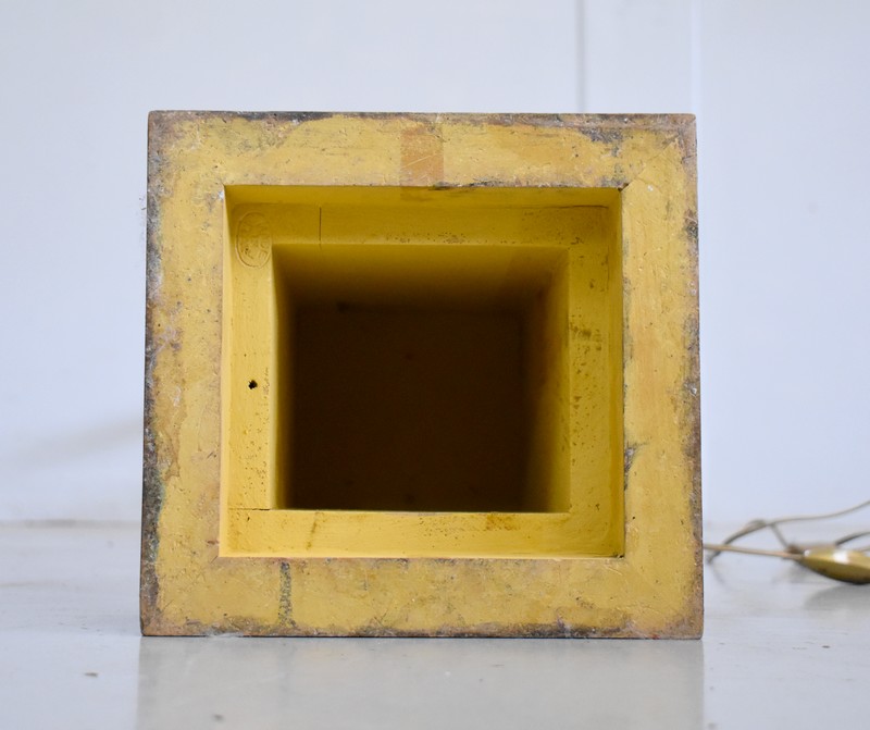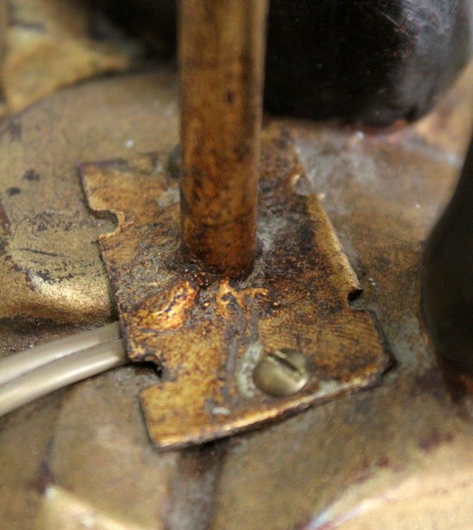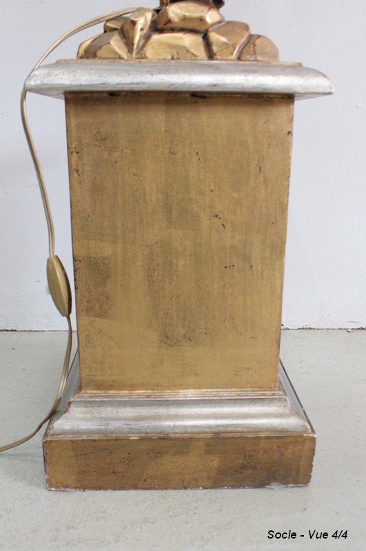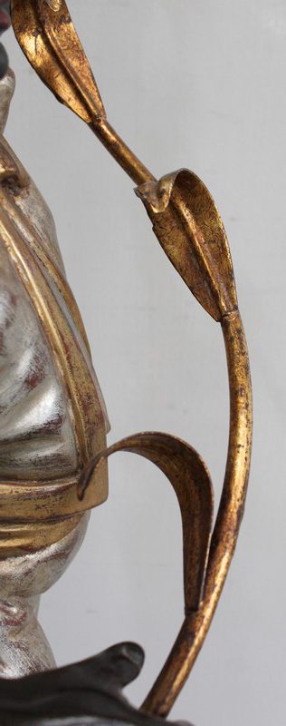 Debout sur un rocher, la jambe droite légèrement en appui vers l’arrière, le Sujet tient une liane en Métal Doré se terminant par un Candélabre à cinq branches de Lumière, en état de fonctionnement.