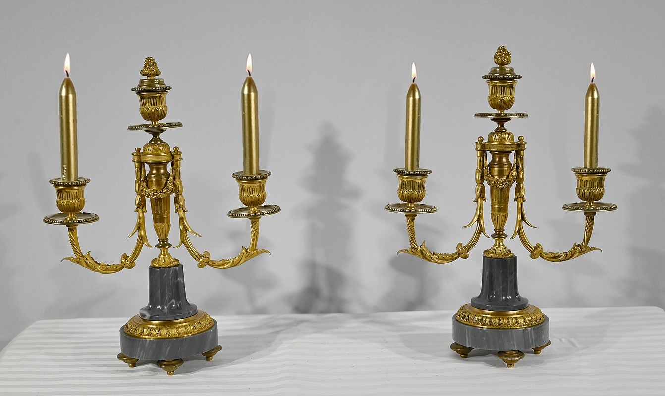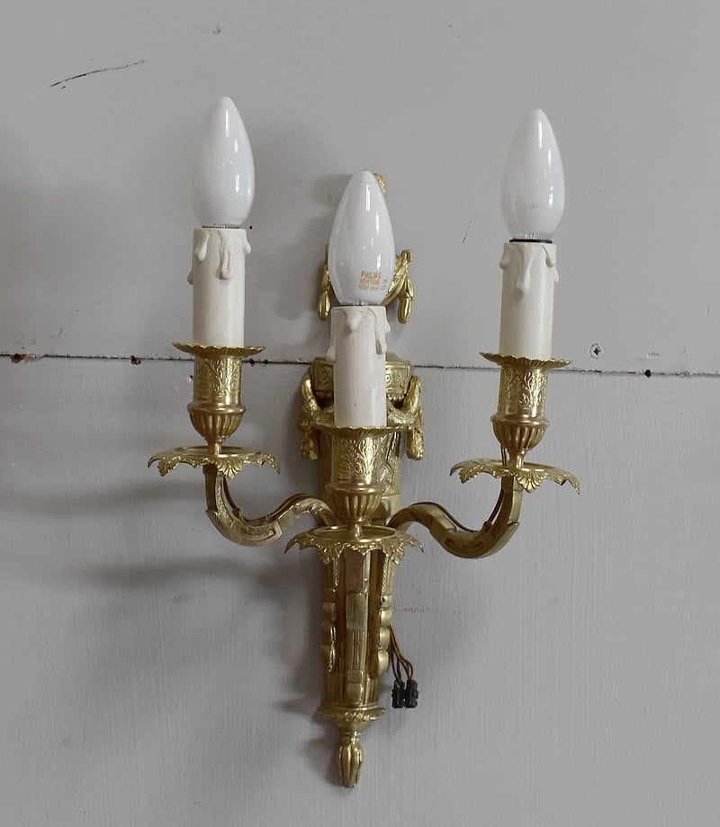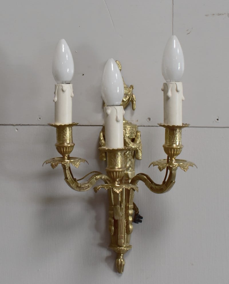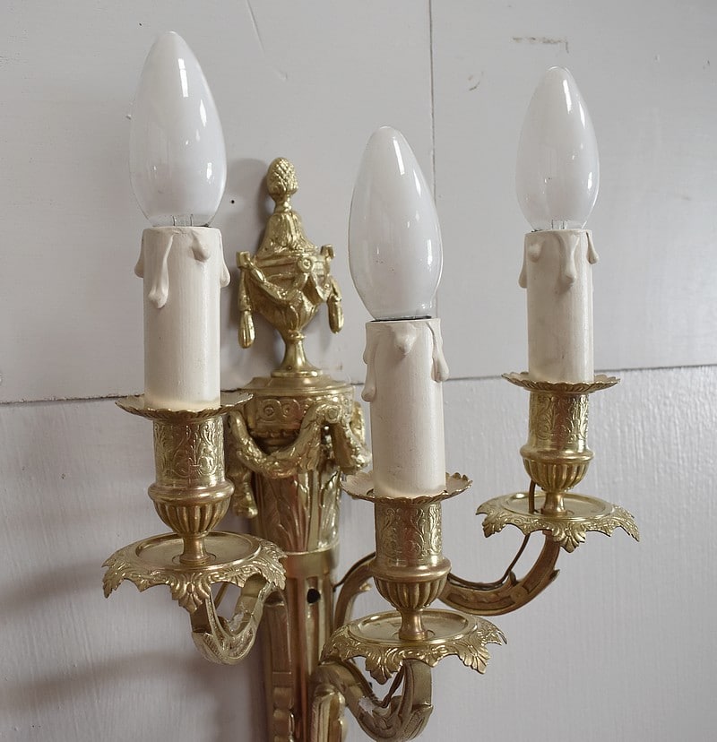 Paire d’appliques de style Louis XVI à 3 bras de lumière, en bronze finement ciselé sur les bobèches et les calices et à motif de vase drapé surmonté d’une pomme de pin en partie haute et de guirlandes sur le support.