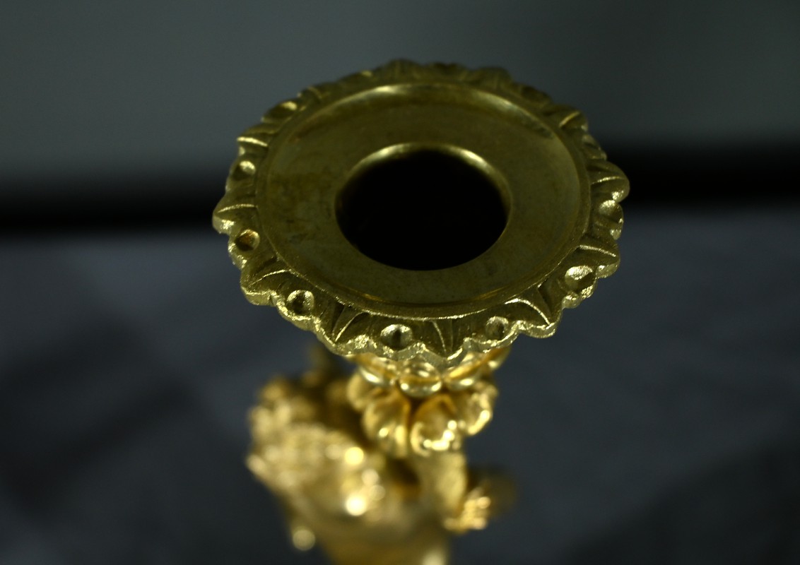 Cette paire de bougeoirs en bronze doré, datant du milieu du XIXe siècle, est un exemple exquis de l’artisanat de cette époque.