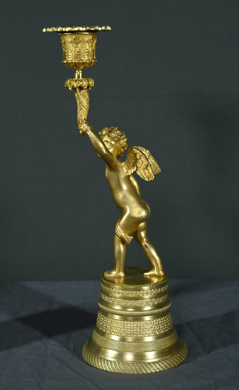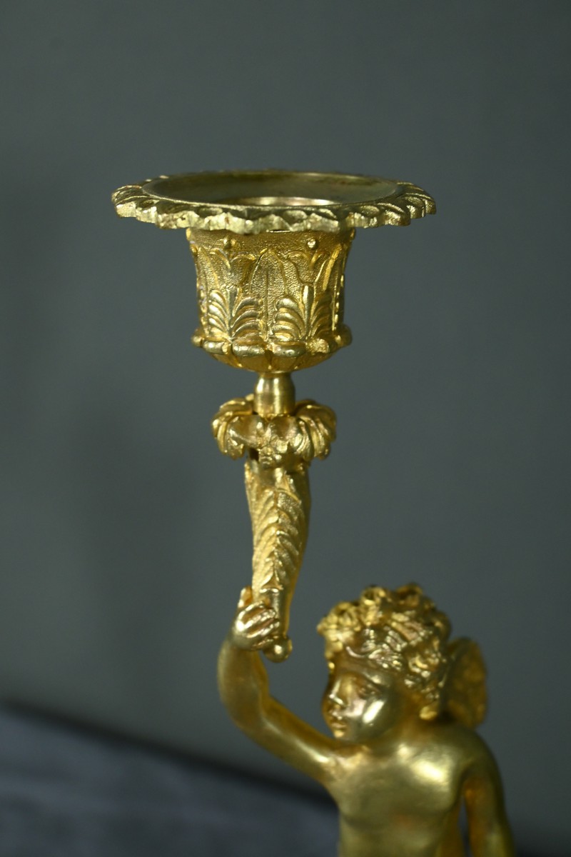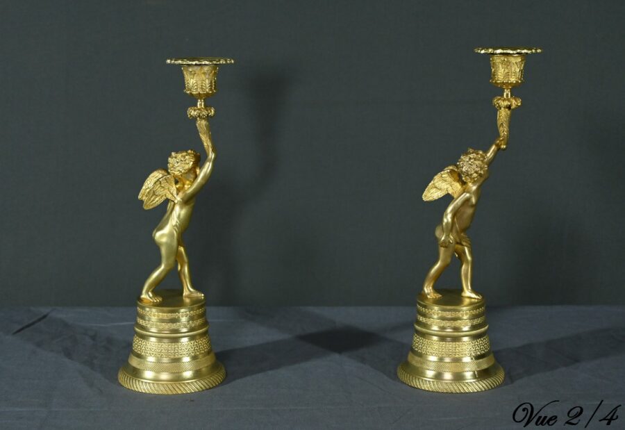 Chaque bougeoir représente un chérubin, l’un tenant au-dessus de sa tête une corne de feuilles d’acanthe de la main droite, et l’autre de la main gauche.