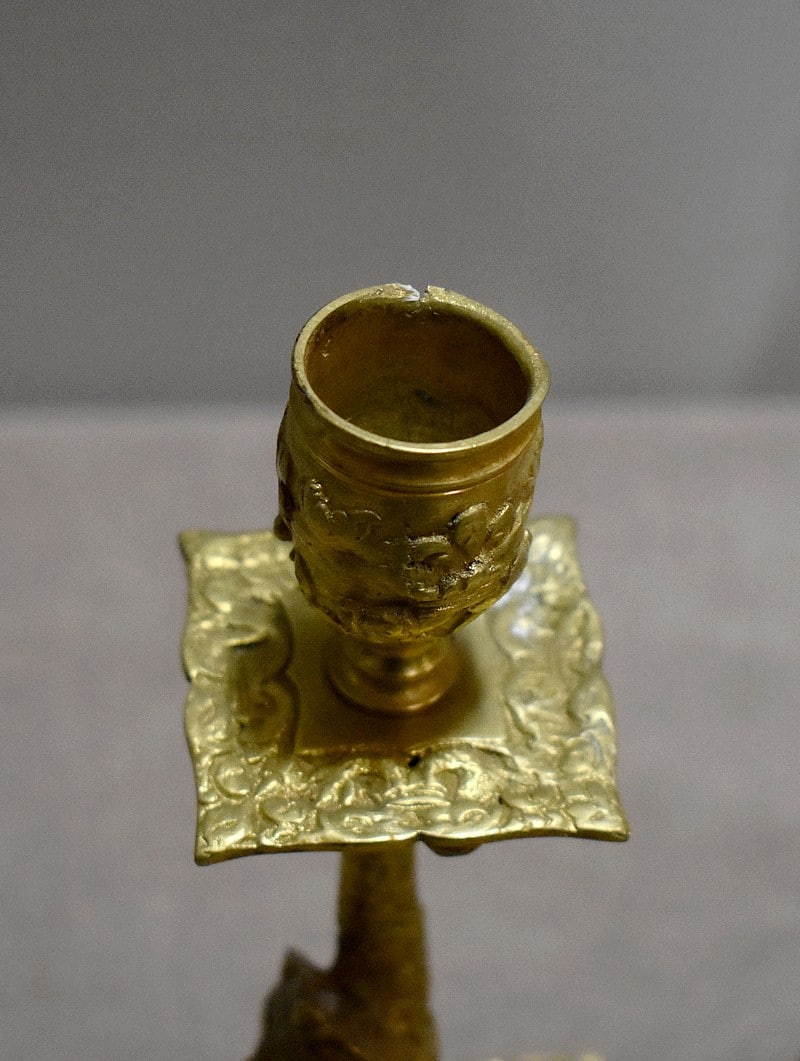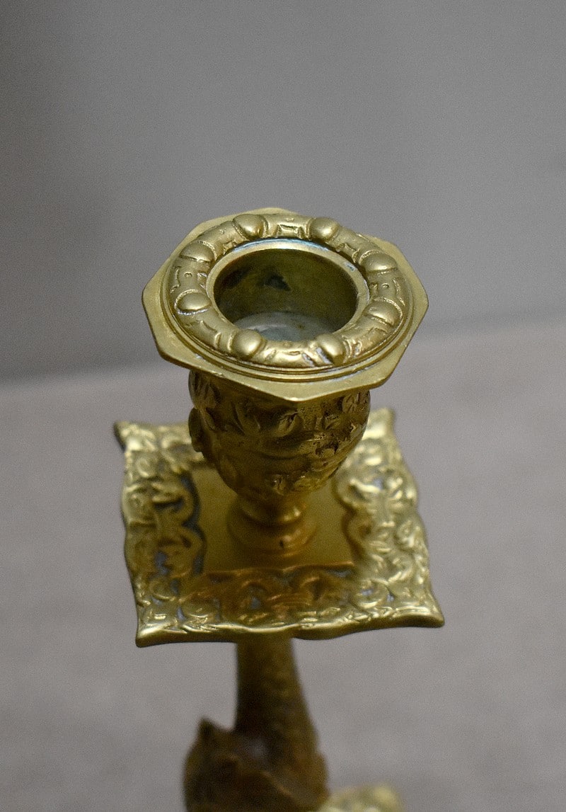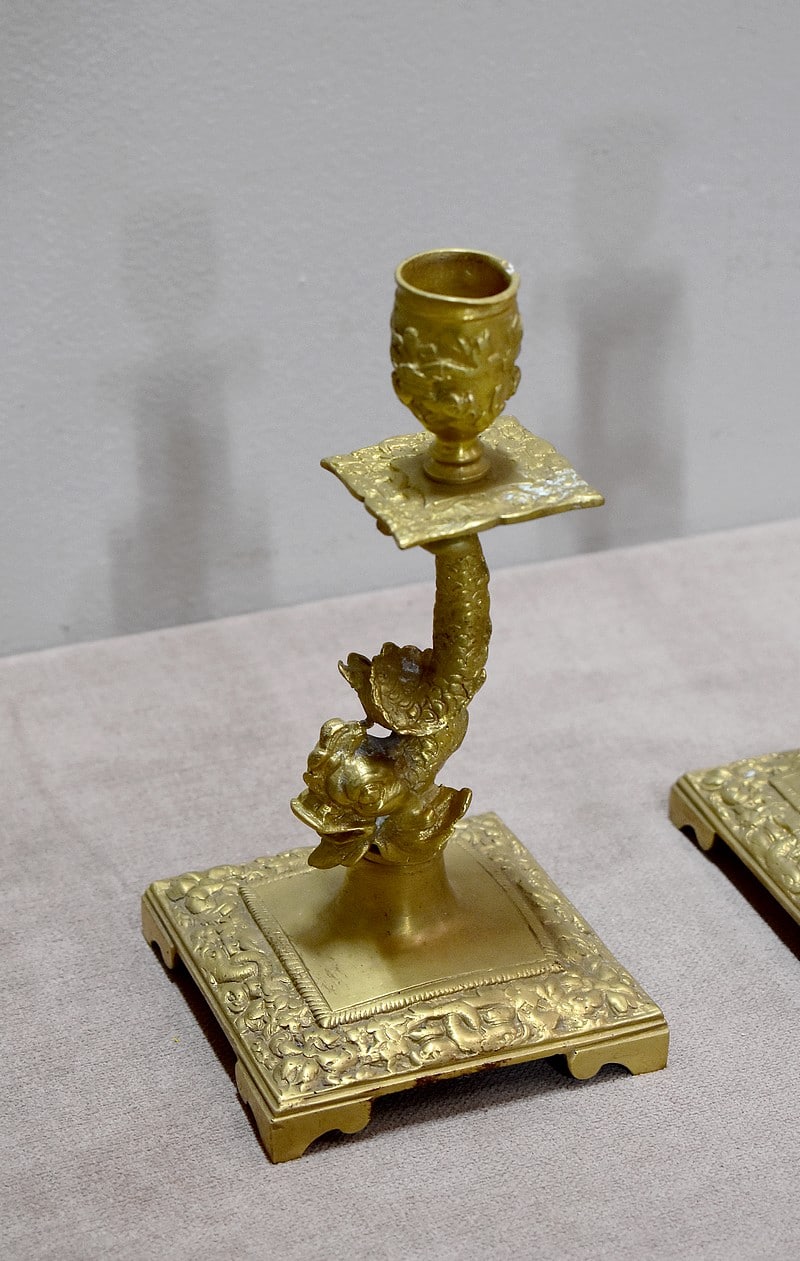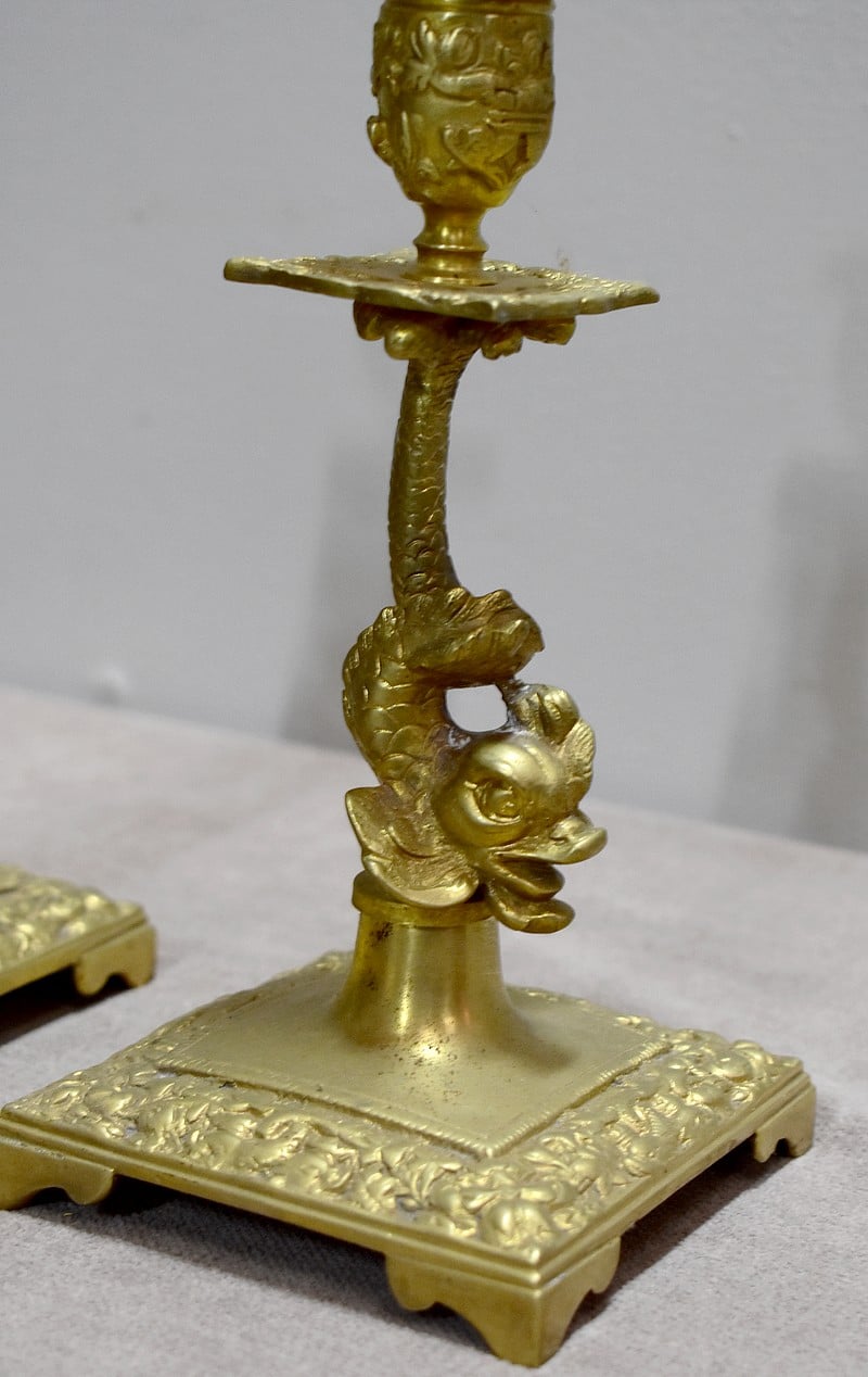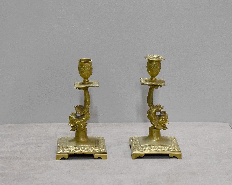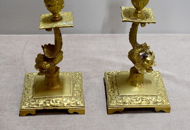 Ils reposent sur un pied à décors de dauphins terminé en socle carré orné de motifs floraux et d’autres dauphins.