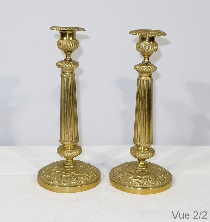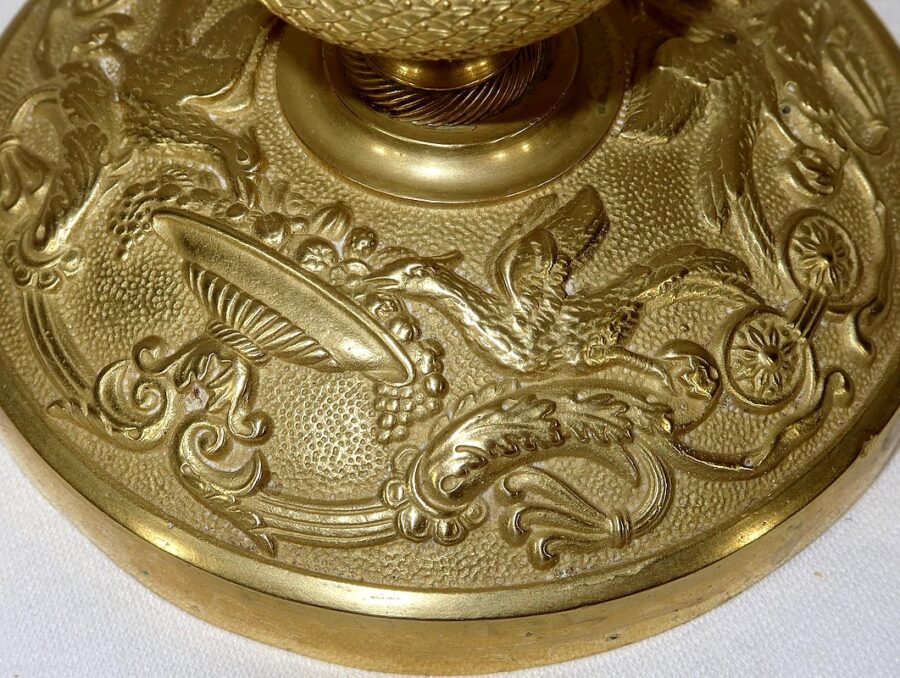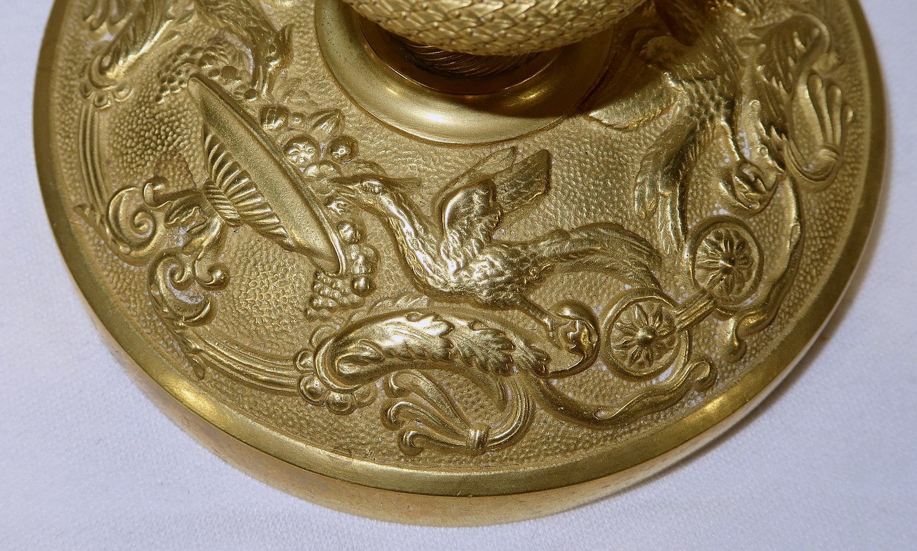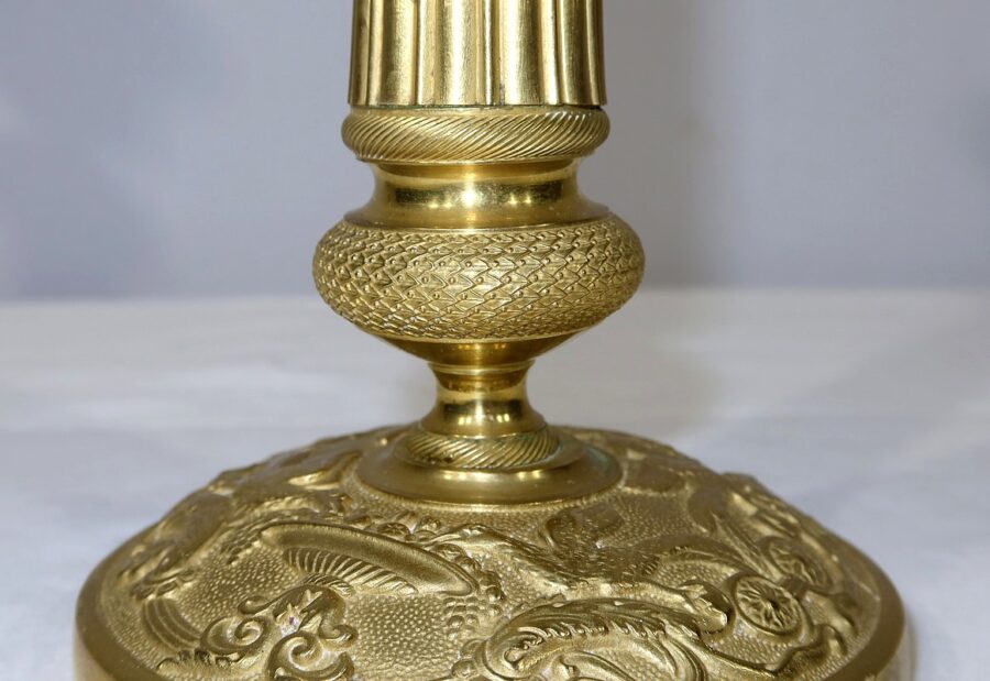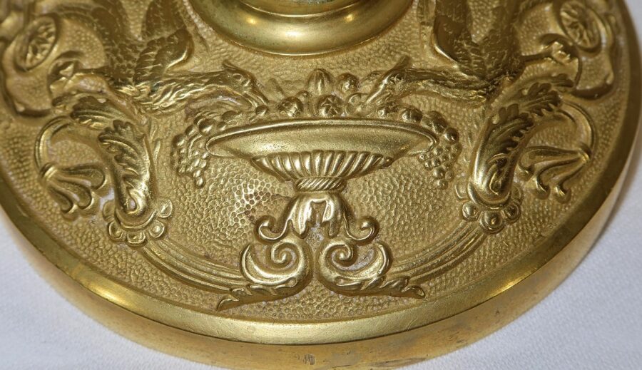 Charmante paire de bougeoirs en laiton ciselé à décor d’oiseau, de coupes de fruits et de volutes. Chaque bougeoir possède une ligne fine et élégante, avec des ornementations minutieuses et des cannelures sur le fût. La base est décorée d’oiseaux aux ailes déployées picorant des fruits. Ces flambeaux délicatement travaillés habilleront à merveille une table ou une console.