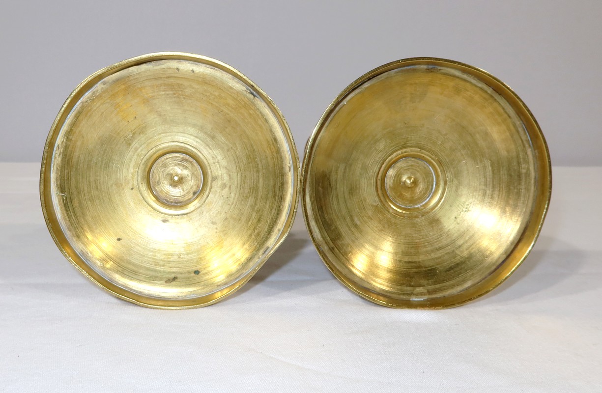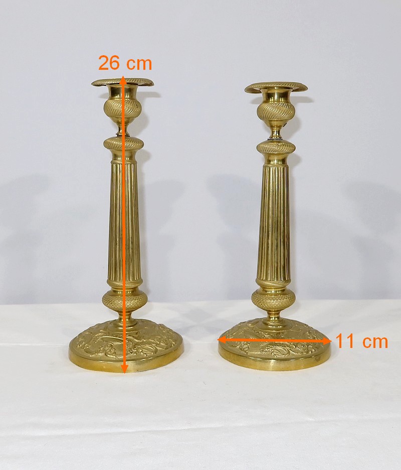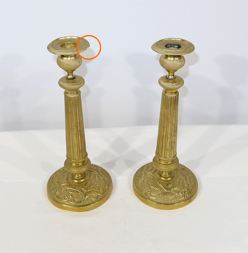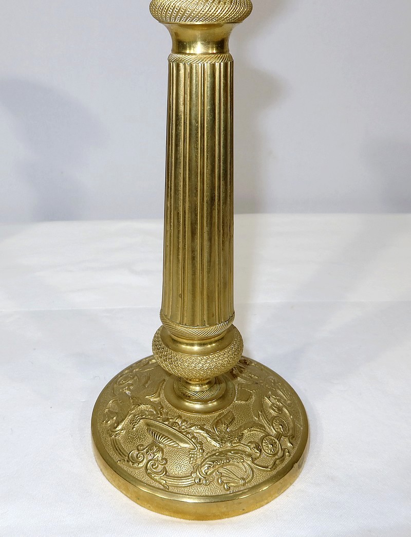 Charmante paire de bougeoirs en laiton ciselé à décor d’oiseau, de coupes de fruits et de volutes. Chaque bougeoir possède une ligne fine et élégante, avec des ornementations minutieuses et des cannelures sur le fût. La base est décorée d’oiseaux aux ailes déployées picorant des fruits. Ces flambeaux délicatement travaillés habilleront à merveille une table ou une console.