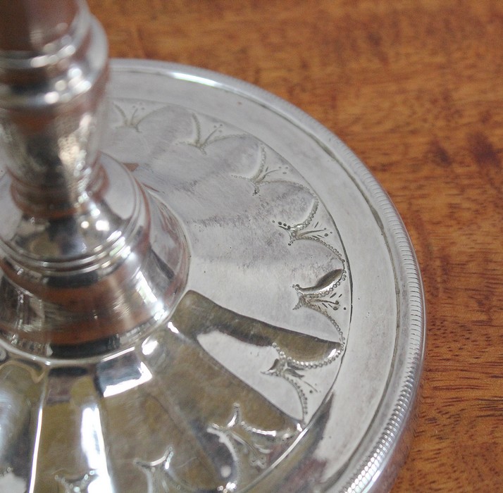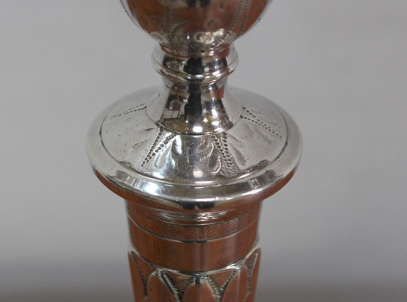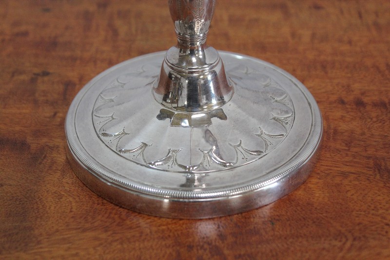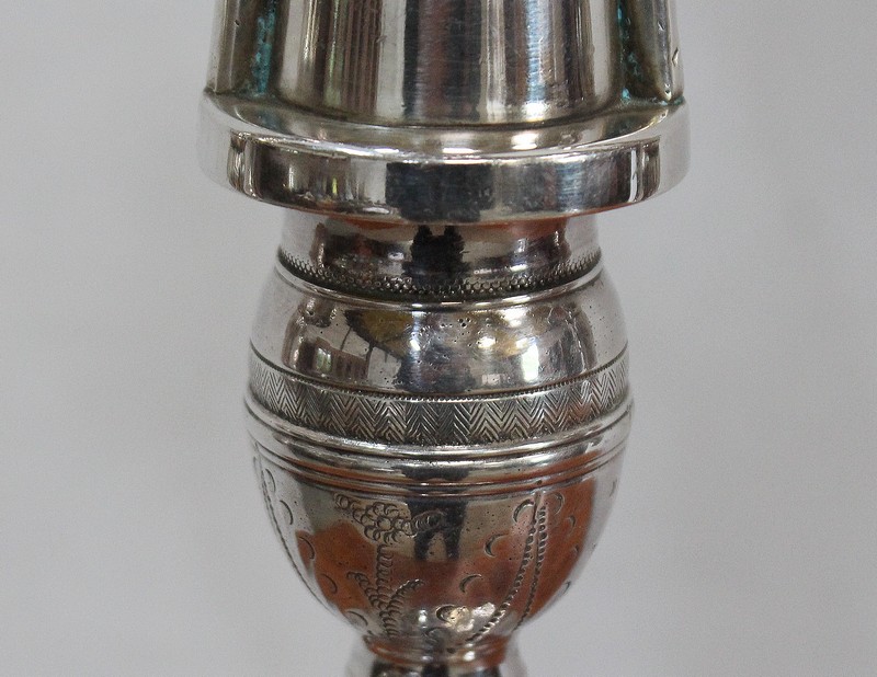 Bras, fût central et base circulaire sont ouvragés et enjolivés de petits dessins.