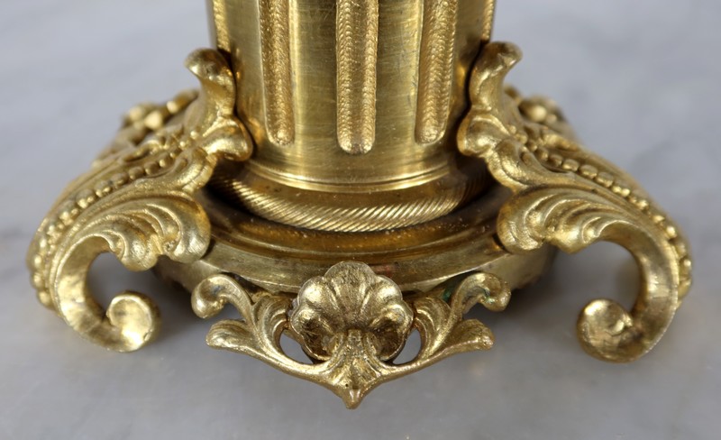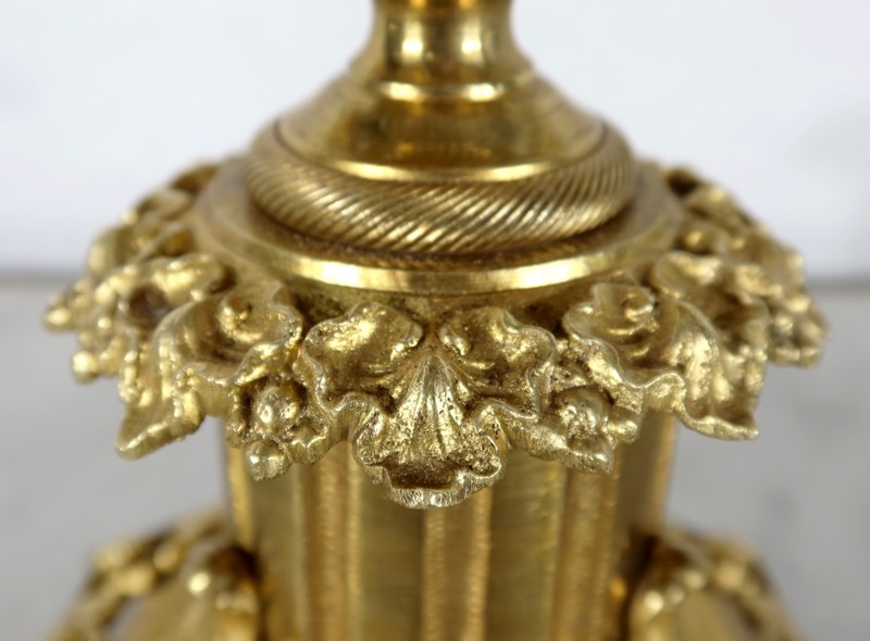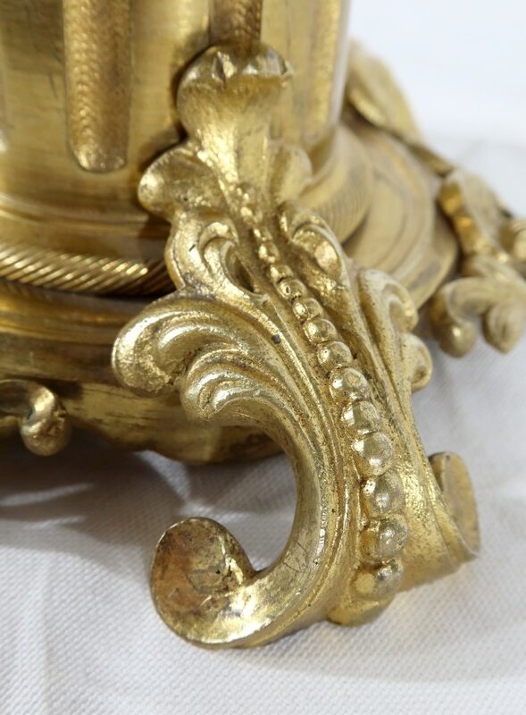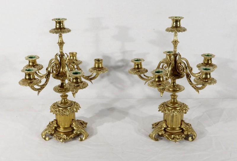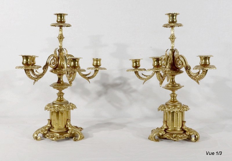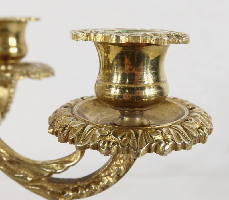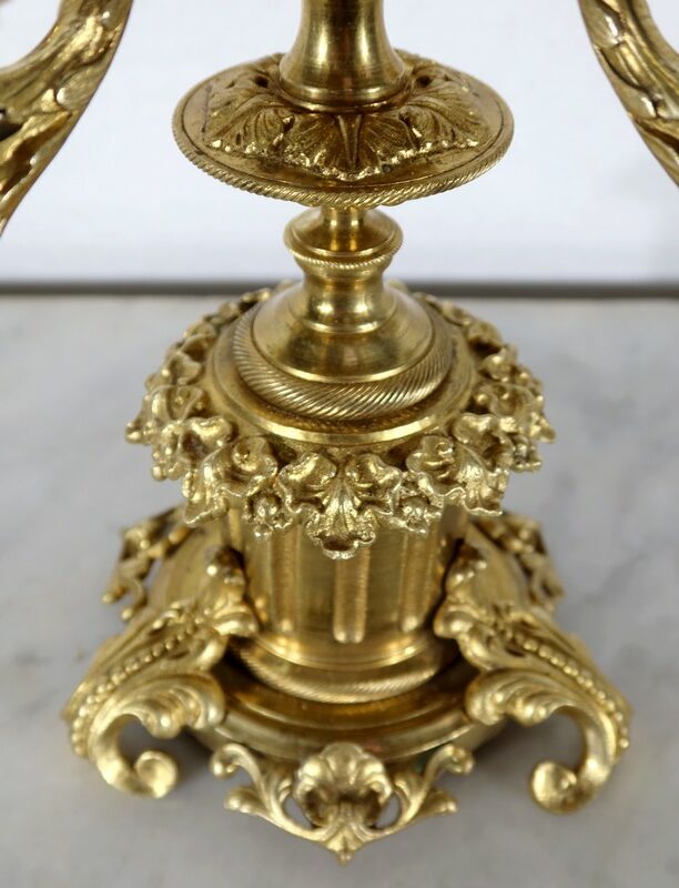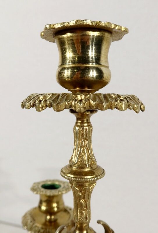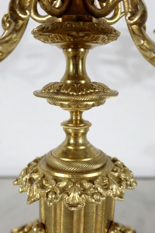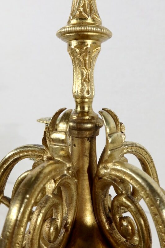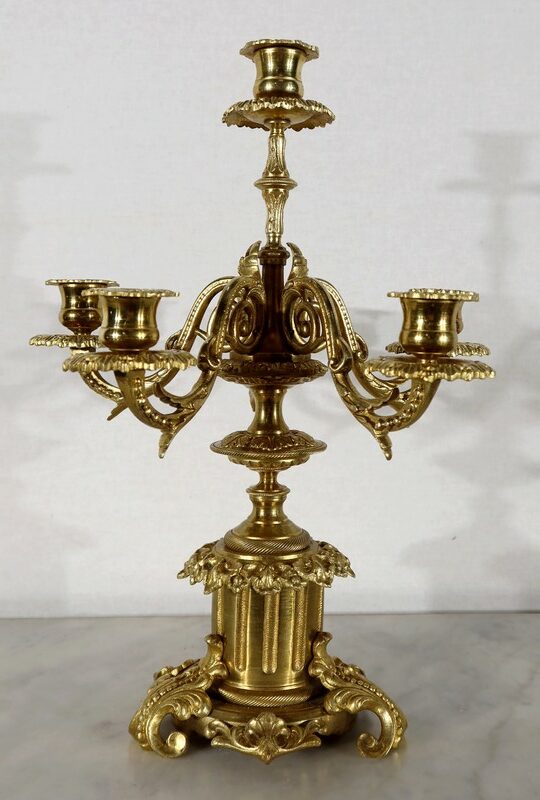 Surplombés par un bougeoir central, cinq bras de lumière aux agréables enroulements feuillagés viennent soutenir des bougeoirs aux bobèches joliment ouvragées. Le fût de forme circulaire, ciselé dans le même esprit en partie haute, est composé de cannelures.