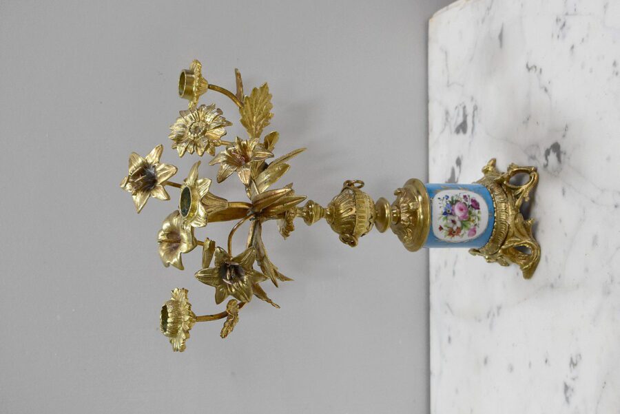Paire de candélabres représentant des lys jaillissant d’un vase en porcelaine peint de fleurs sur fond blanc, entourées d’un fond bleu de Sèvres.