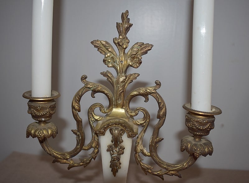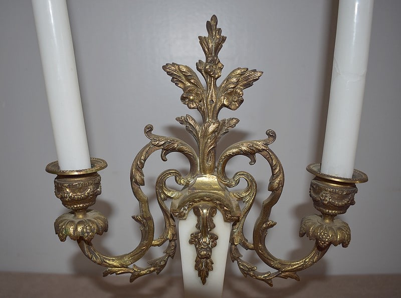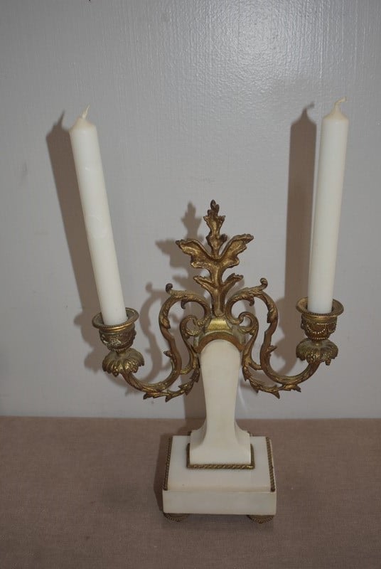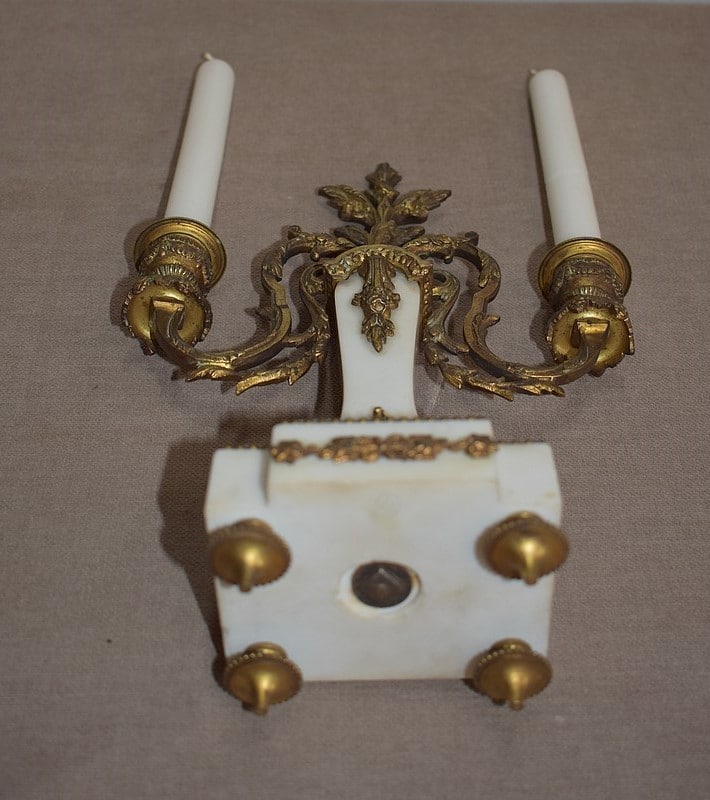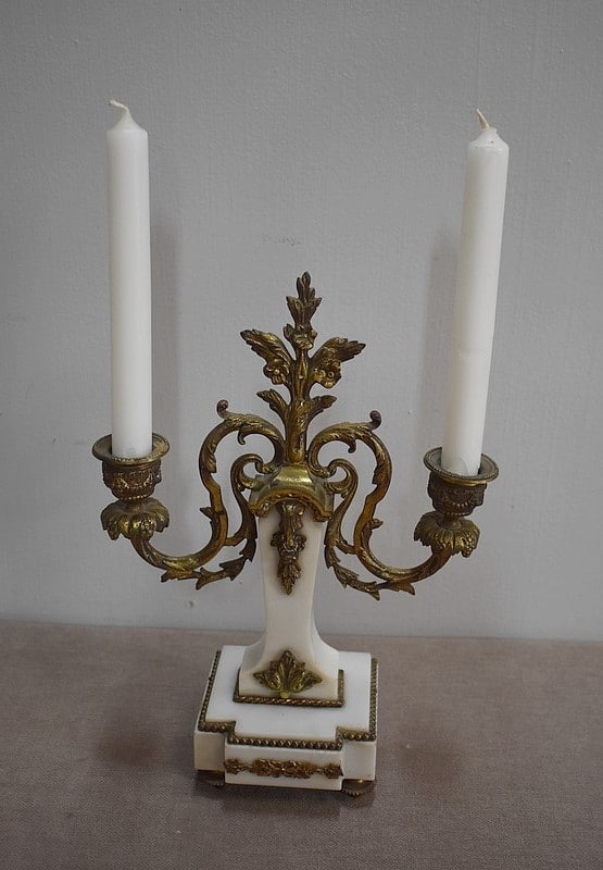 Paire de chandeliers de style Louis XV en marbre blanc à 2 bras de lumière en bronze patiné en forme de volutes, de feuilles d’acanthe et de fleurs.