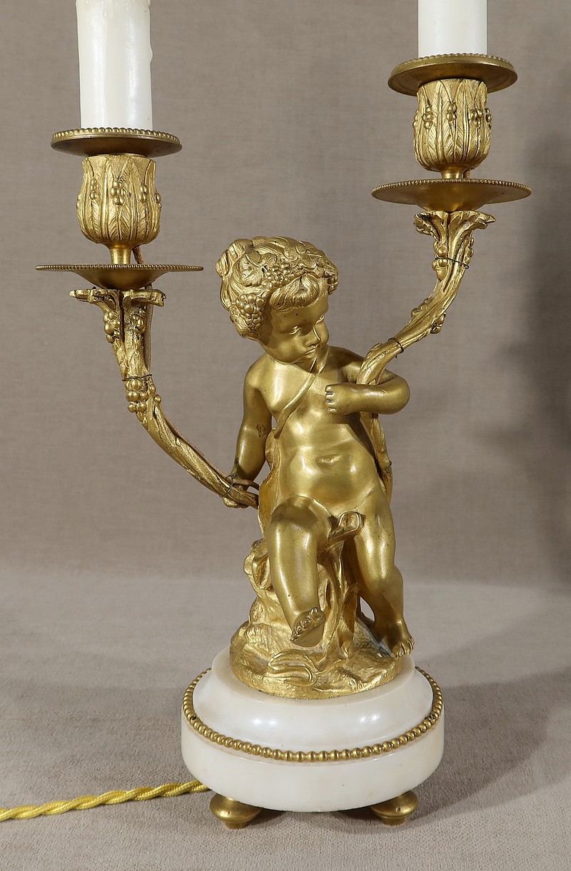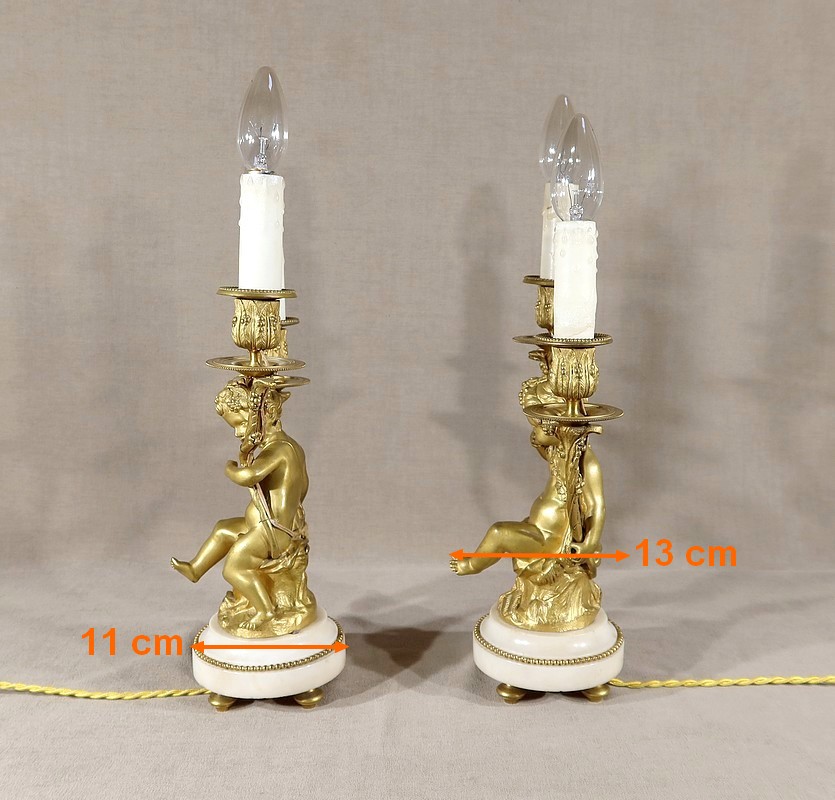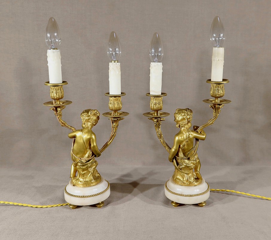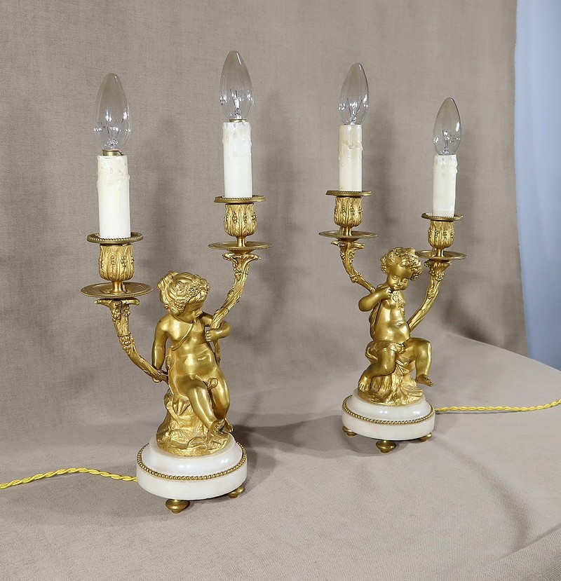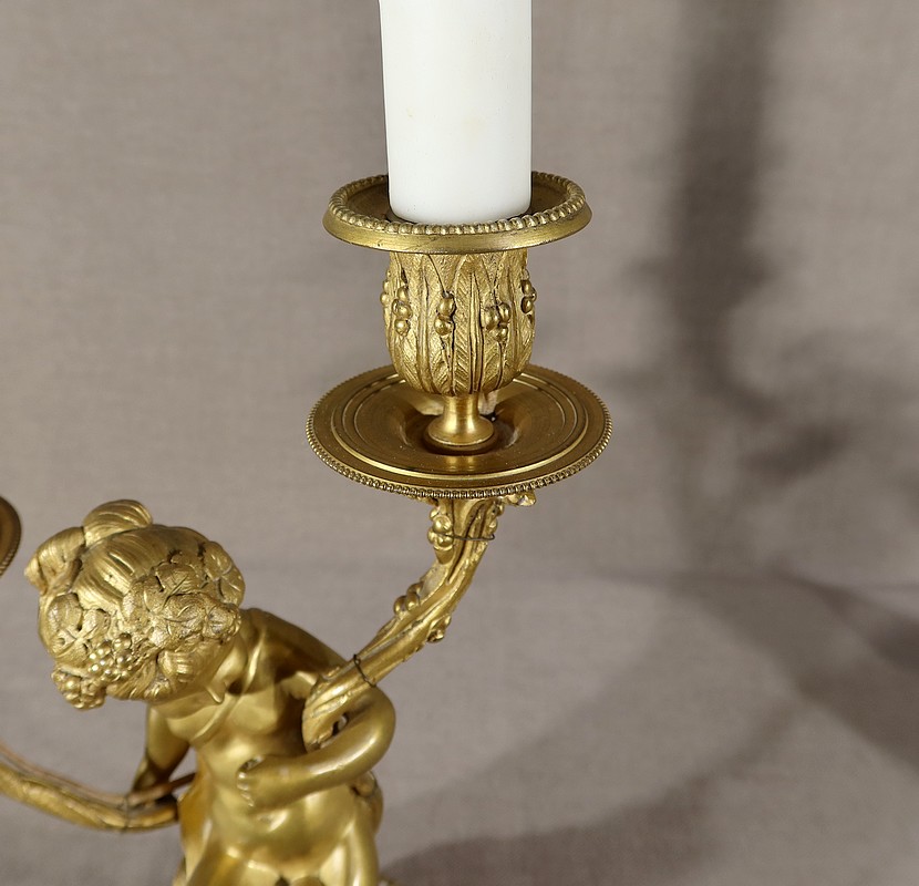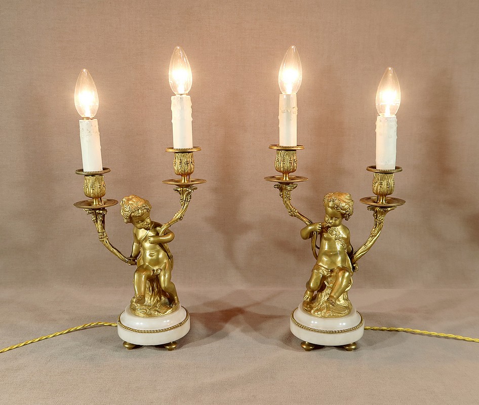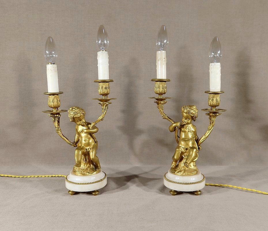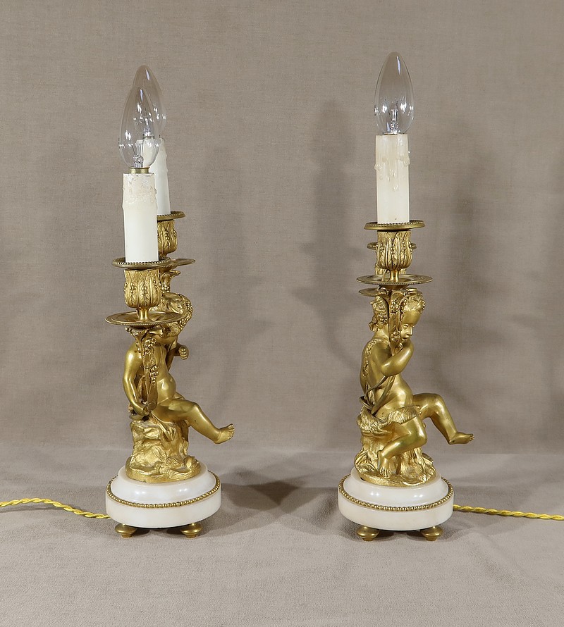 Superbe paire de chandeliers en bronze doré, électrifiés, représentant des putti de la renaissance italienne soutenant des cornes d’abondance formant des porte-bougies.