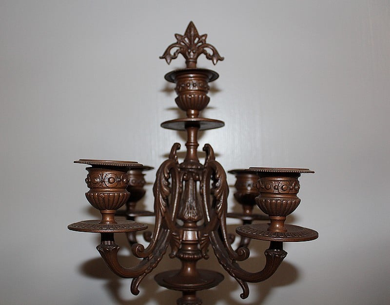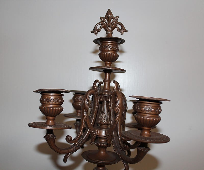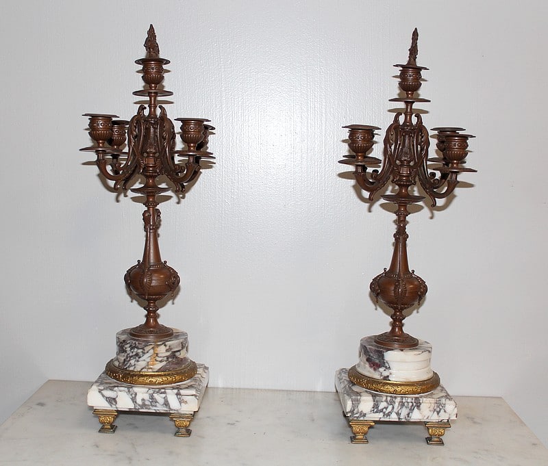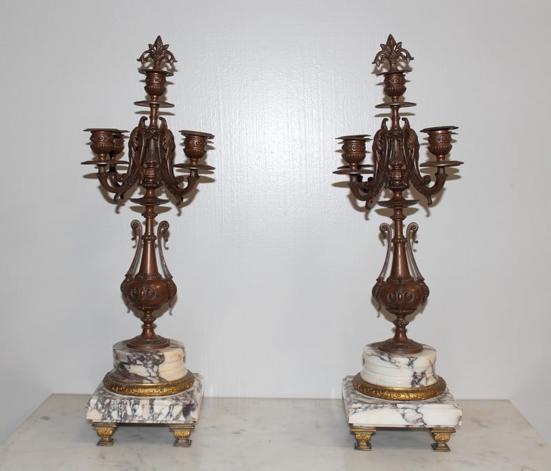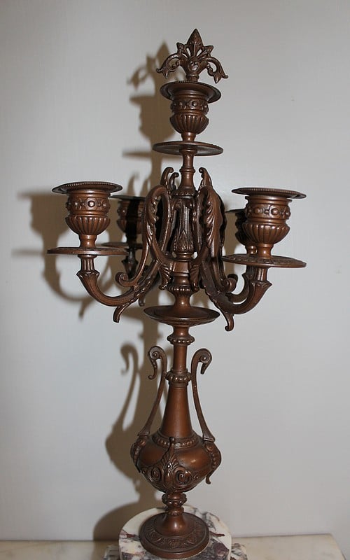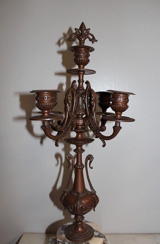 Les chandeliers en régule soutiennent quatre bougeoirs surmontés d’un cinquième.