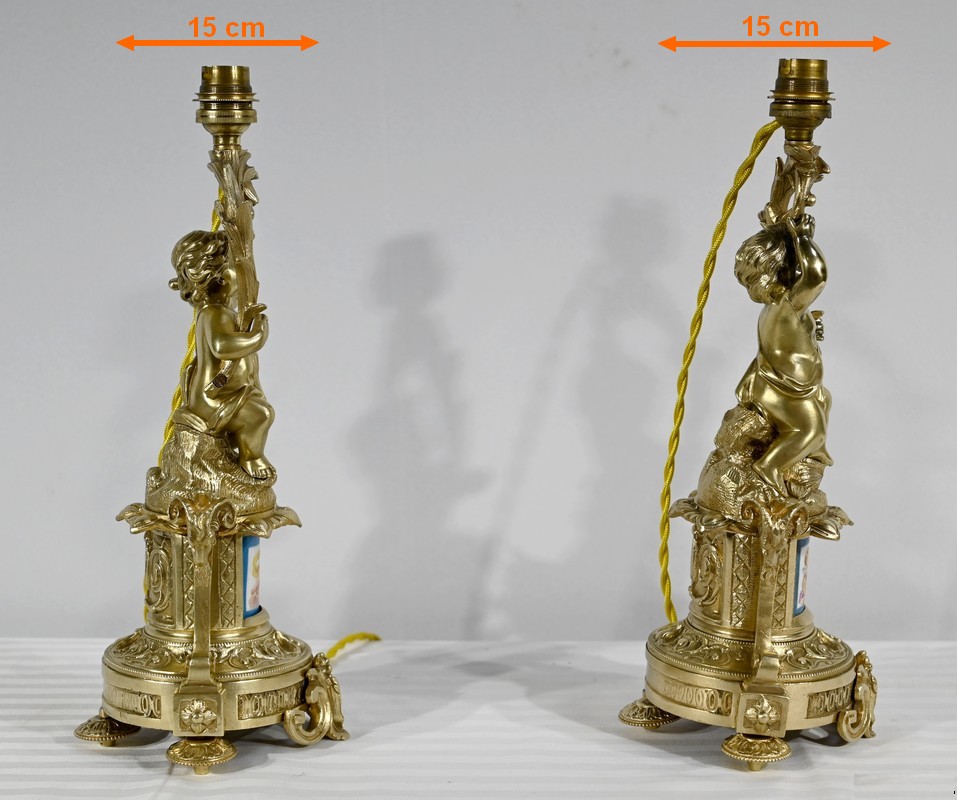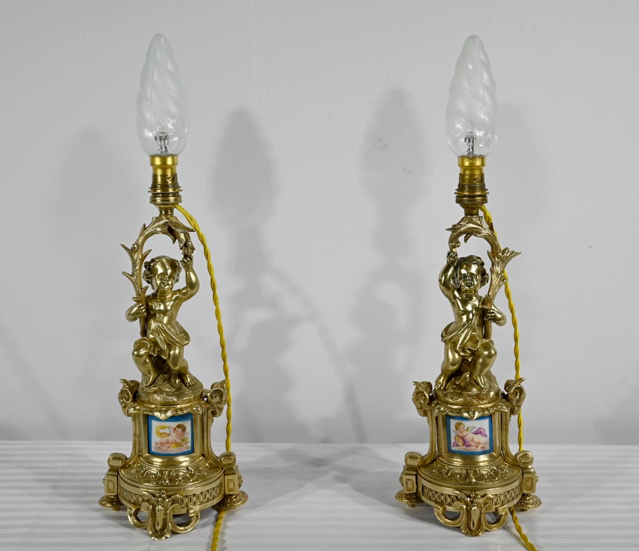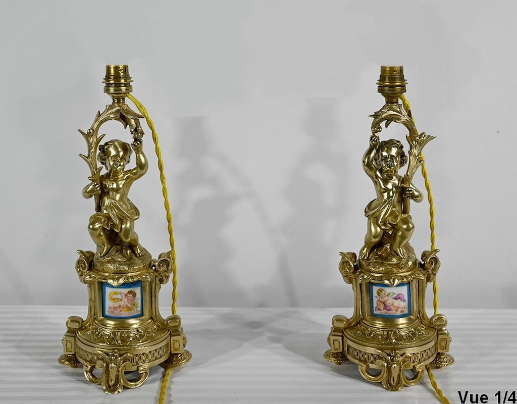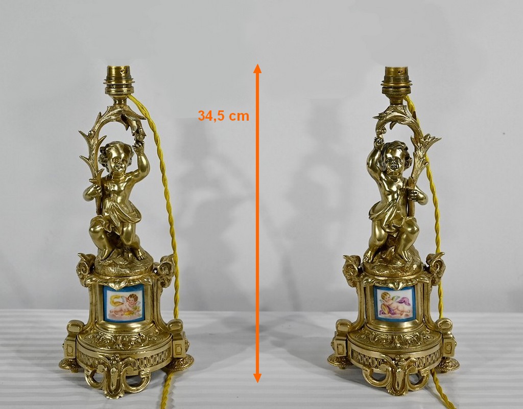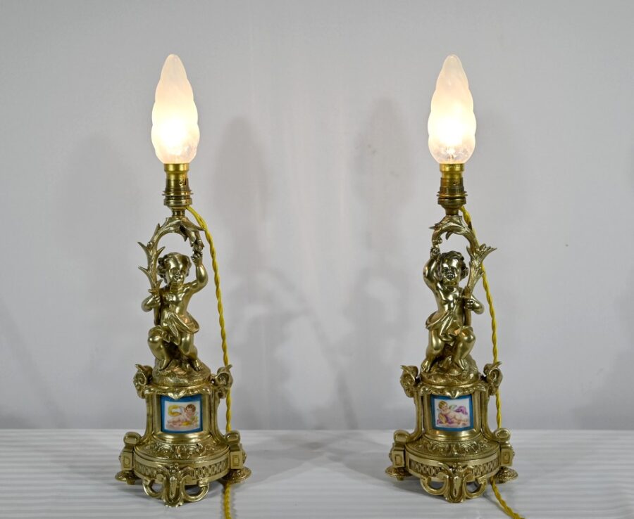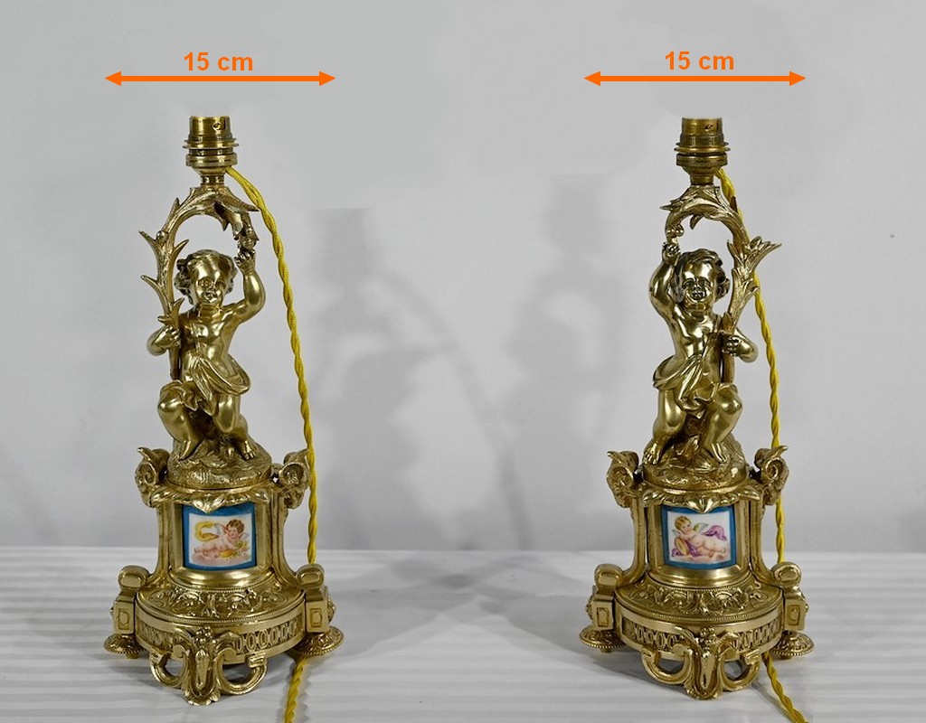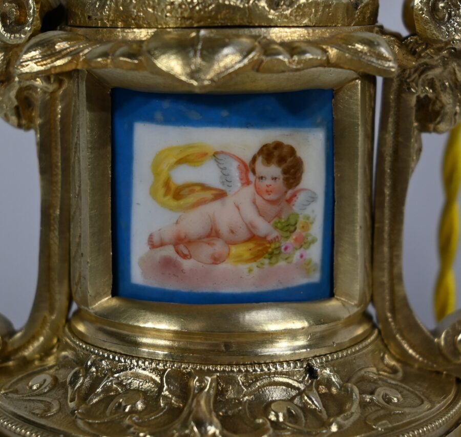 Ces anciens flambeaux, aujourd’hui électrifiés, figurent d’importantes sculptures d’anges tenant dans leurs mains des rameaux d’arbre fruitier. Chaque angelot repose sur un piédestal à décors de feuilles, de volutes, de têtes de bélier et ornés de portraits de chérubins en porcelaine de Sèvres.