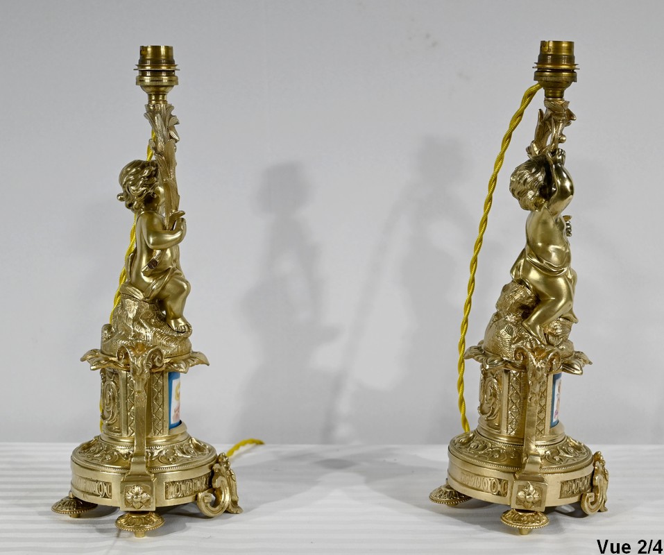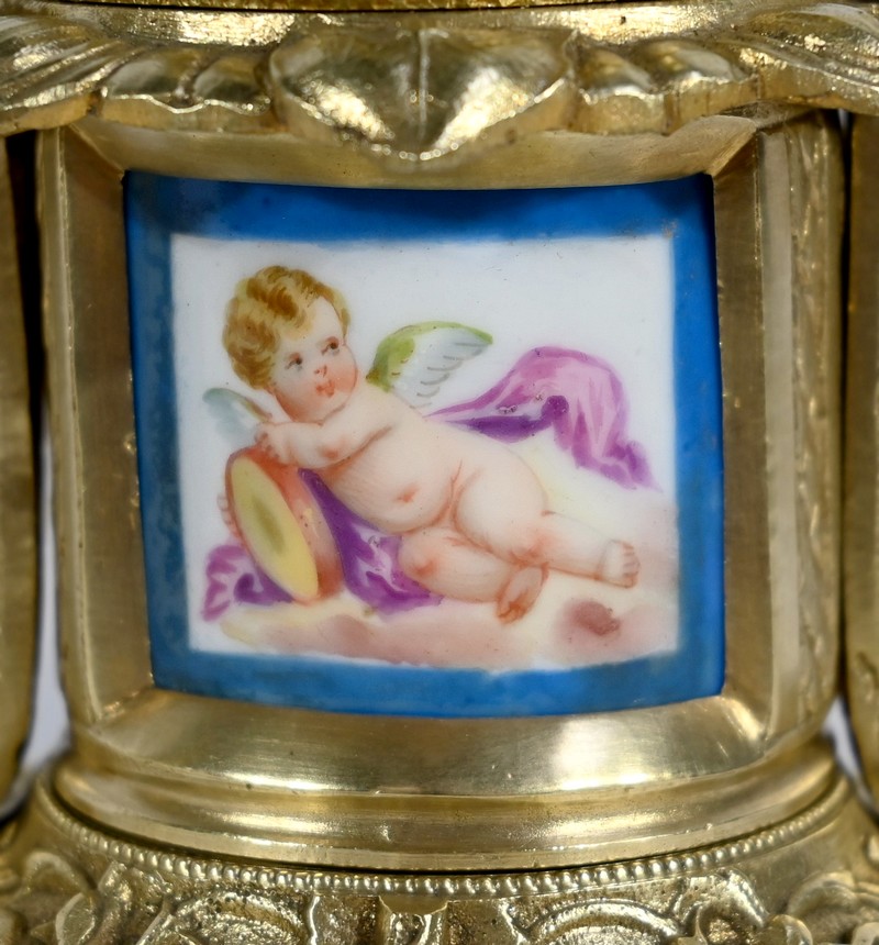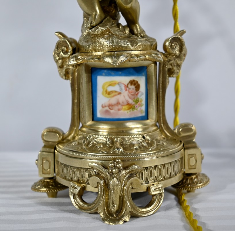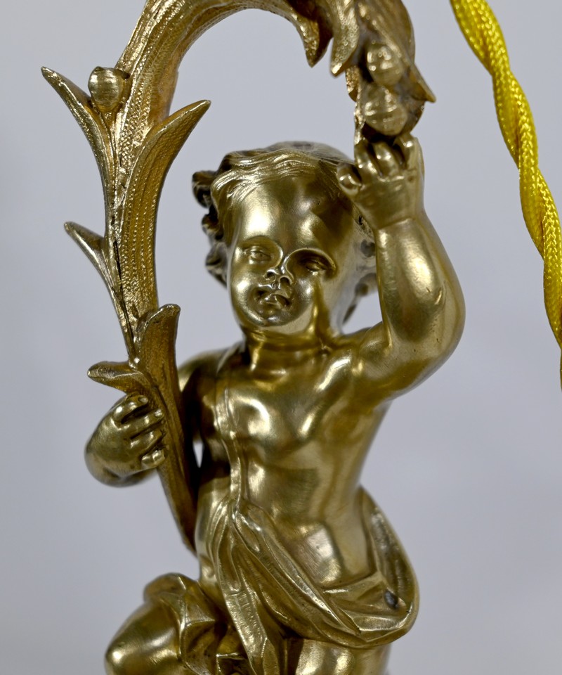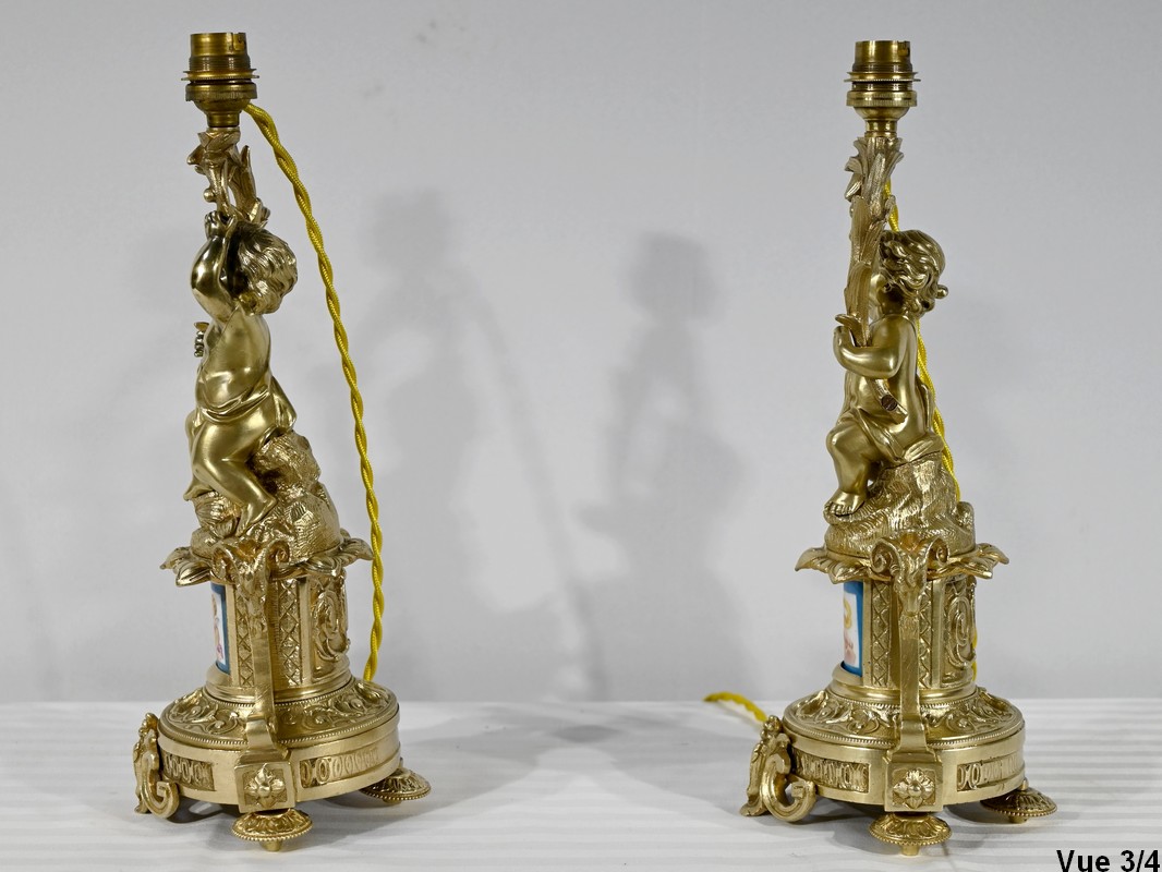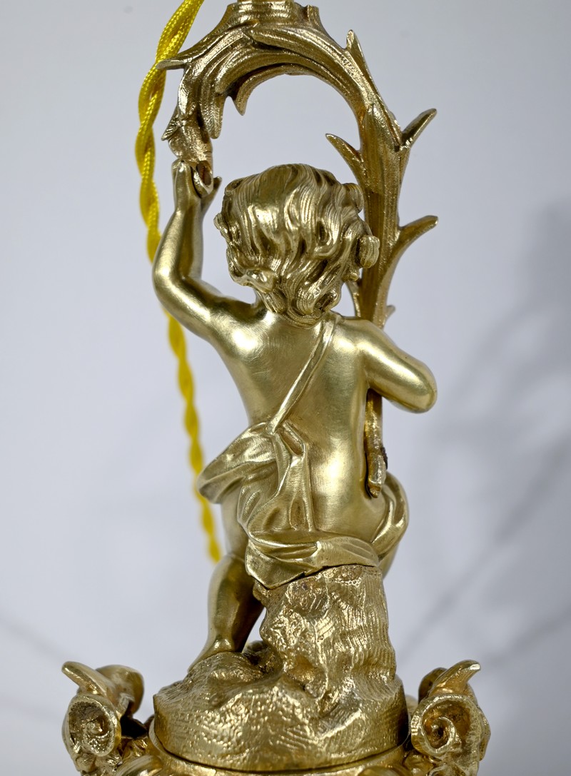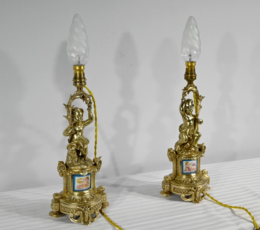 Ces anciens flambeaux, aujourd’hui électrifiés, figurent d’importantes sculptures d’anges tenant dans leurs mains des rameaux d’arbre fruitier. Chaque angelot repose sur un piédestal à décors de feuilles, de volutes, de têtes de bélier et ornés de portraits de chérubins en porcelaine de Sèvres.