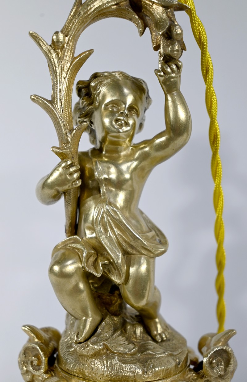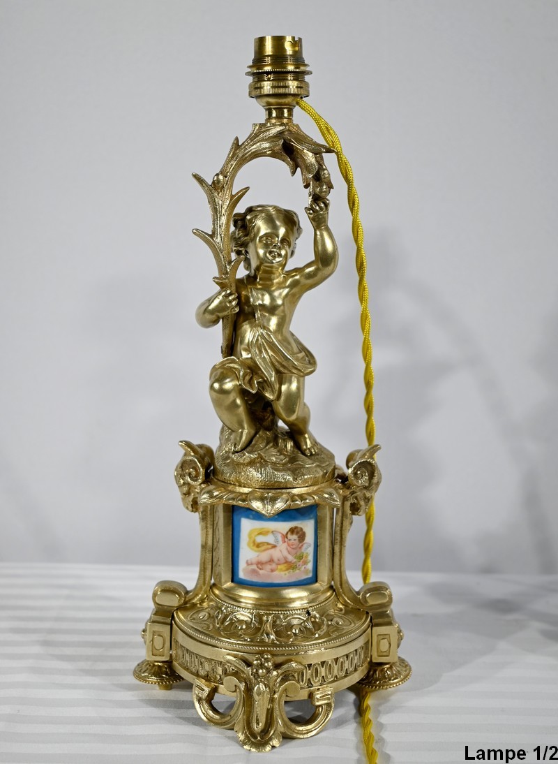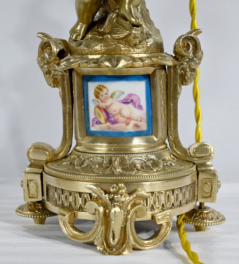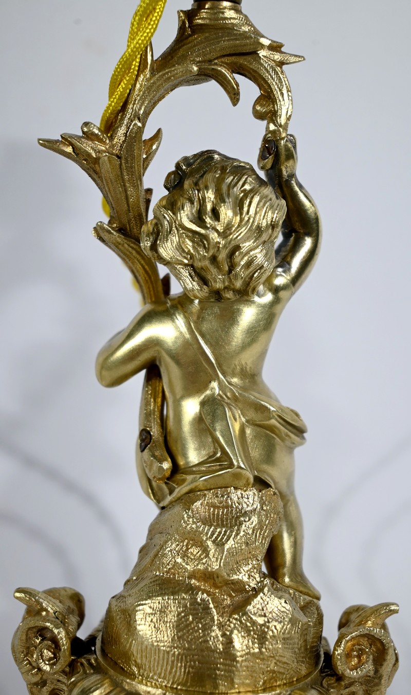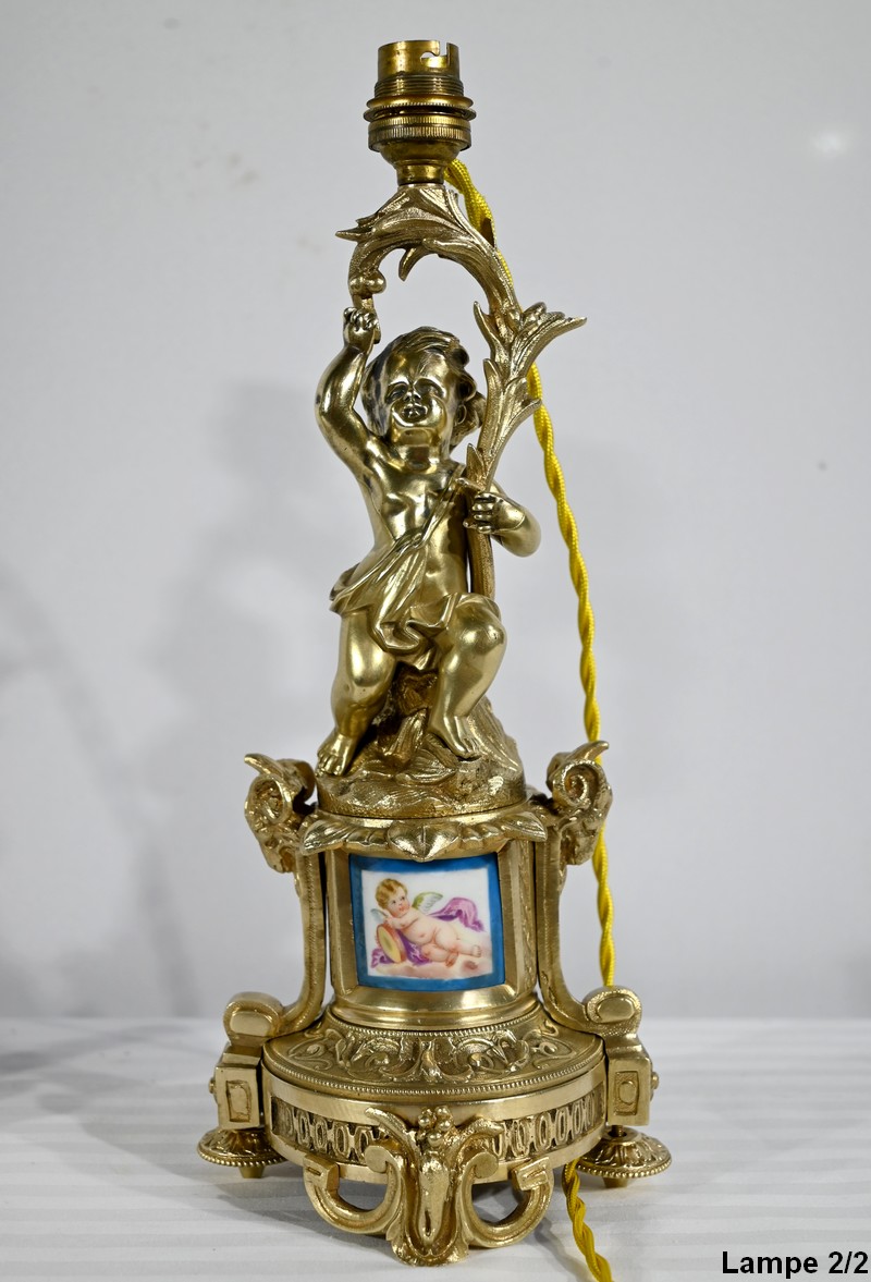 Ces anciens flambeaux, aujourd’hui électrifiés, figurent d’importantes sculptures d’anges tenant dans leurs mains des rameaux d’arbre fruitier. Chaque angelot repose sur un piédestal à décors de feuilles, de volutes, de têtes de bélier et ornés de portraits de chérubins en porcelaine de Sèvres.