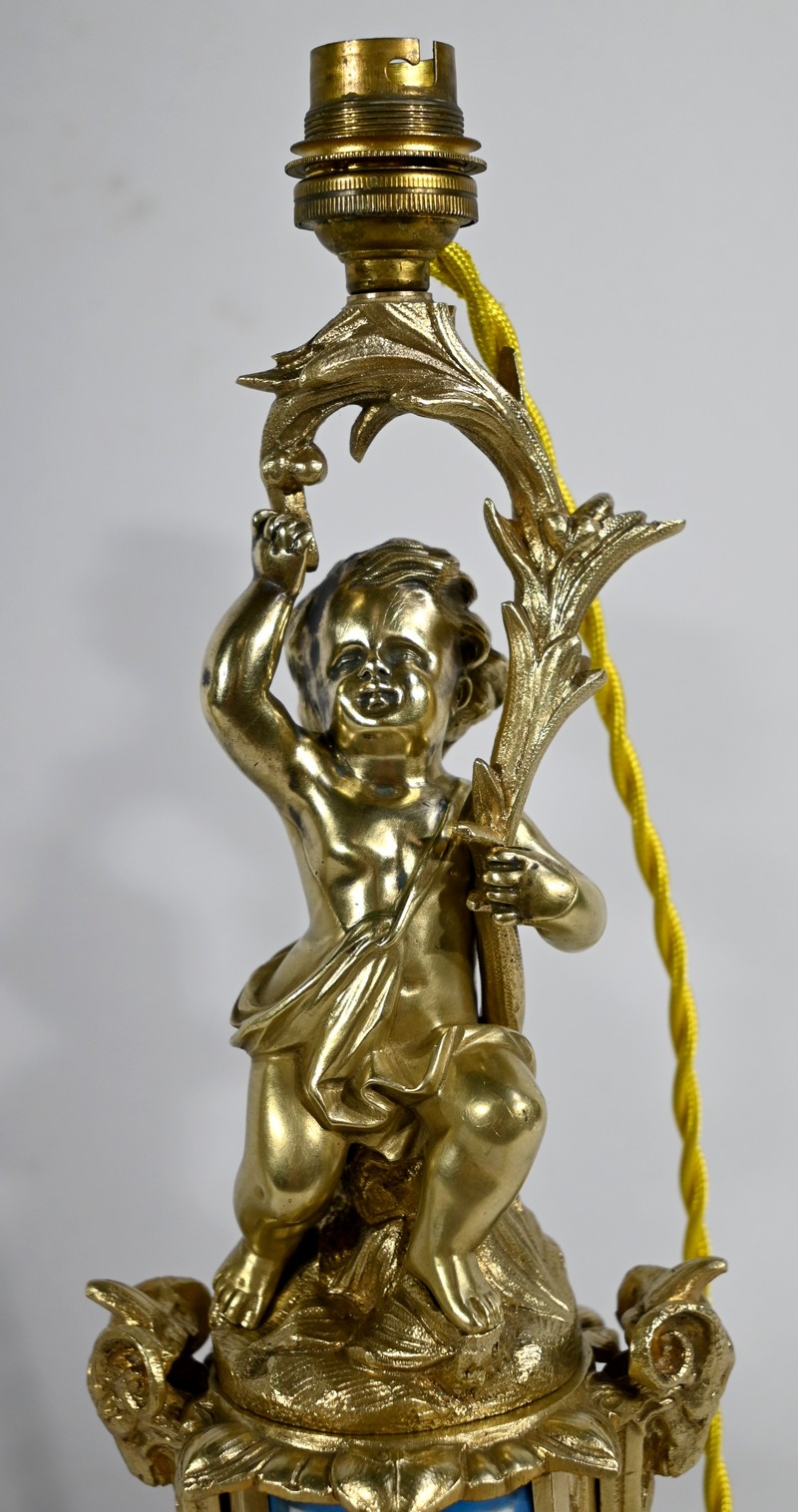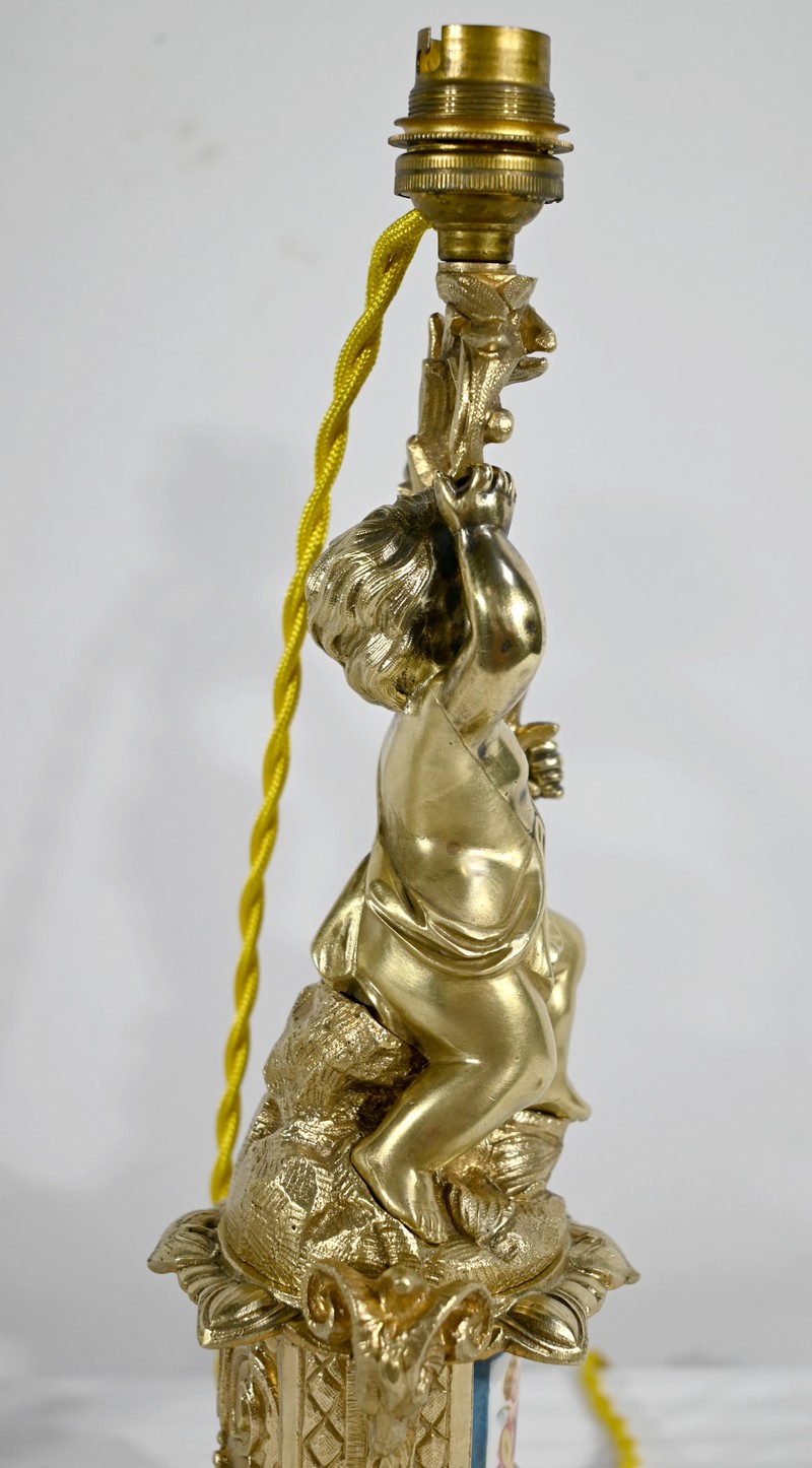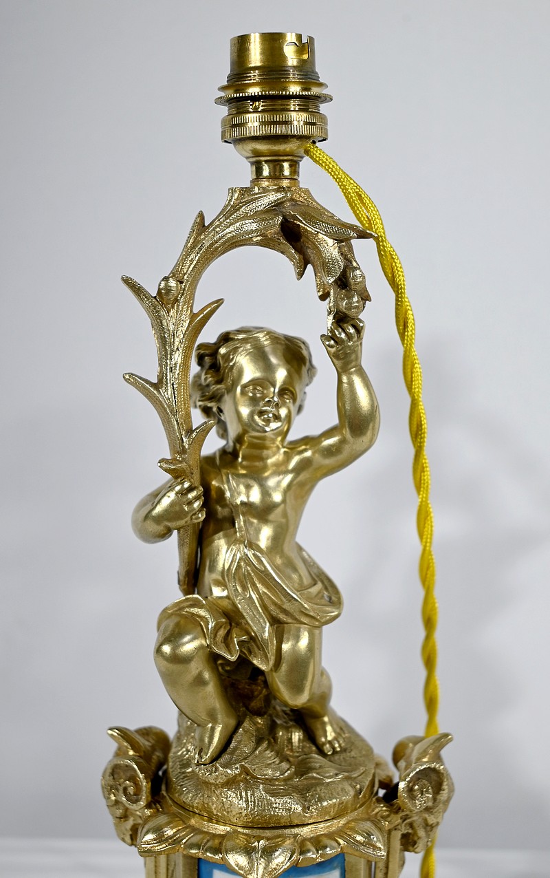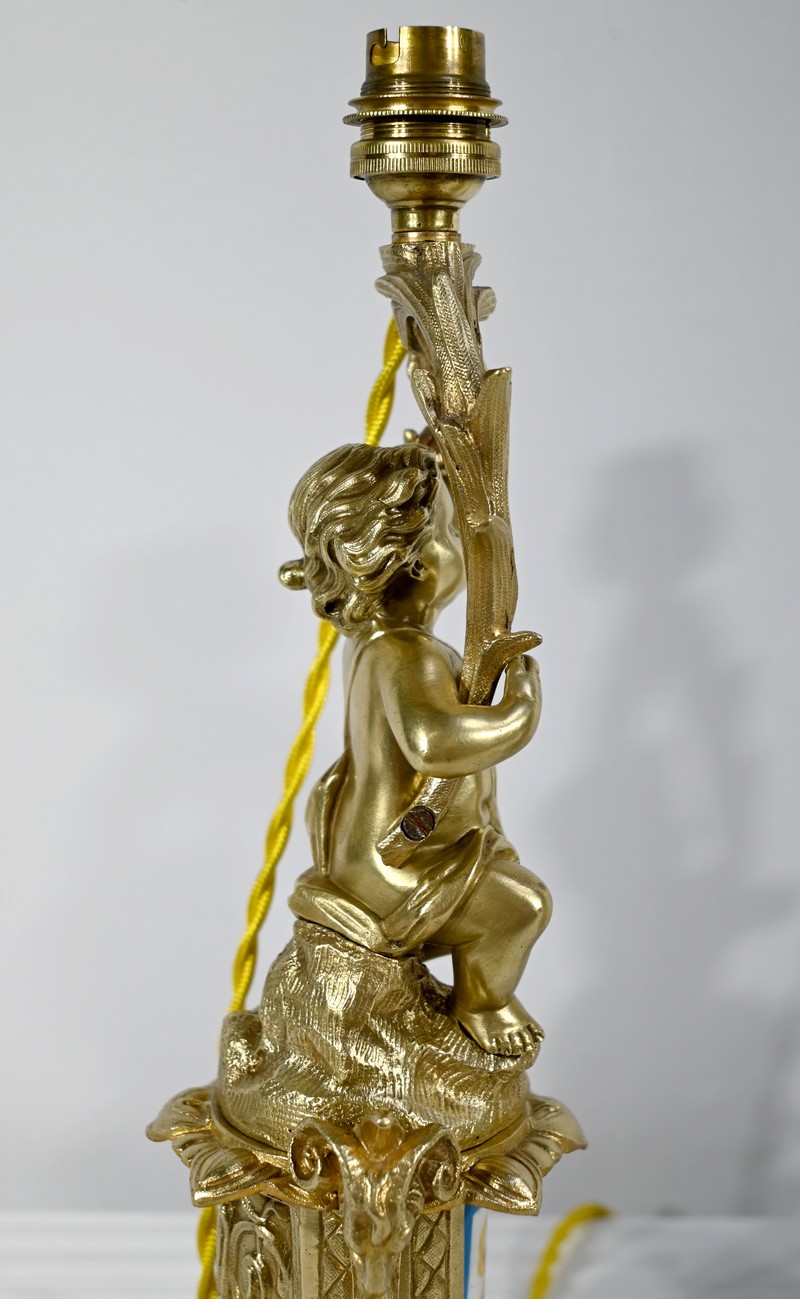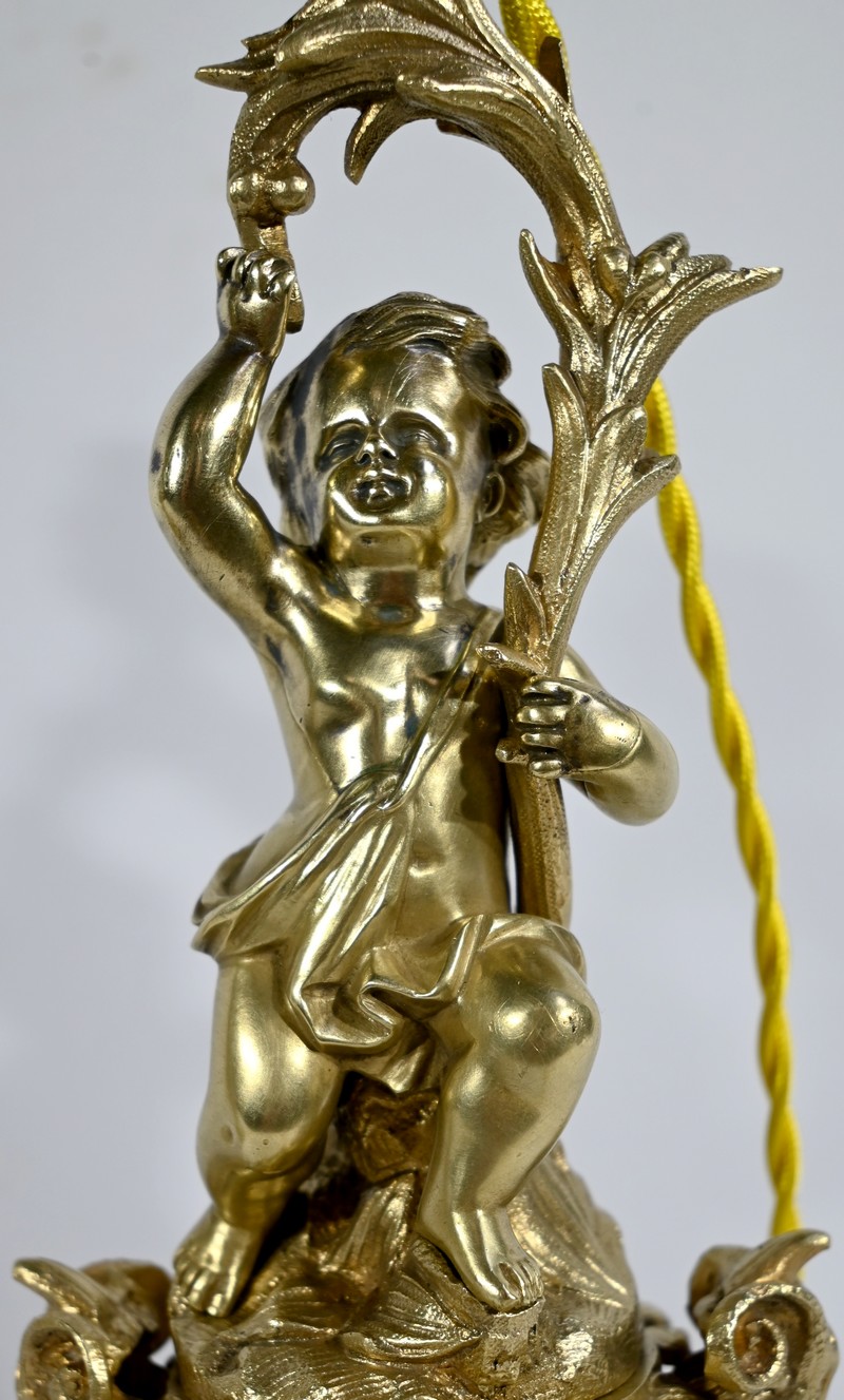 Ces anciens flambeaux, aujourd’hui électrifiés, figurent d’importantes sculptures d’anges tenant dans leurs mains des rameaux d’arbre fruitier. Chaque angelot repose sur un piédestal à décors de feuilles, de volutes, de têtes de bélier et ornés de portraits de chérubins en porcelaine de Sèvres.