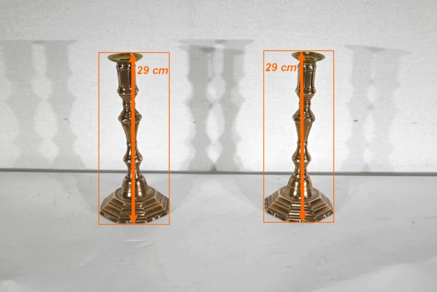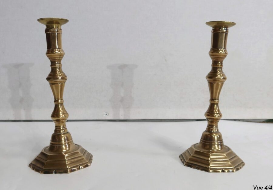 Ensemble de deux chandeliers en bronze sobrement dorés.