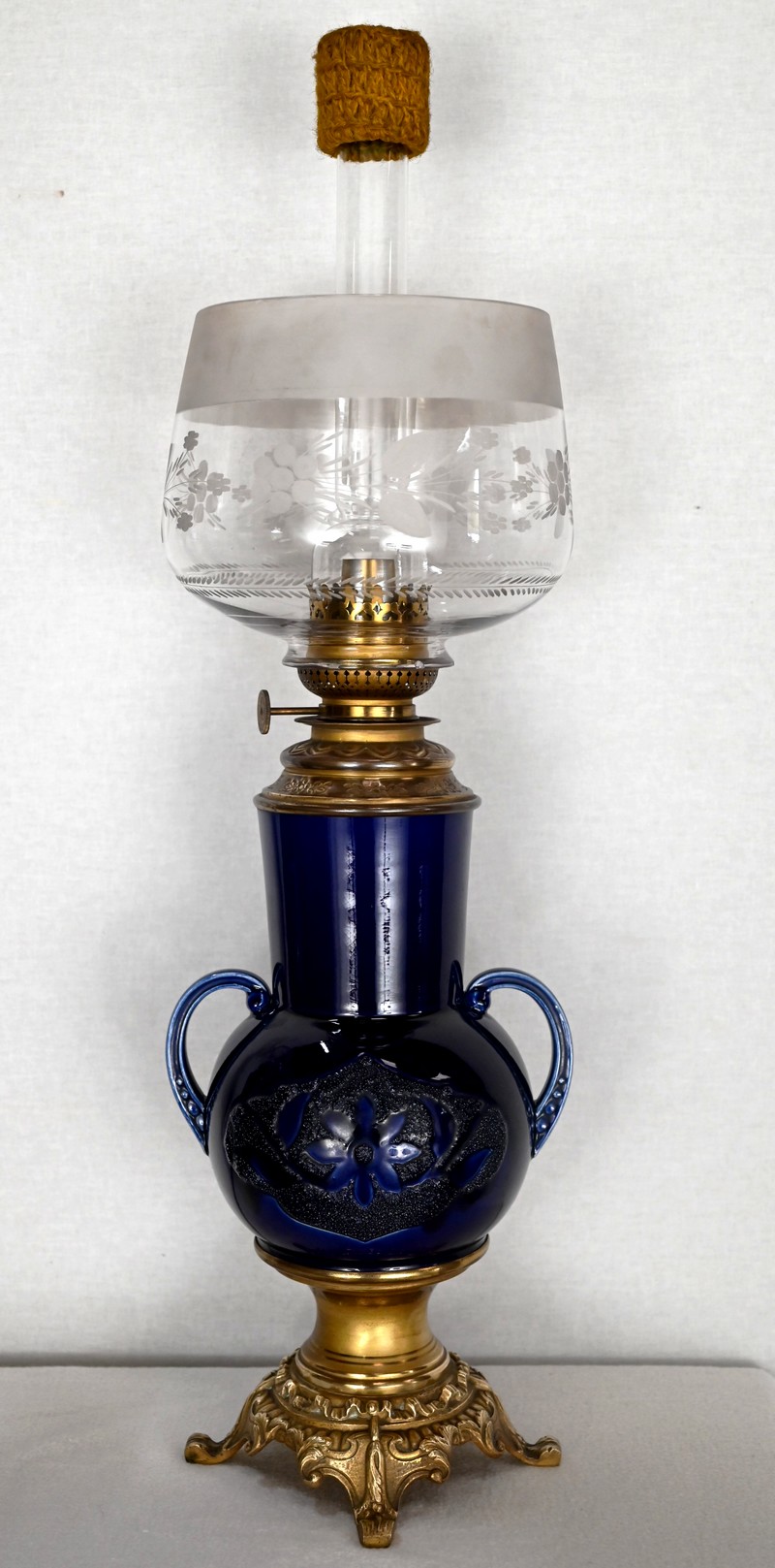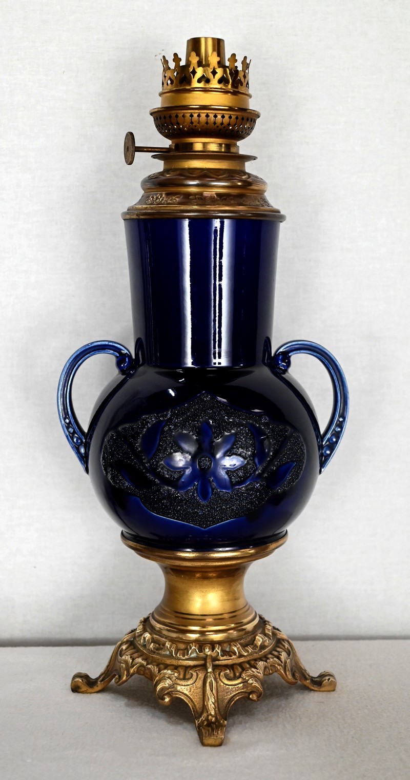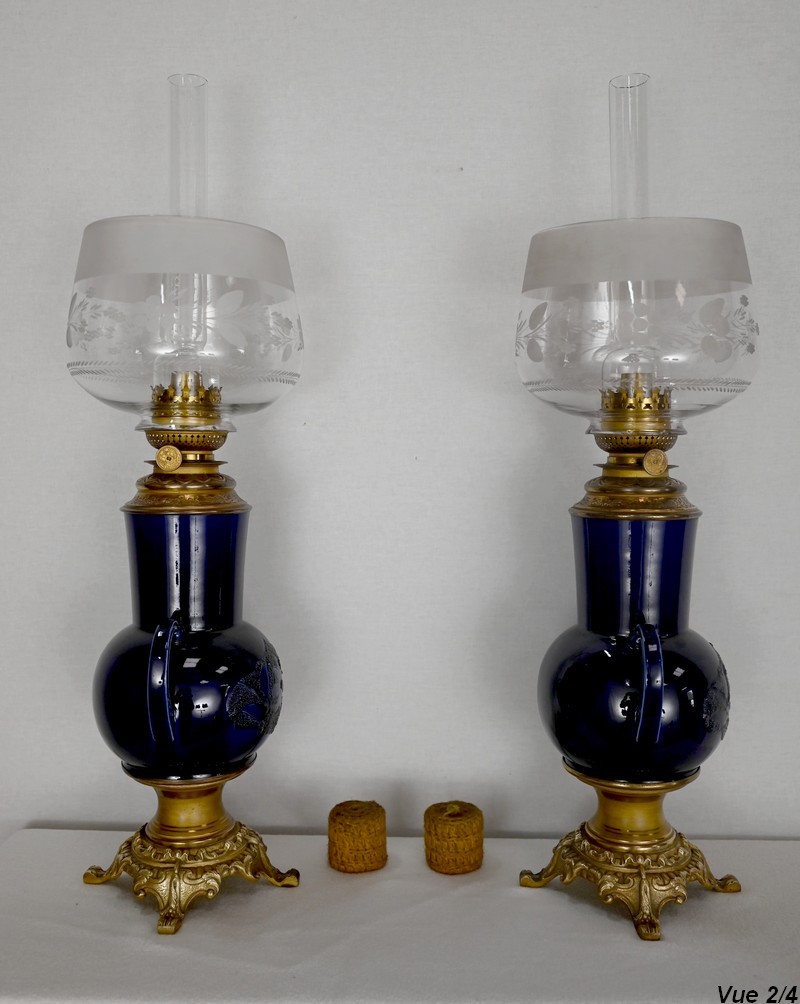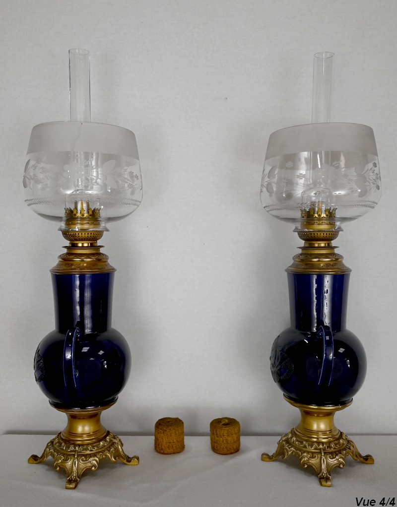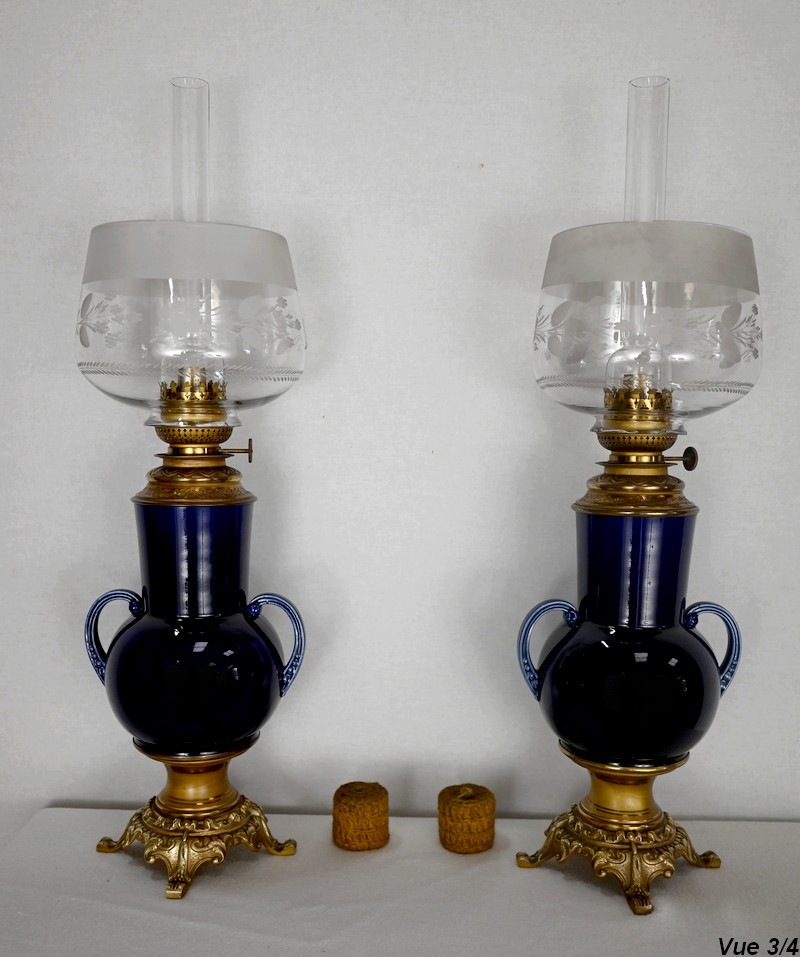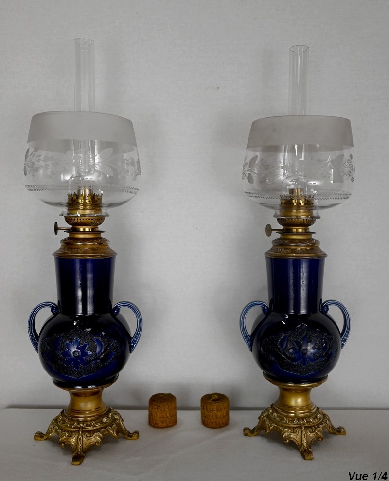 Lampes à pétrole en faïence bleue cobalt, agrémentées de bronze et ornées de globes d’origine à motifs de fleurs et de feuilles.