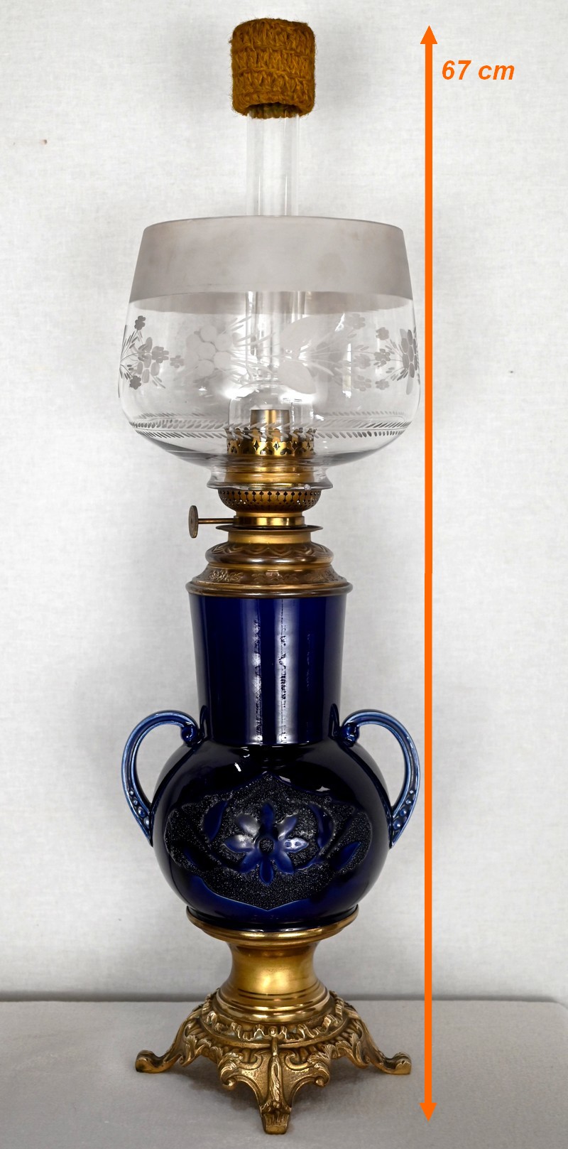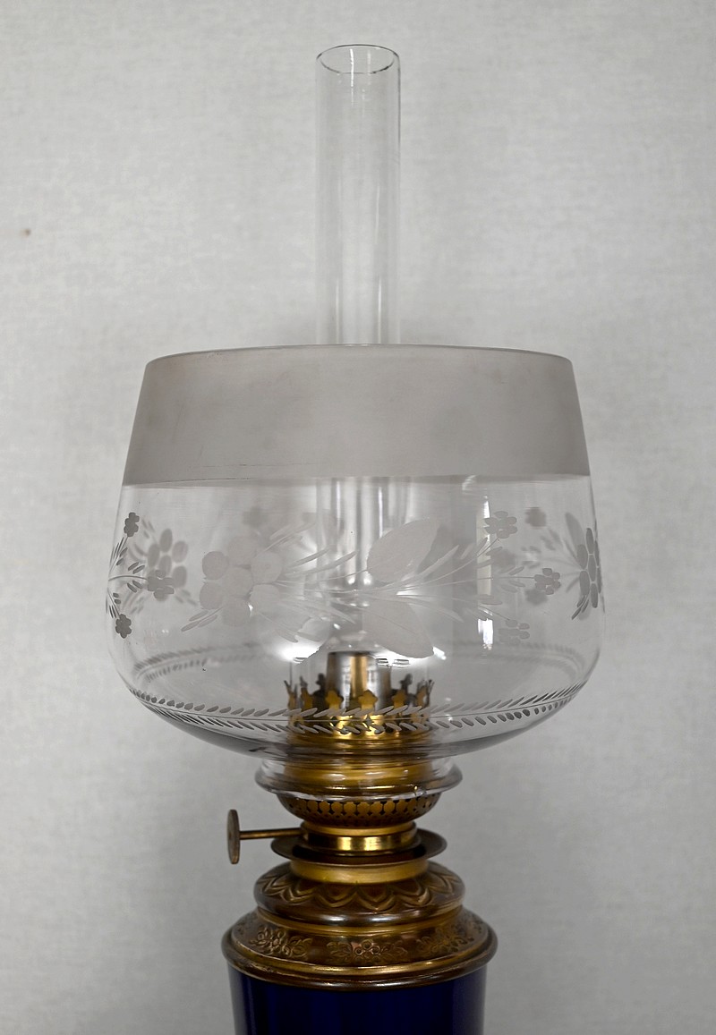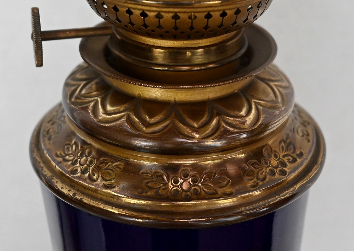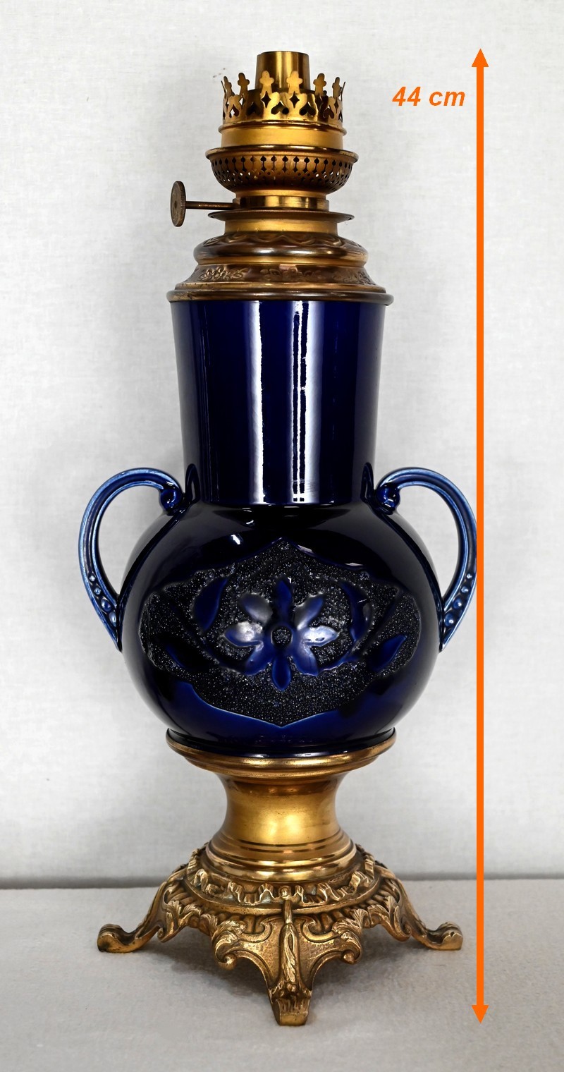 Lampes à pétrole en faïence bleue cobalt, agrémentées de bronze et ornées de globes d’origine à motifs de fleurs et de feuilles.