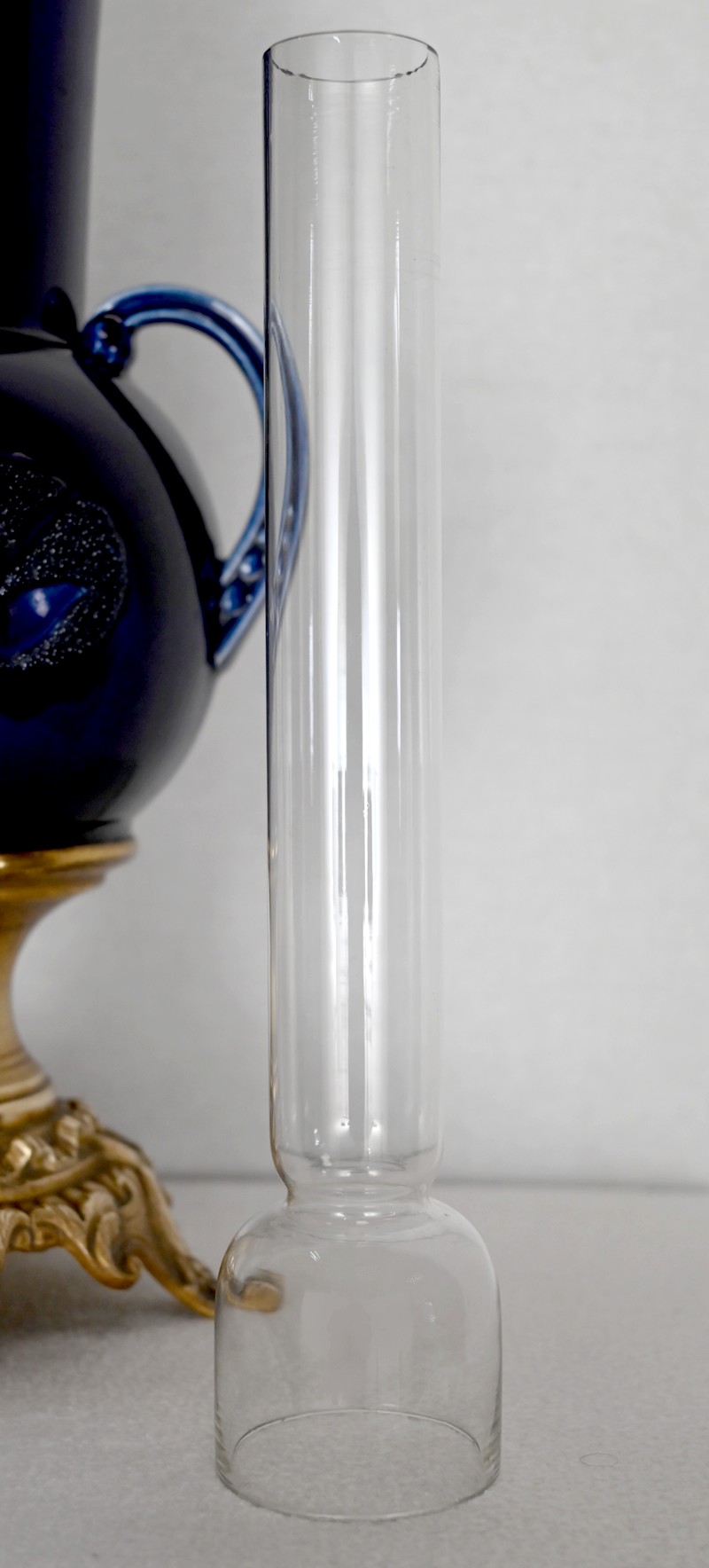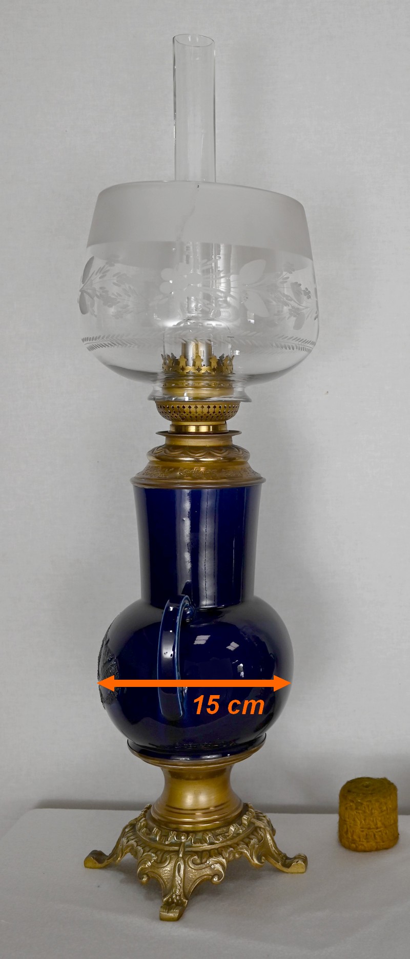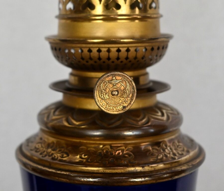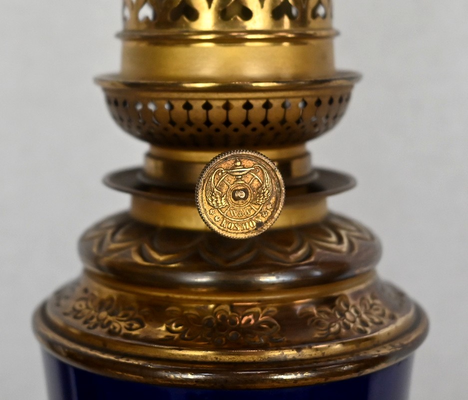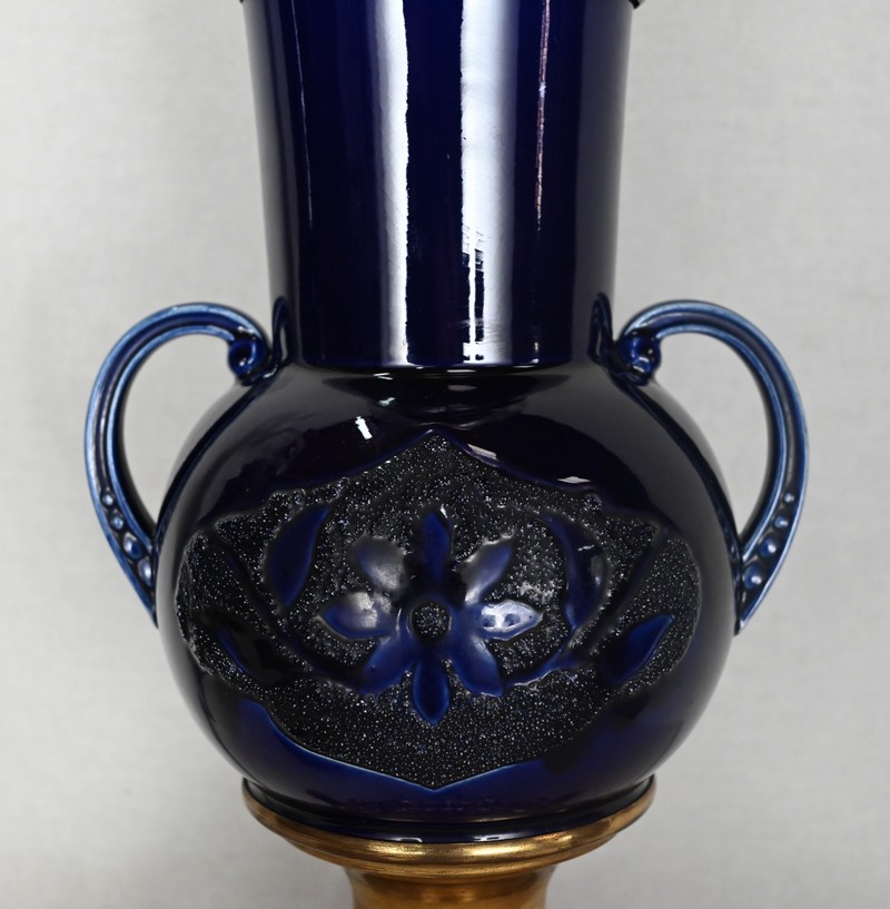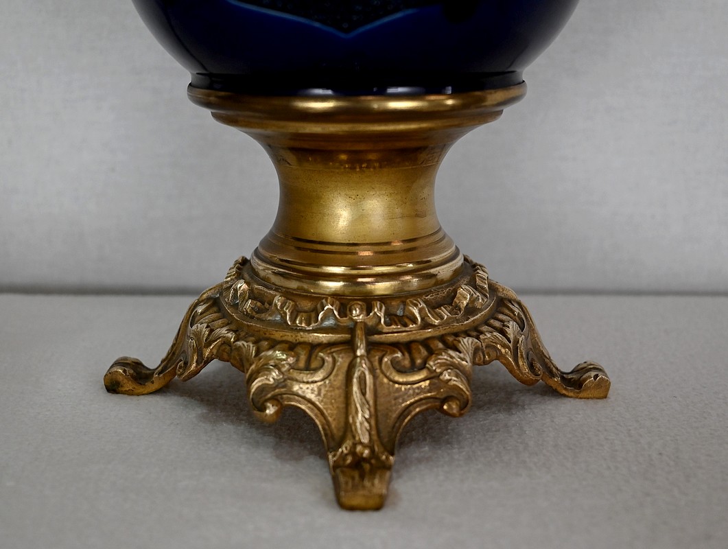 Lampes à pétrole en faïence bleue cobalt, agrémentées de bronze et ornées de globes d’origine à motifs de fleurs et de feuilles.