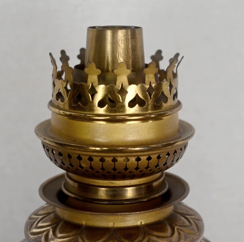 Une large collerette en bronze sculpté de fleurs compose le col de ces luminaires.