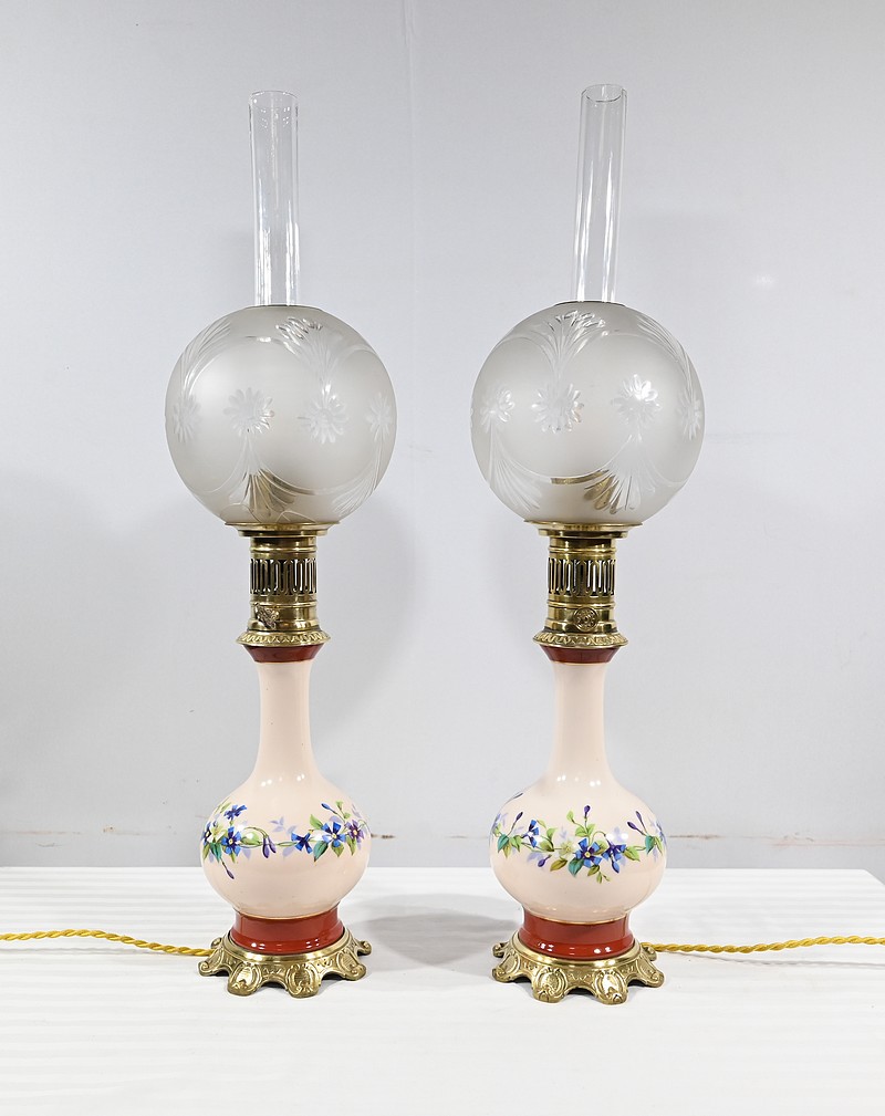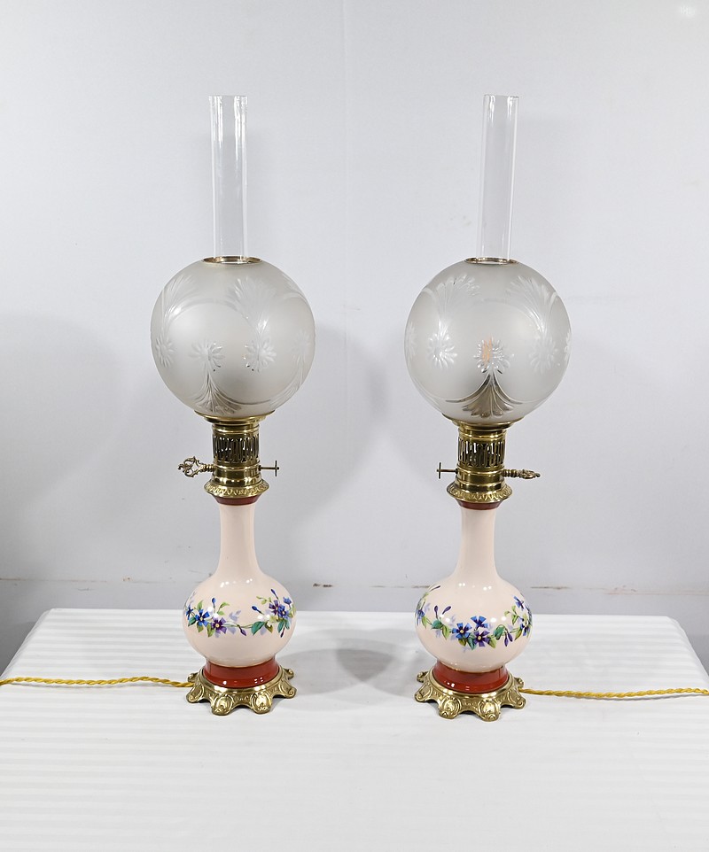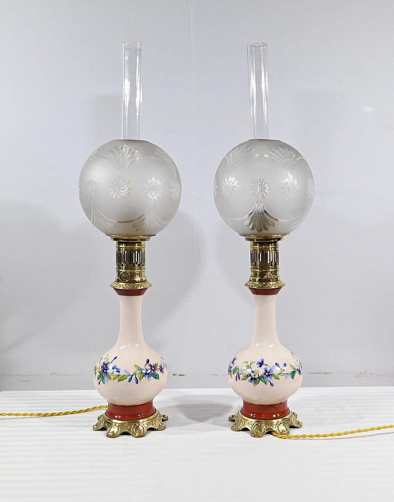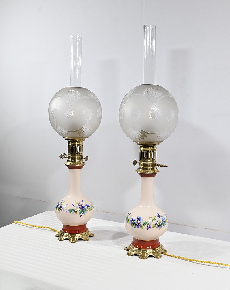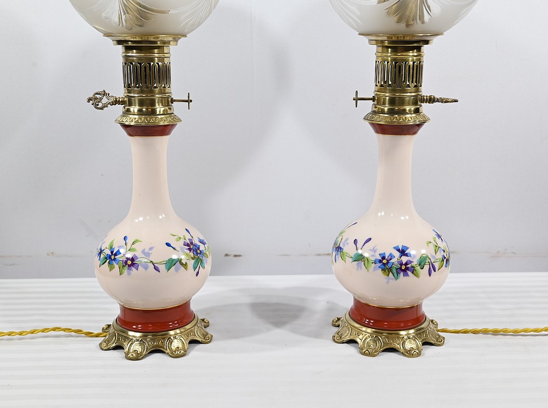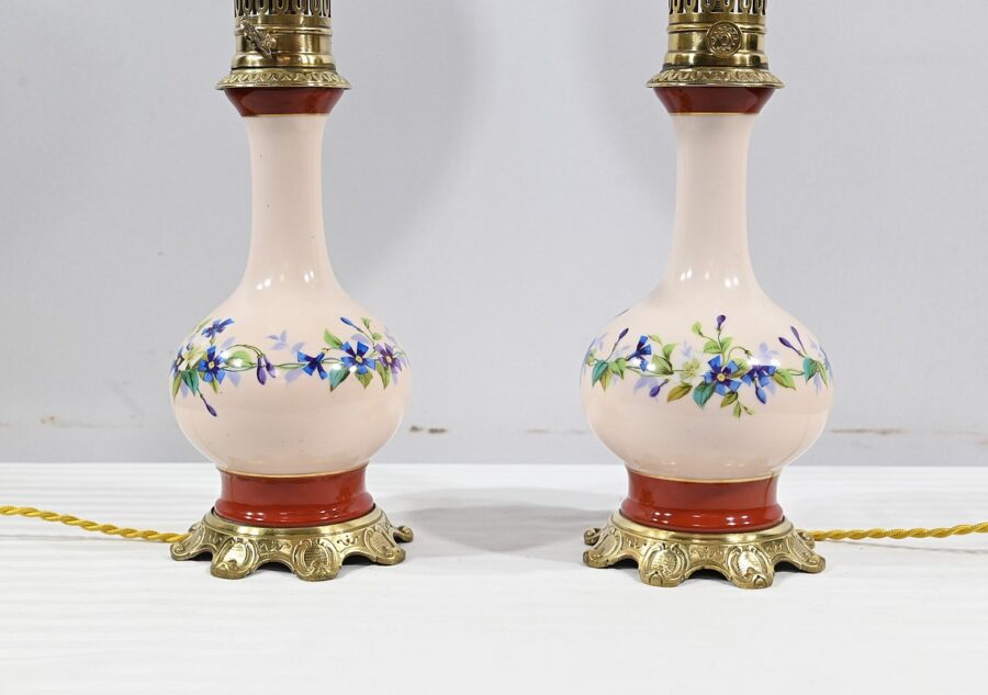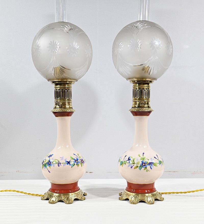 Paire de lampes à pétrole électrifiées datant de la fin du XIXe. Ces lampes en porcelaine beige et bordeaux, sont peintes de fleurettes bleues et violettes formant une guirlande végétale. Elles reposent sur un piétement voluté en bronze. Les cols en bronze ciselé supportent des globes en verre opaque, cerclés de laiton et gravés de motifs floraux stylisés.