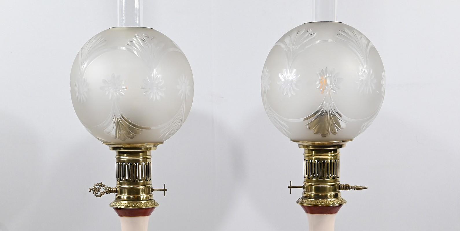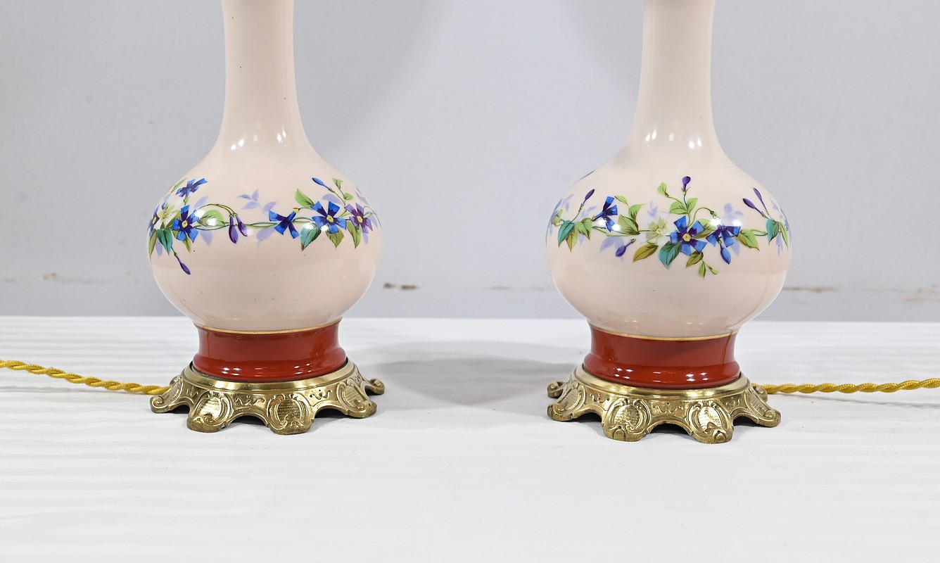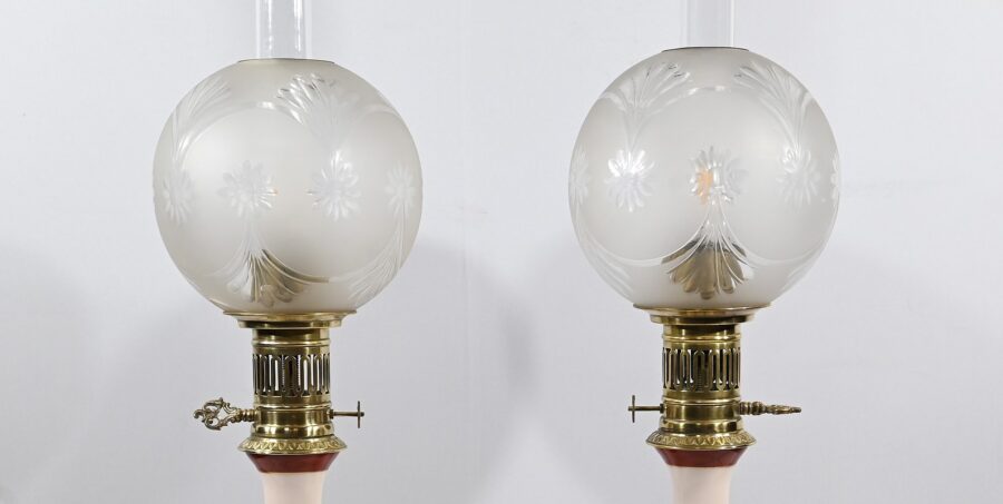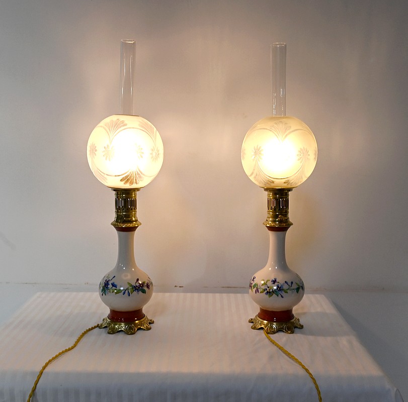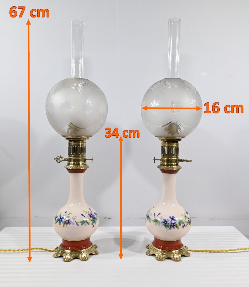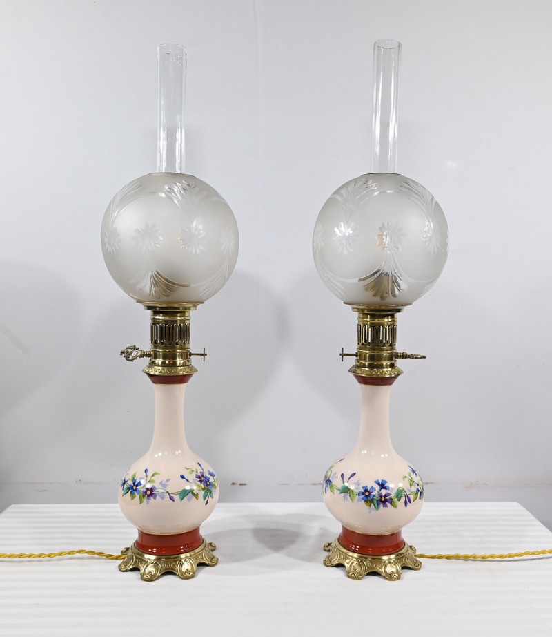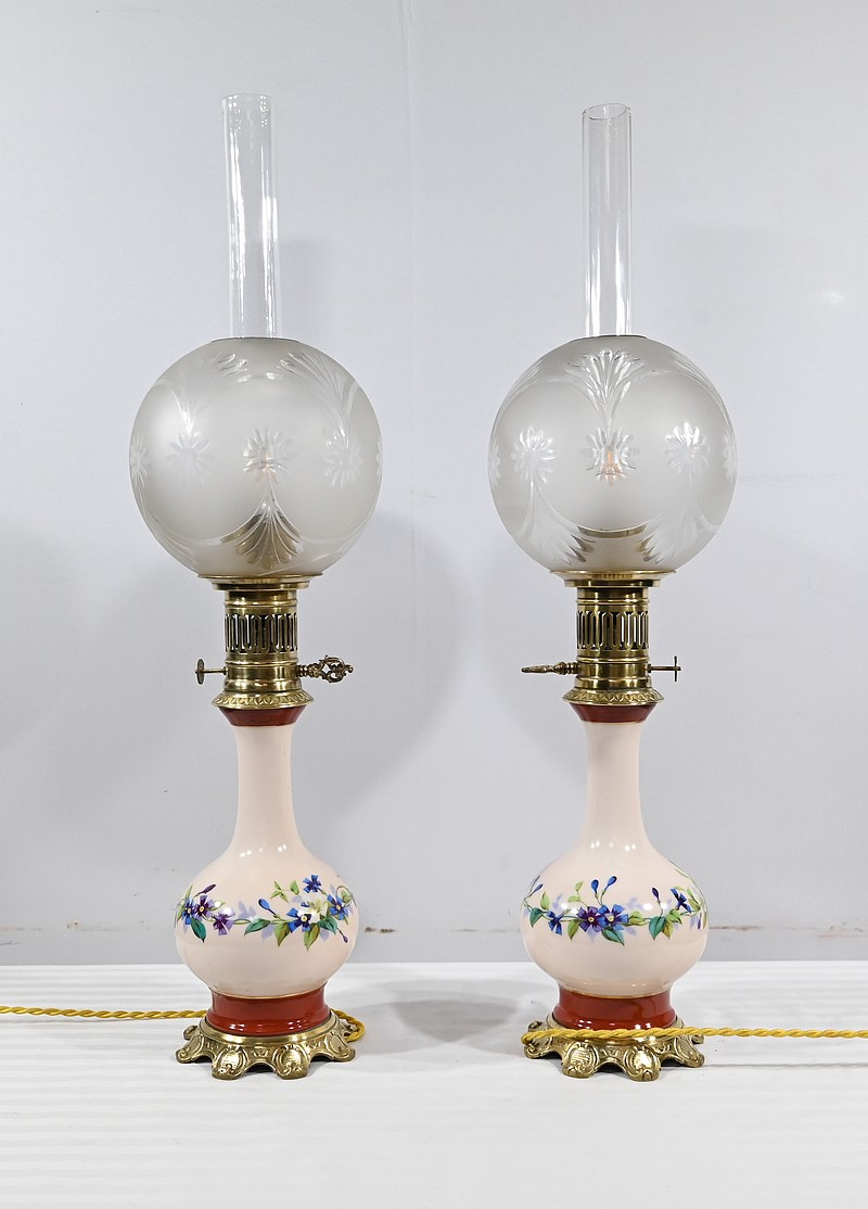 Paire de lampes à pétrole électrifiées datant de la fin du XIXe. Ces lampes en porcelaine beige et bordeaux, sont peintes de fleurettes bleues et violettes formant une guirlande végétale. Elles reposent sur un piétement voluté en bronze. Les cols en bronze ciselé supportent des globes en verre opaque, cerclés de laiton et gravés de motifs floraux stylisés.