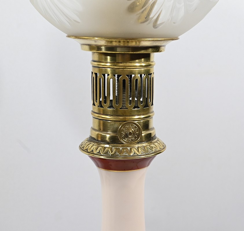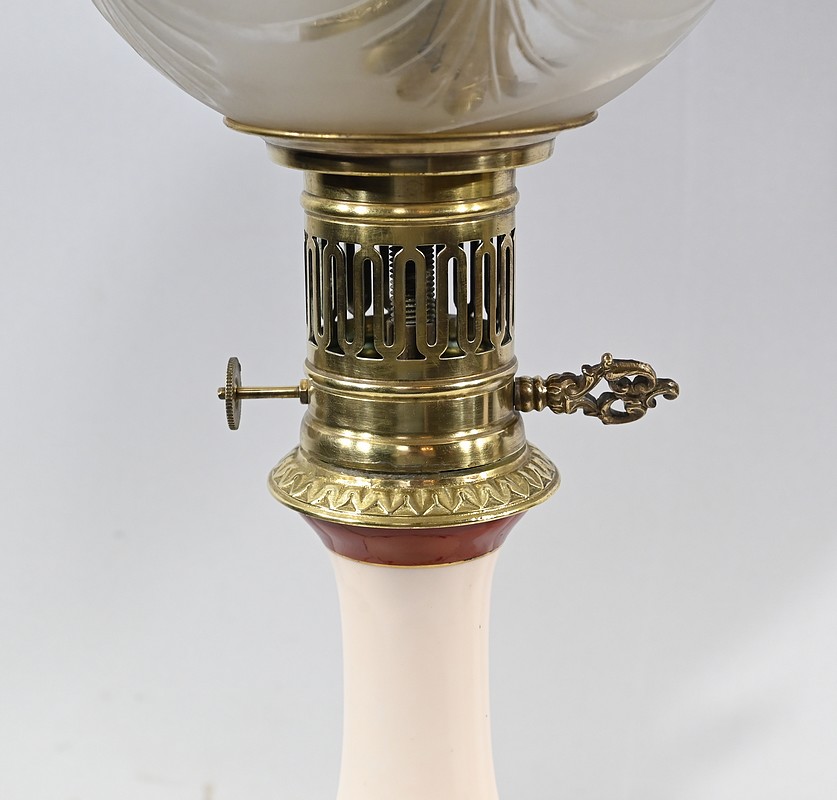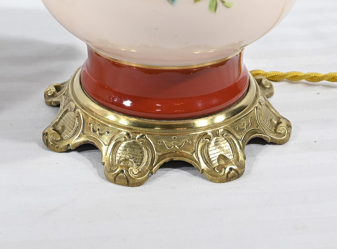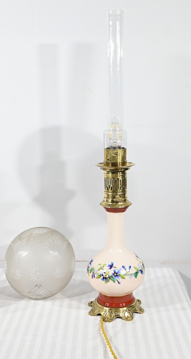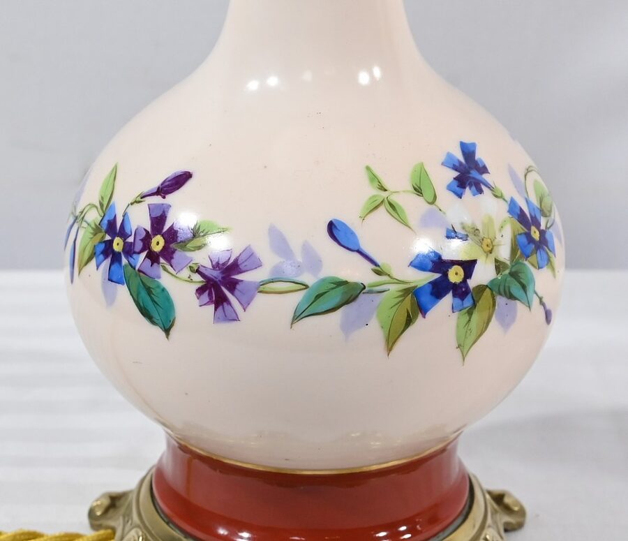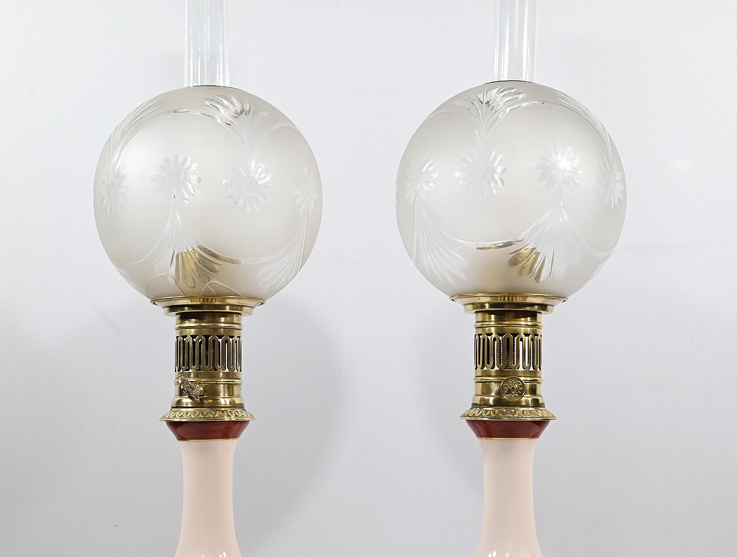 Paire de lampes à pétrole électrifiées datant de la fin du XIXe. Ces lampes en porcelaine beige et bordeaux, sont peintes de fleurettes bleues et violettes formant une guirlande végétale. Elles reposent sur un piétement voluté en bronze. Les cols en bronze ciselé supportent des globes en verre opaque, cerclés de laiton et gravés de motifs floraux stylisés.