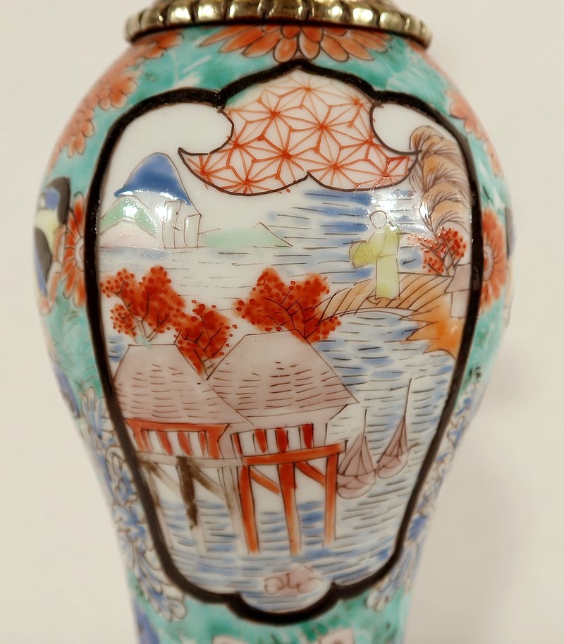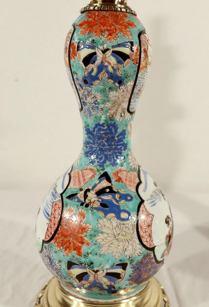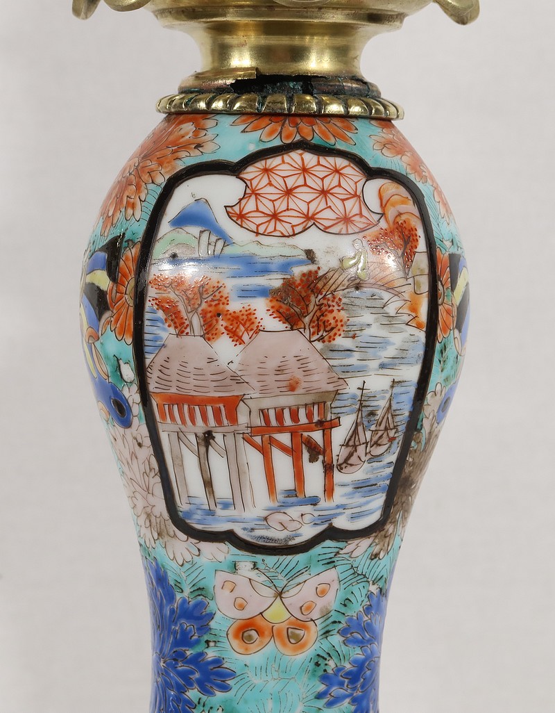 Ces lampes aux décors asiatiques, représentant des scènes de vie à la cour de l’empereur, sont peintes de fleurs et de papillons multicolores. Les tons intenses sont rehaussés pour certains de filets d’or.