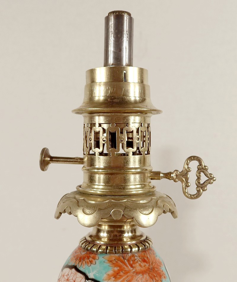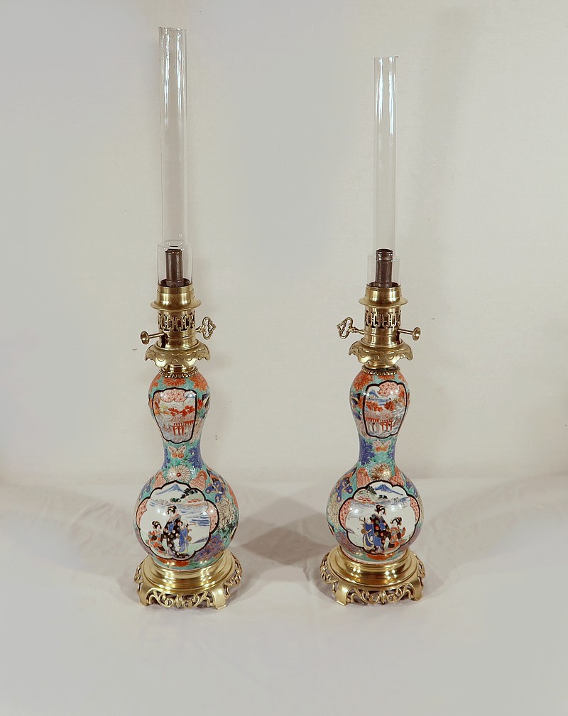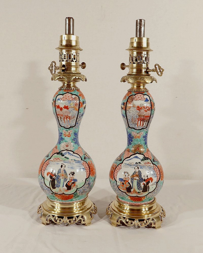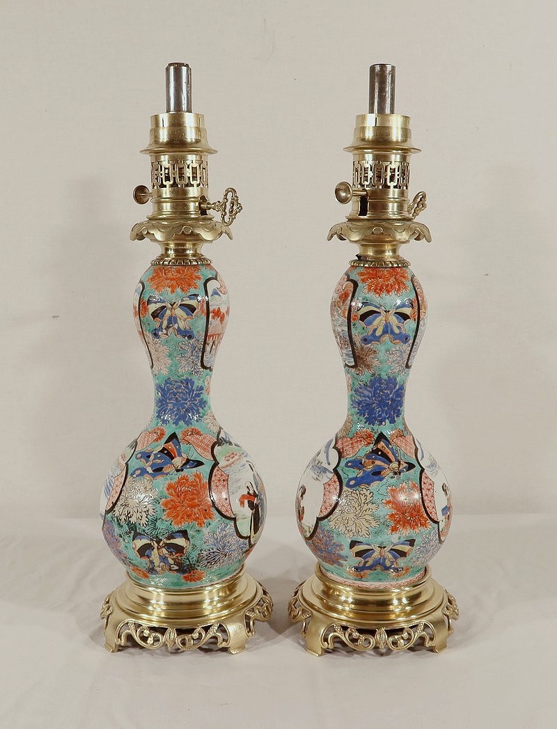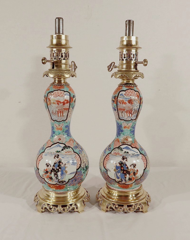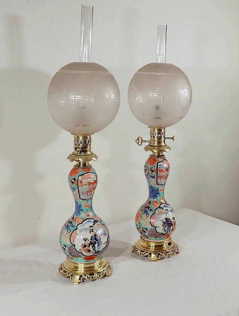 Belles lampes à pétrole datant de l’époque Napoléon III, réalisées en porcelaine japonaise et agrémentées de bronze.