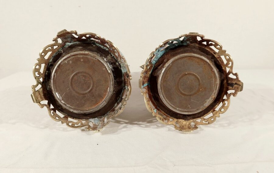 Elles sont sommées d’un globe Napoléon III d’origine en verre blanc mat souligné de gravures dans le style gréco-romain. Une de ces sphères présente des éclats recollés