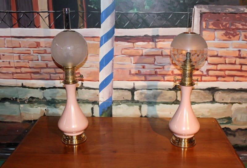 Paire de lampes à pétrole NAPOLÉON III en porcelaine rose sur socle en laiton. Globes anciens. Époque : seconde moitié du XIXe.